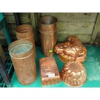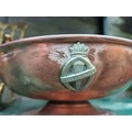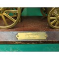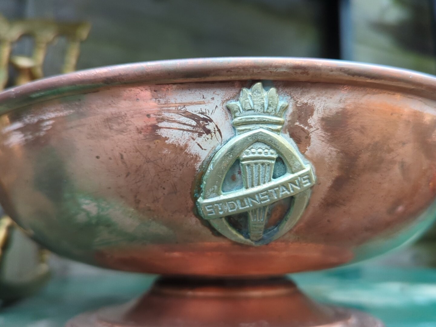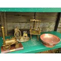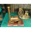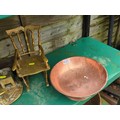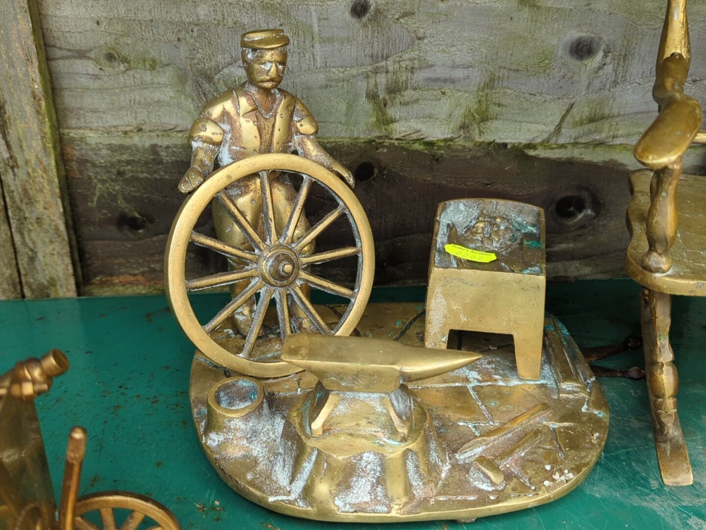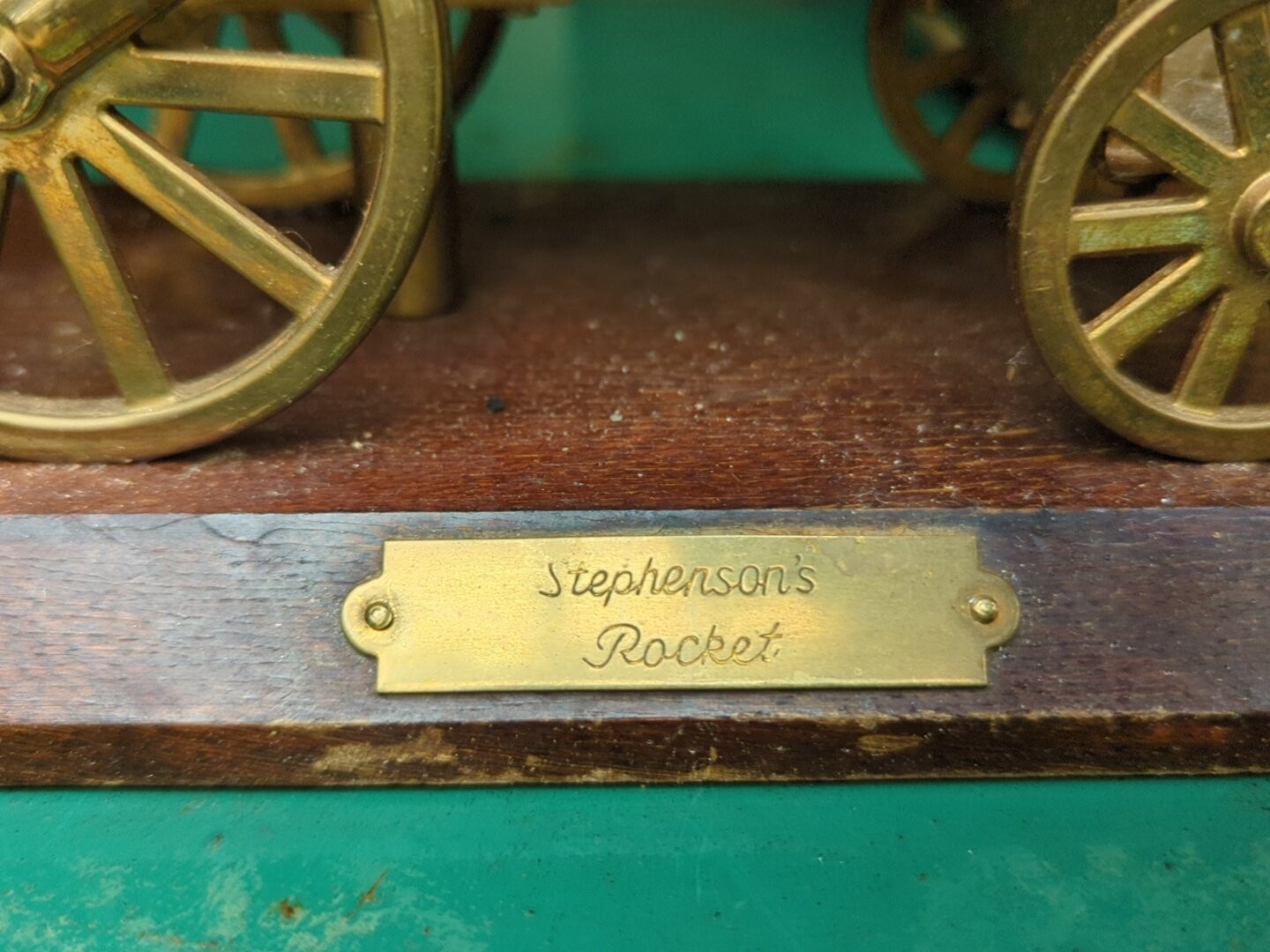 A group of decorative metal models comprising a brass locomotive on wood plinth titled ‘Stephenson’s Rocket’, a cast-metal blacksmith’s forge group, a miniature spindle-back chair, and a copper pedestal bowl applied with ‘St Dunstan’ badge.