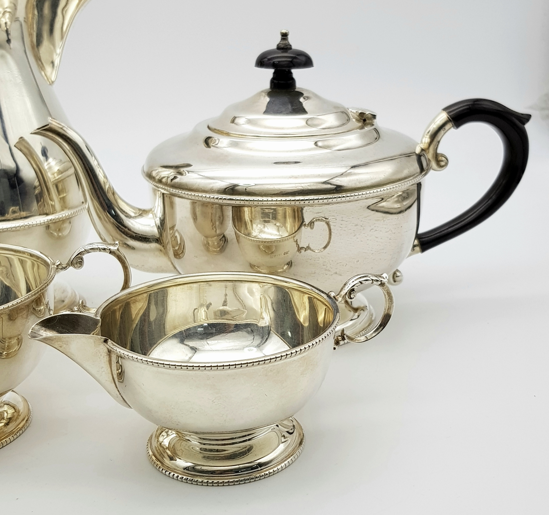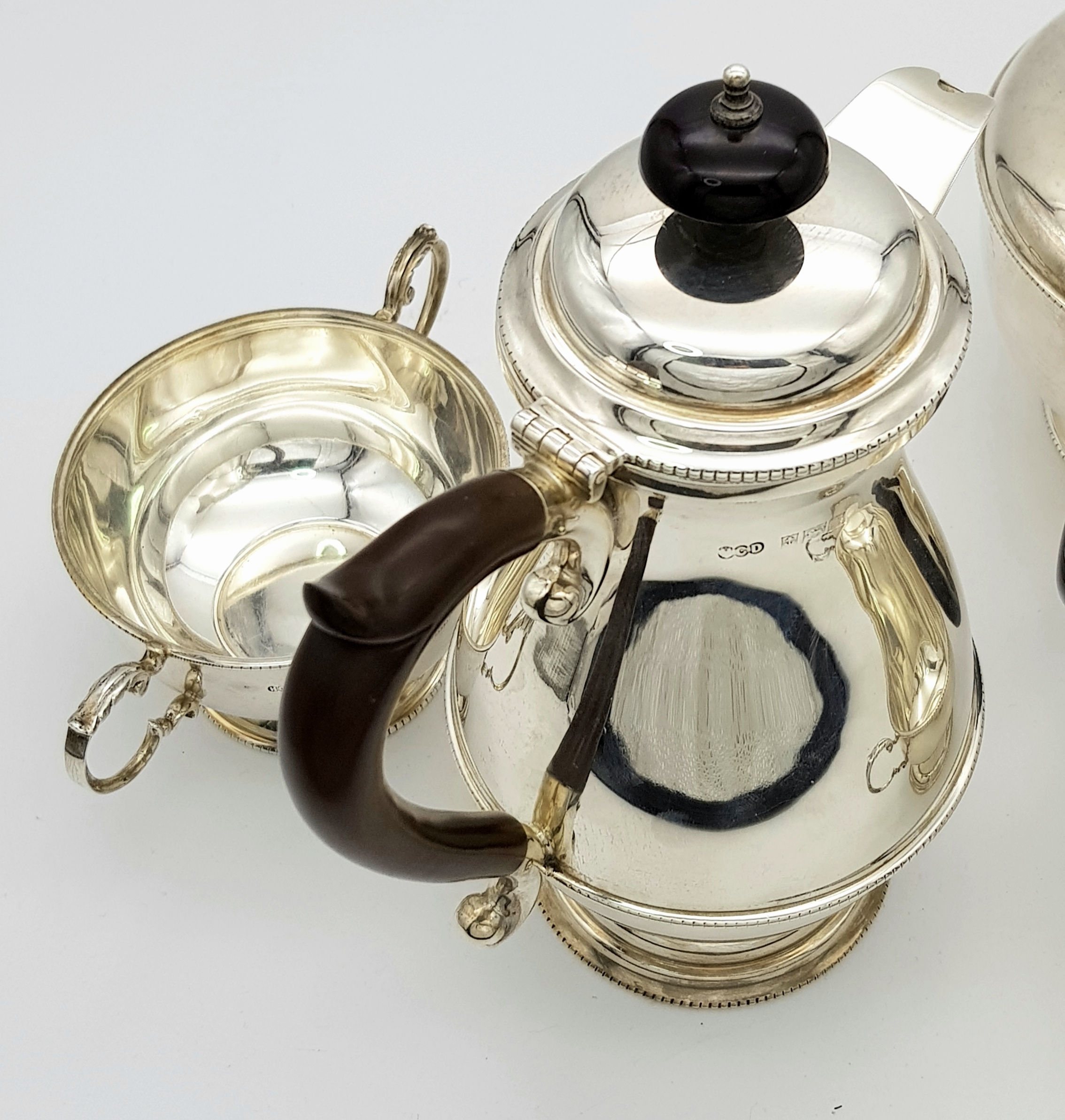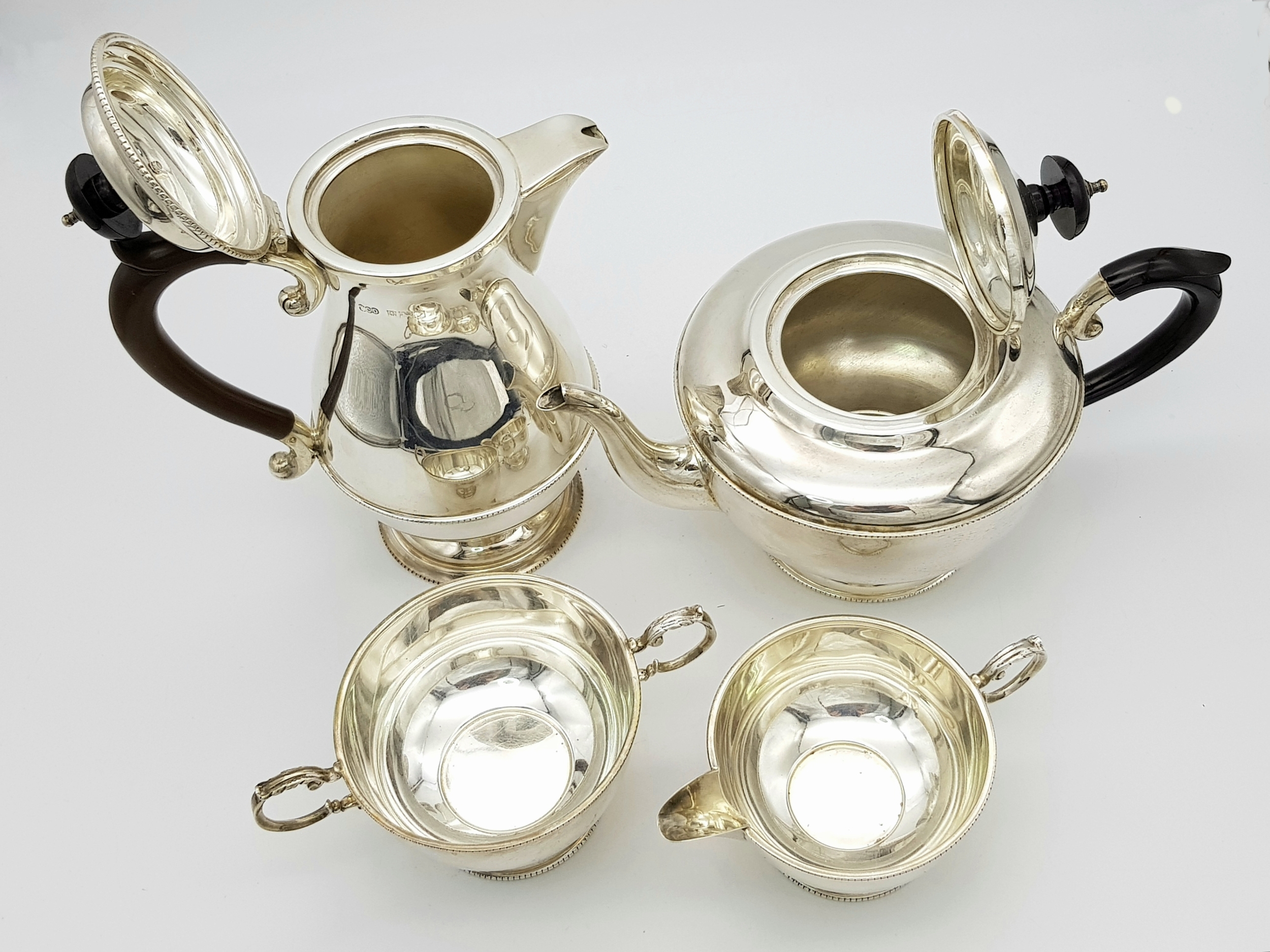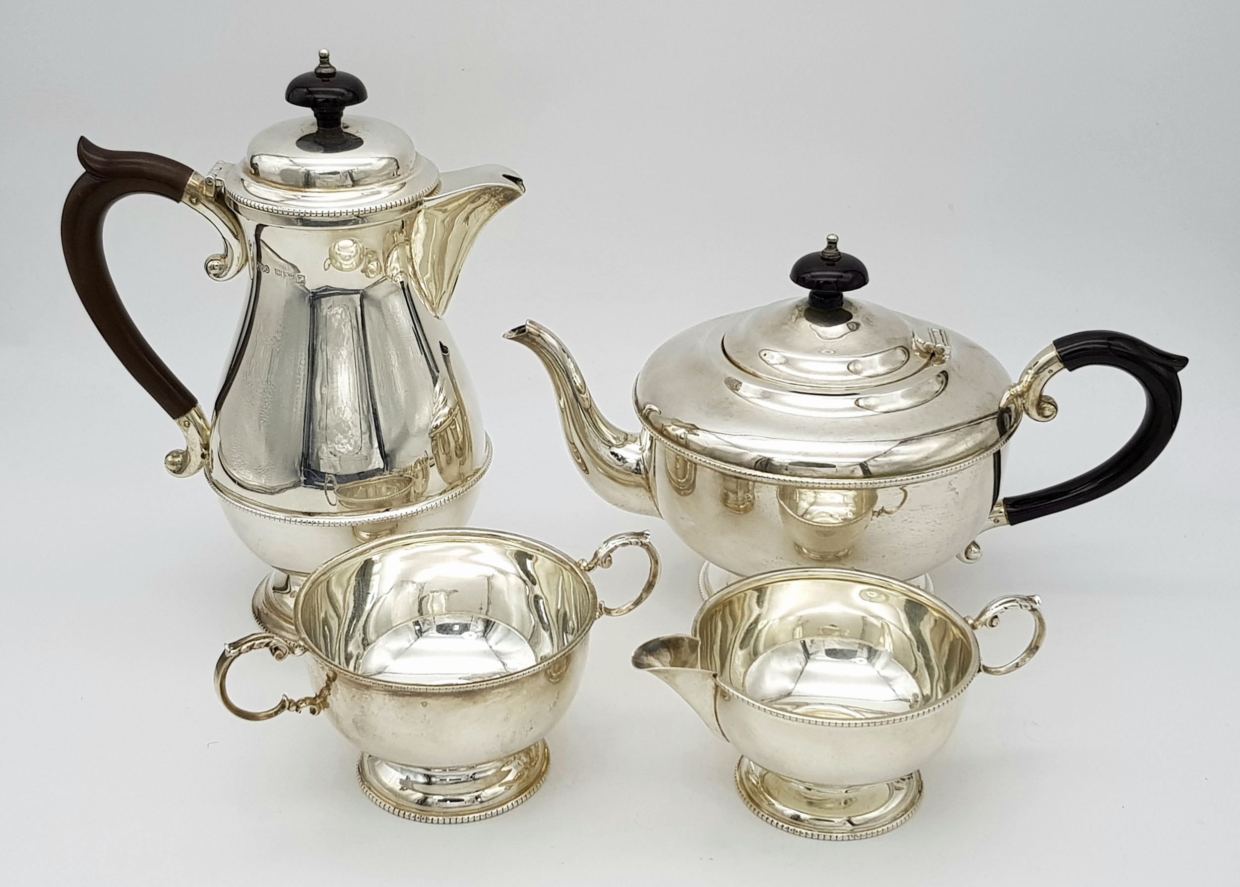 A Vintage Henry Clifford Davis 1958 Sterling Silver Tea and Coffee Set. Teapot, coffee pot, creamer jug and sugar bowl. 1010g total weight. coffee pot - 21cm tall. Teapot - 14cm tall, 24cm length. Sugar bowl, 15 x 7cm. Milk jug, 13 x 6cm.