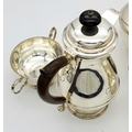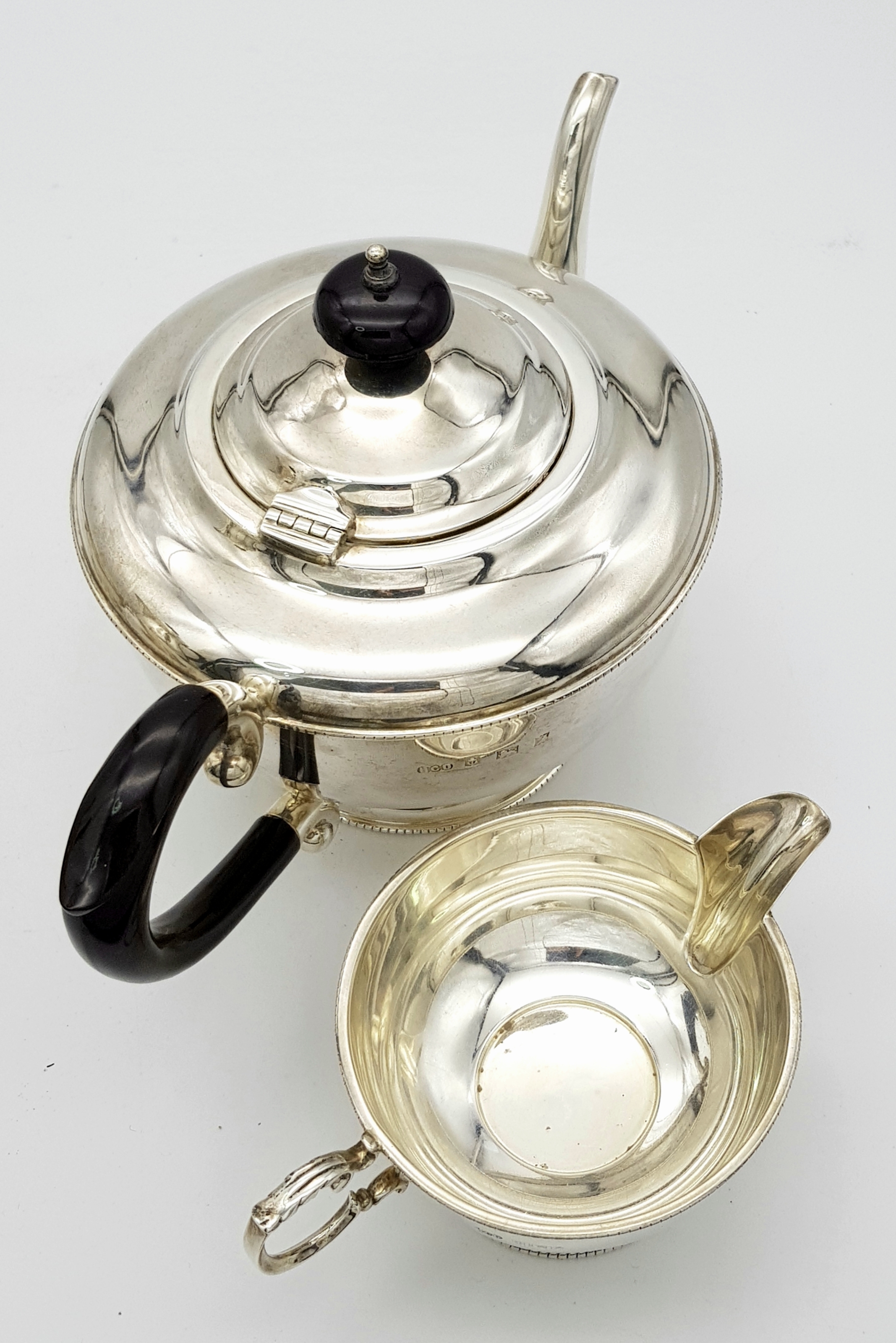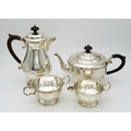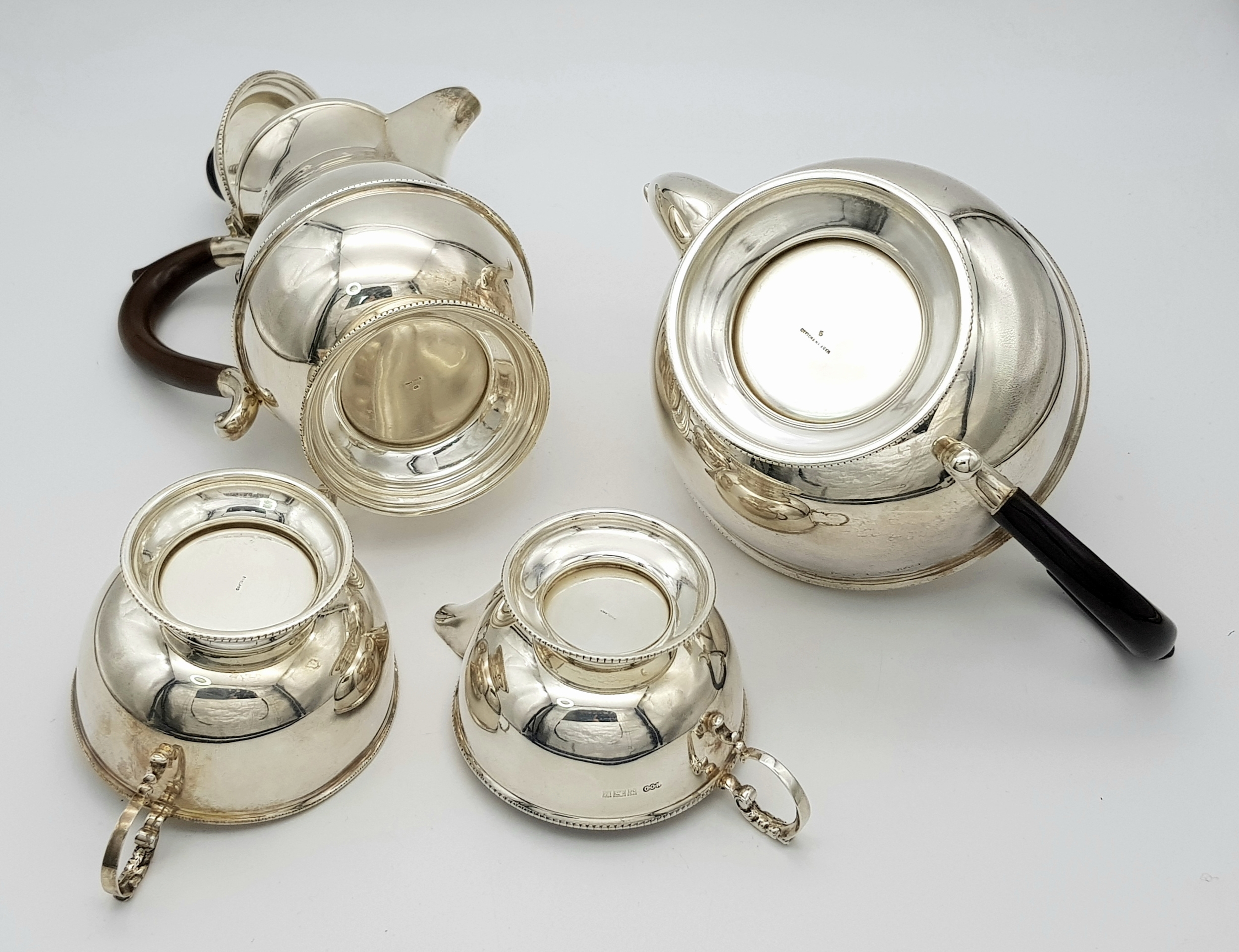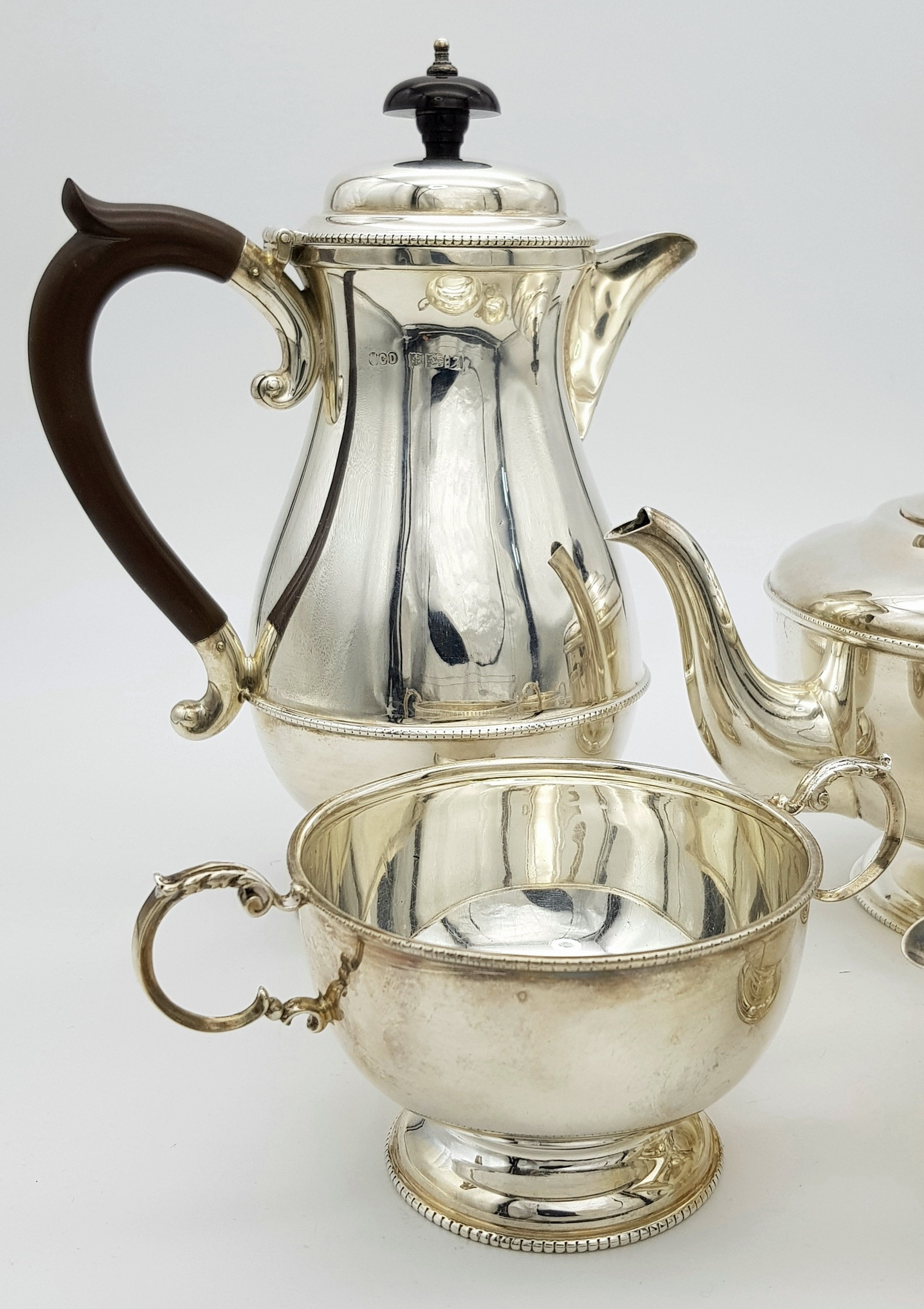 A Vintage Henry Clifford Davis 1958 Sterling Silver Tea and Coffee Set. Teapot, coffee pot, creamer jug and sugar bowl. 1010g total weight. coffee pot - 21cm tall. Teapot - 14cm tall, 24cm length. Sugar bowl, 15 x 7cm. Milk jug, 13 x 6cm.