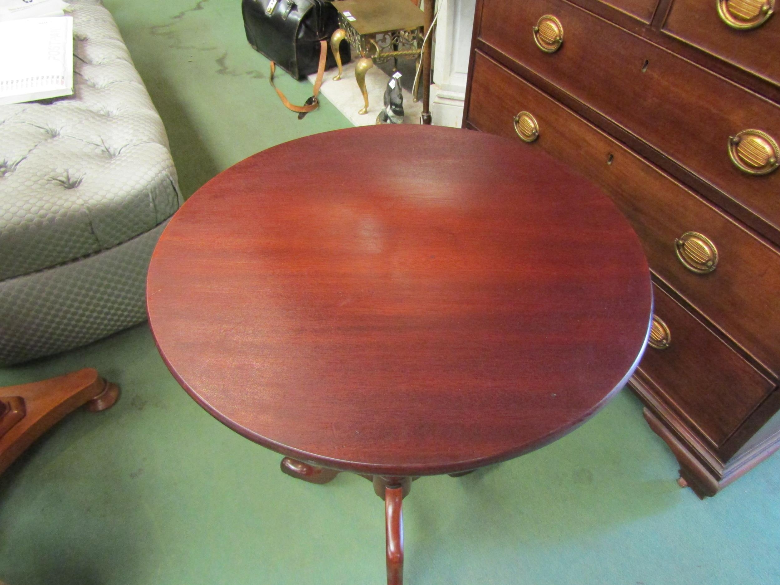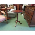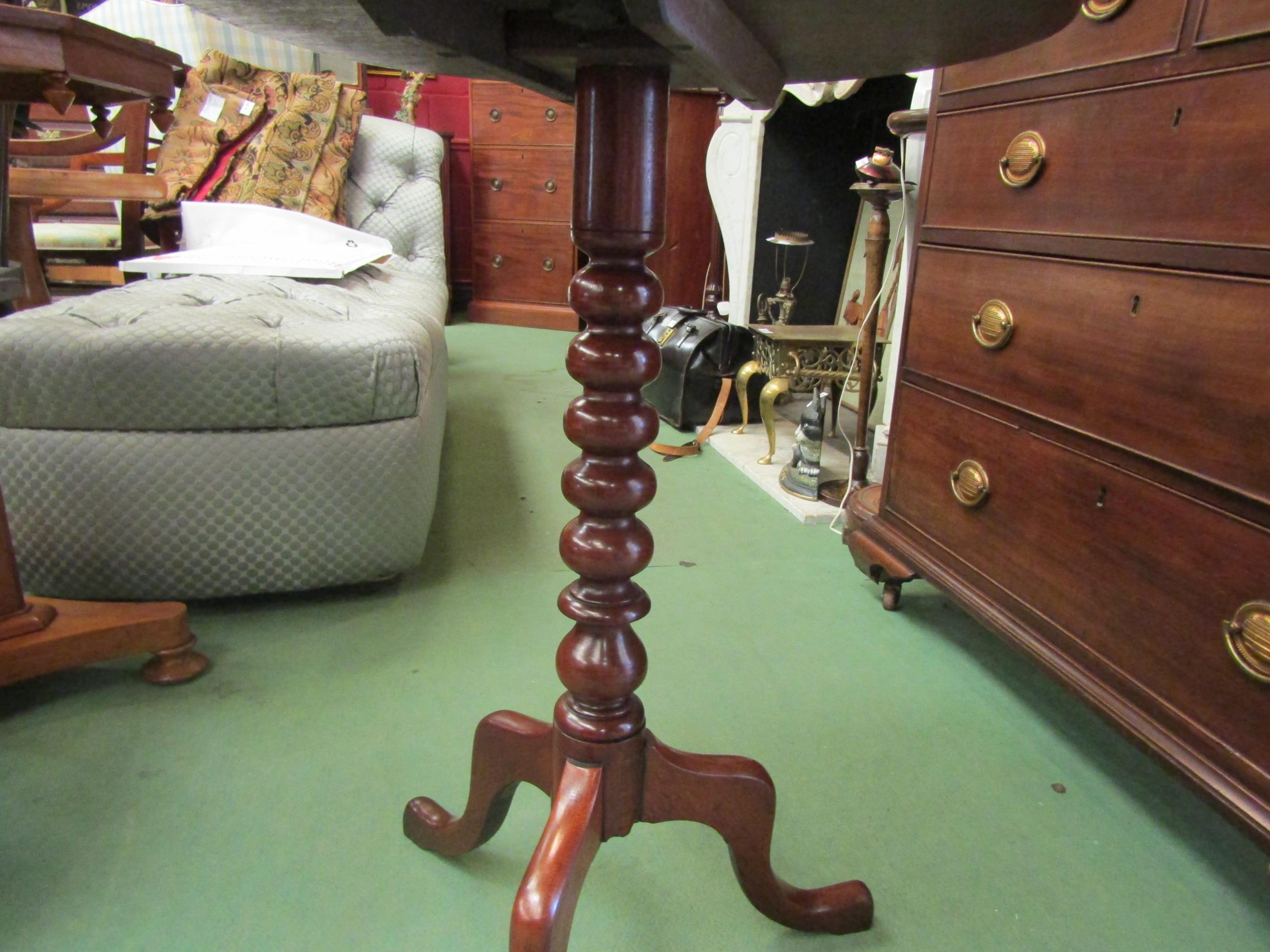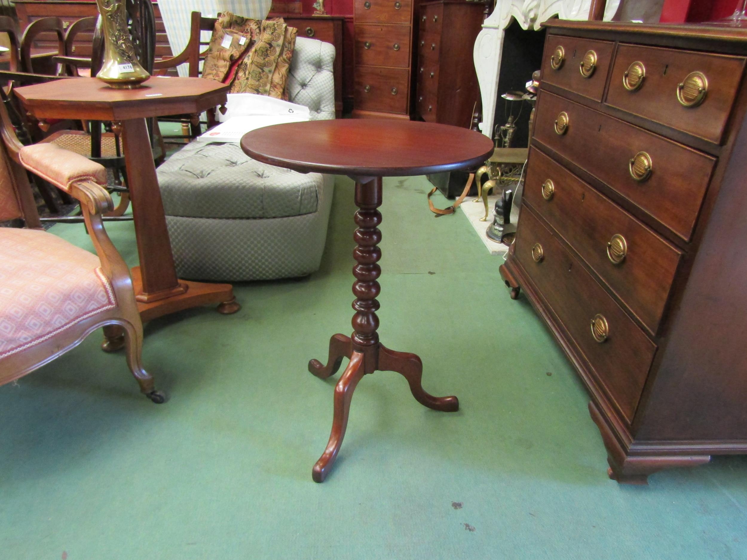 A mahogany circular tilt-top wine table on a bobbin-turned column and tripod base, 70cm tall x 49cm diameter