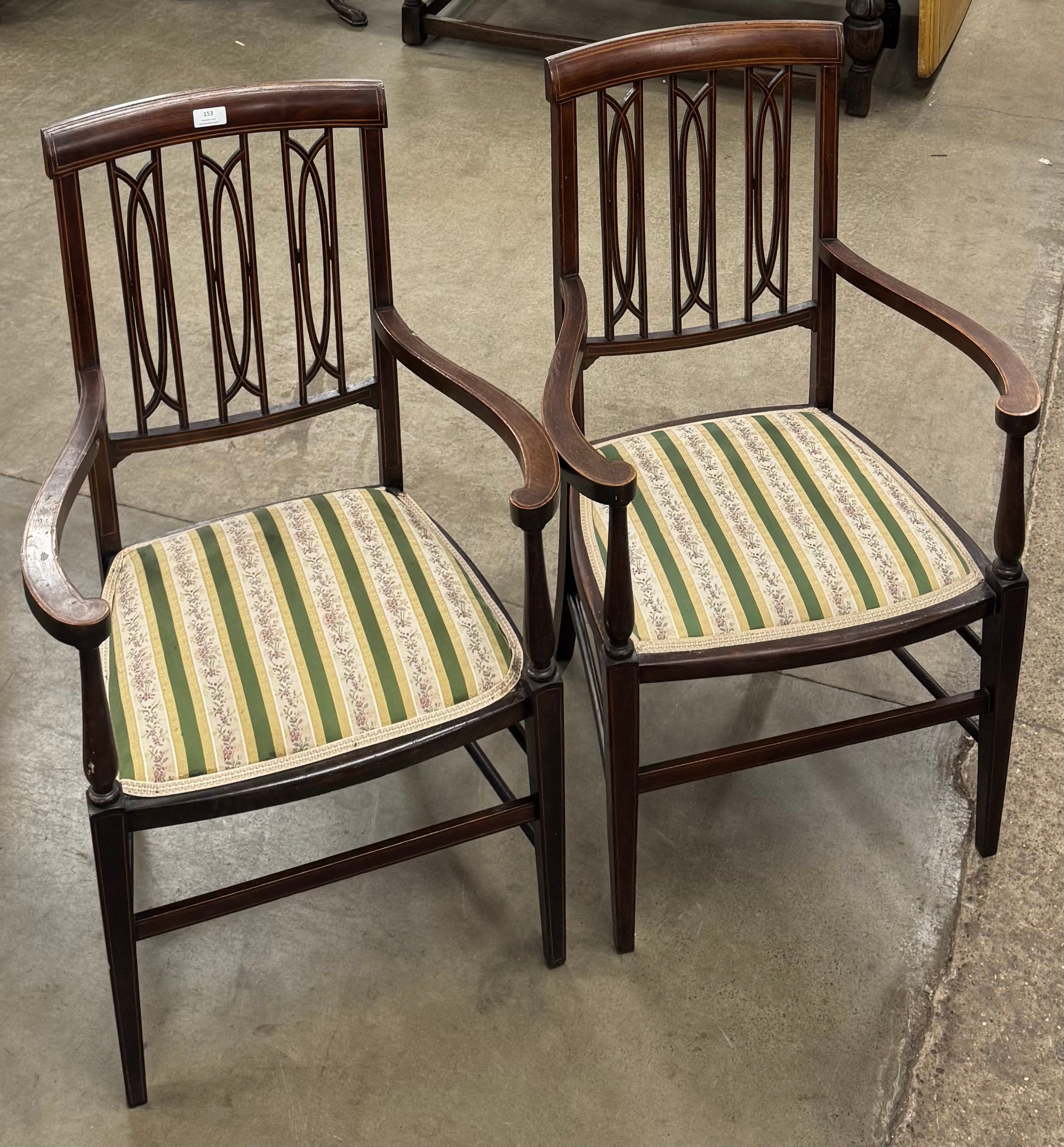 A pair of Edward VII inlaid mahogany elbow chairs