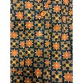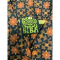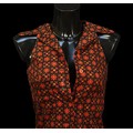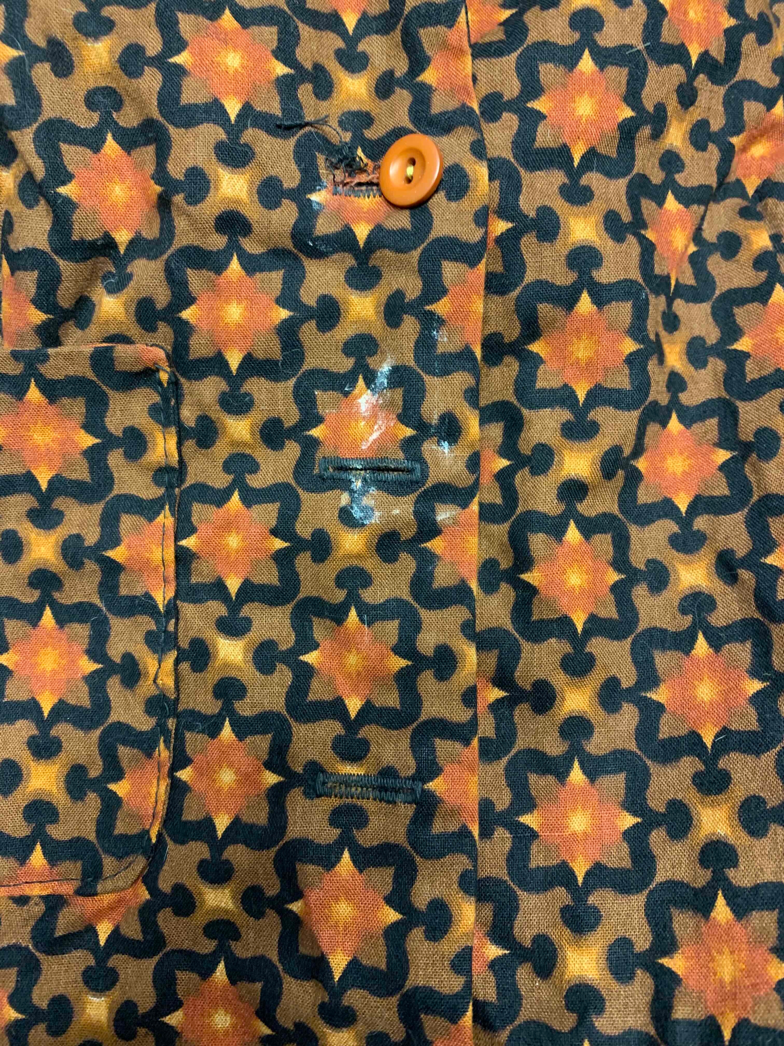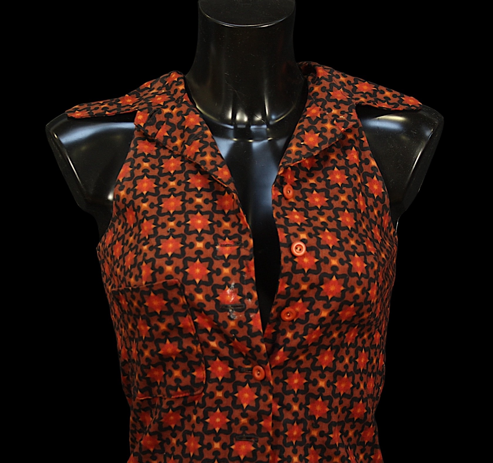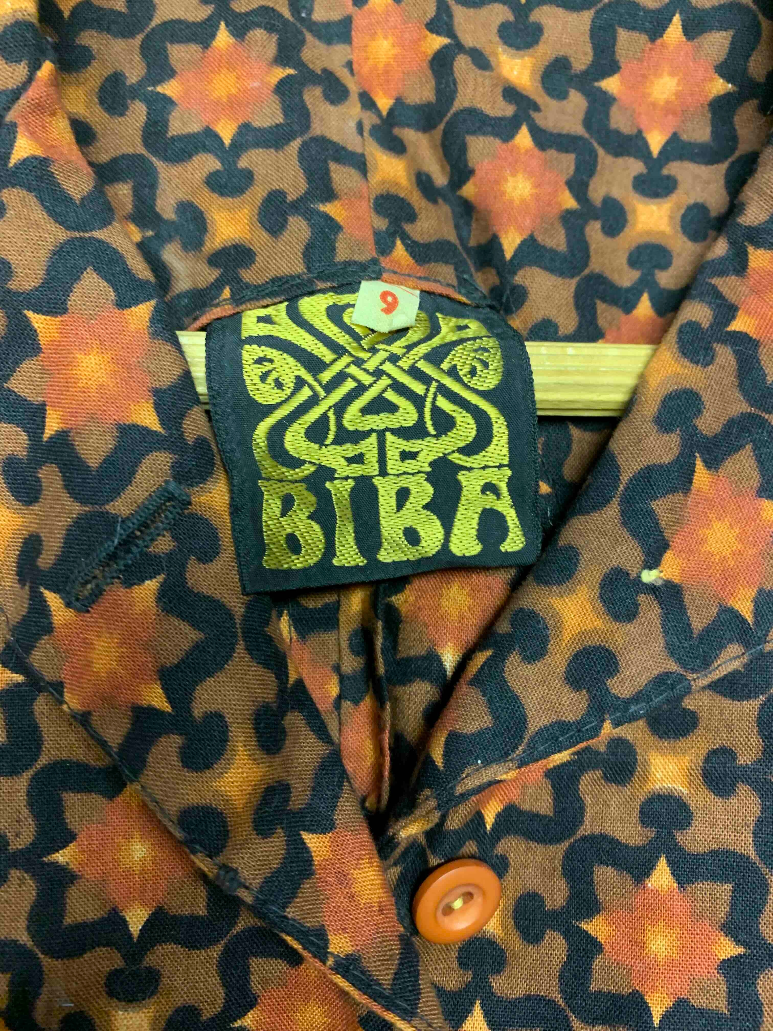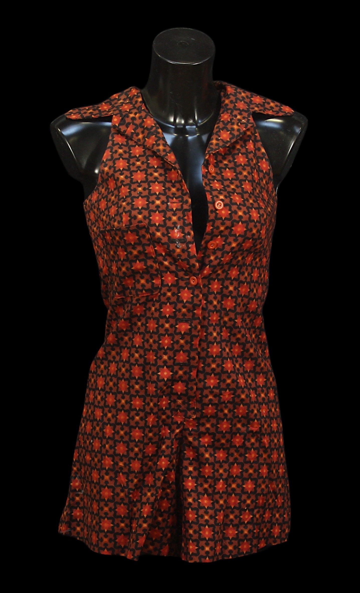 in patterned orange and brown cotton type fabric, sleeveless, with cutaway shoulders and collar, button fastening to front, bearing early 'Biba' labeled to interior, labelled size 6 (or 9)