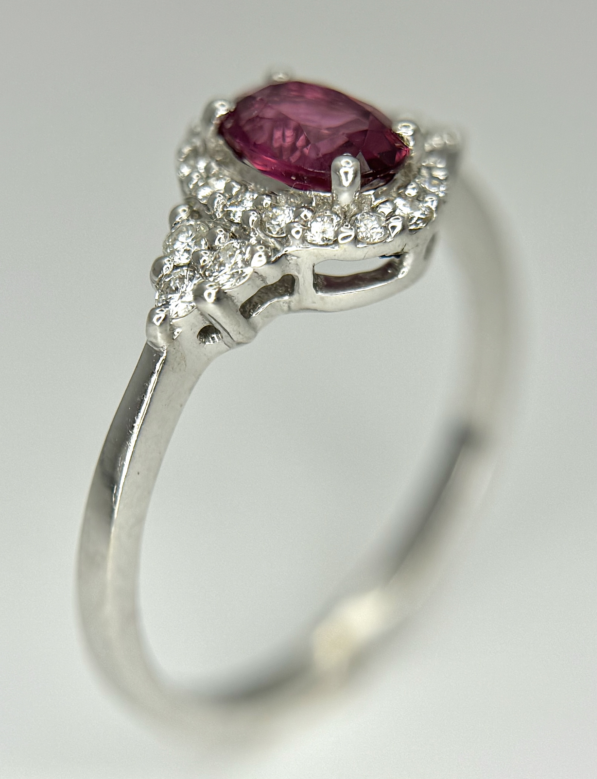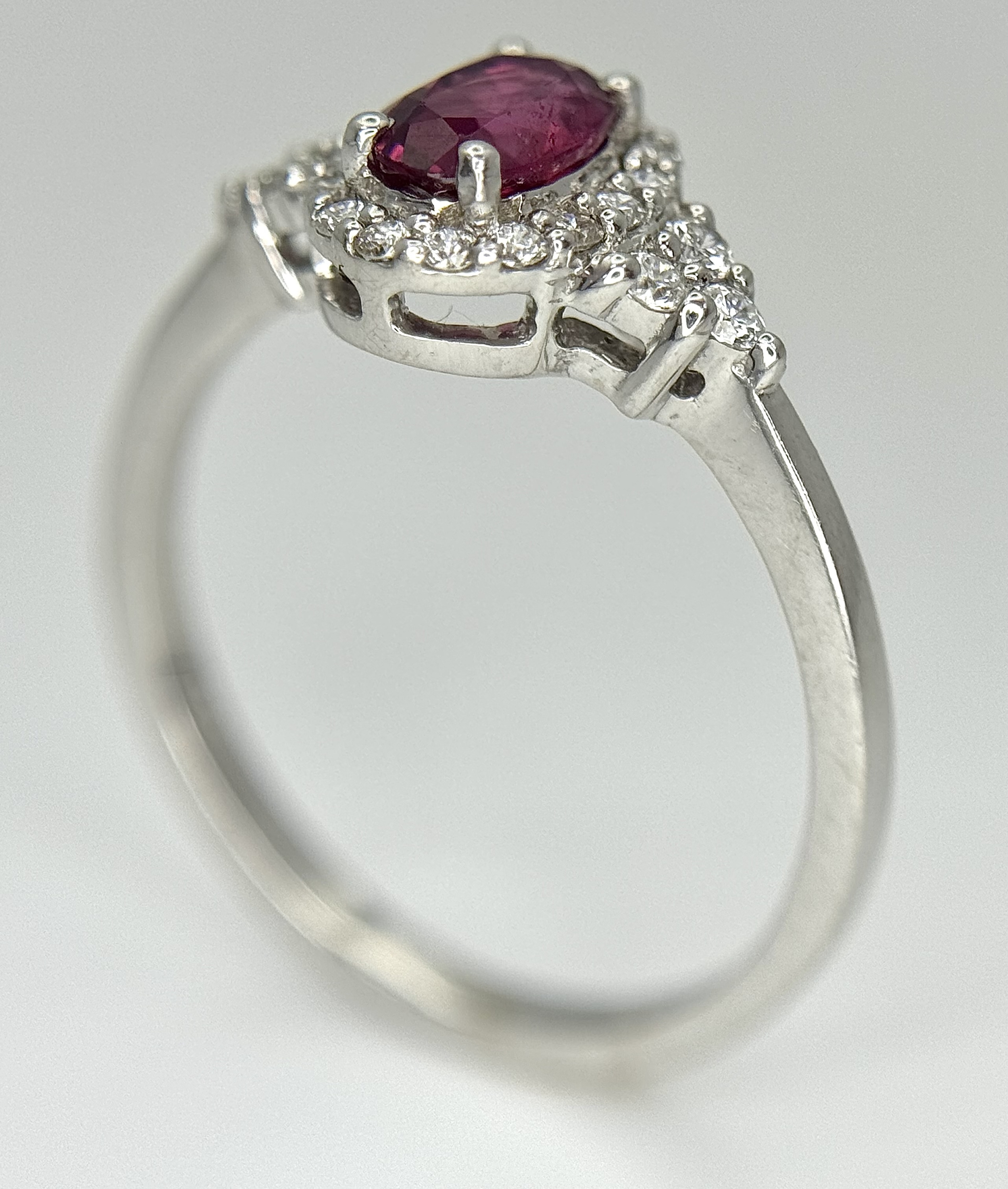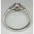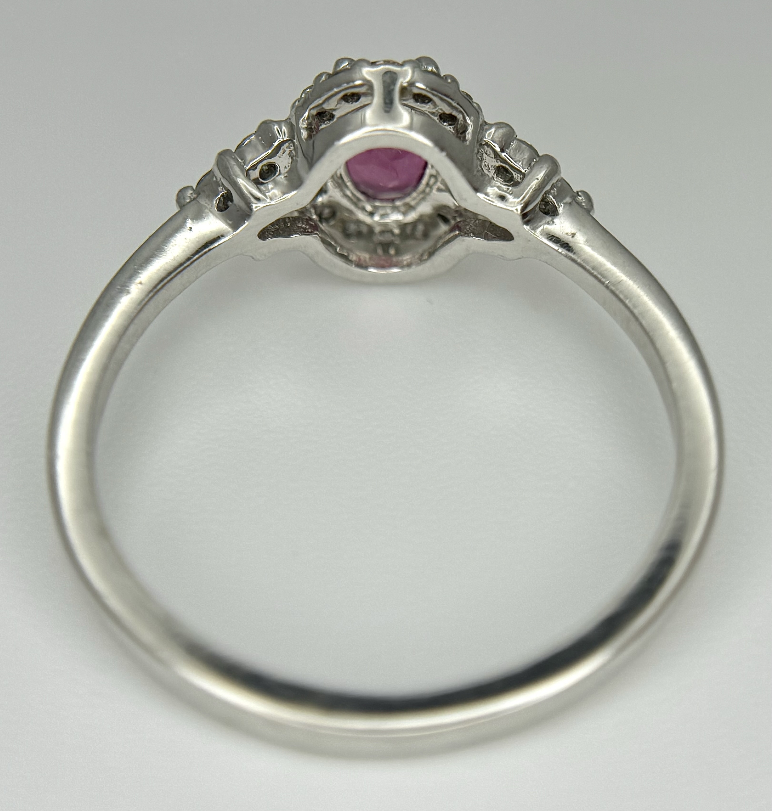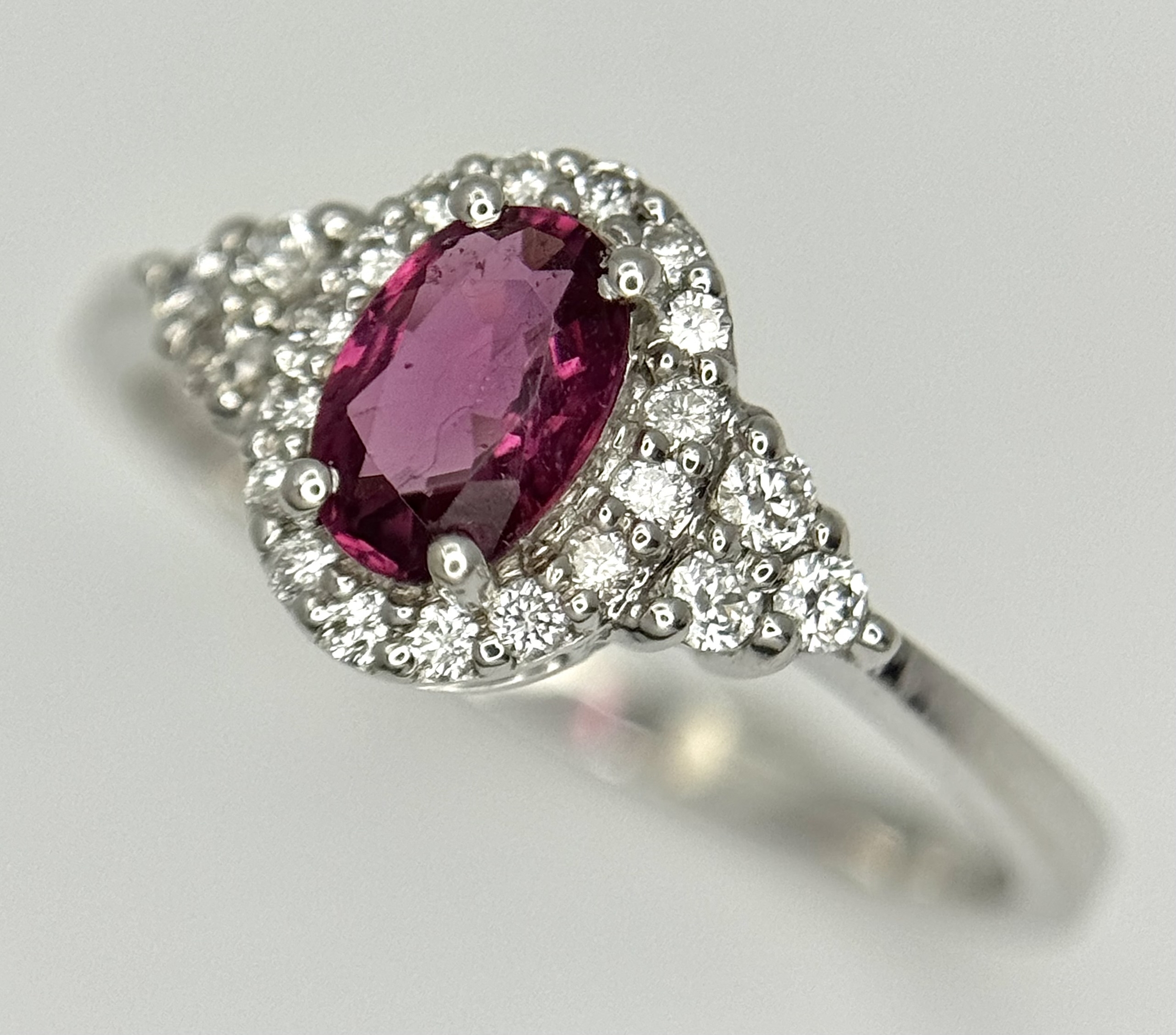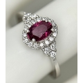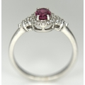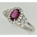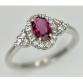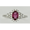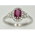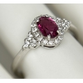 An 18K White Gold, Ruby and Diamond Ring. 0.25ct oval cut high grade central ruby with a diamond cluster surround. Size M 1/2. 2.5g.