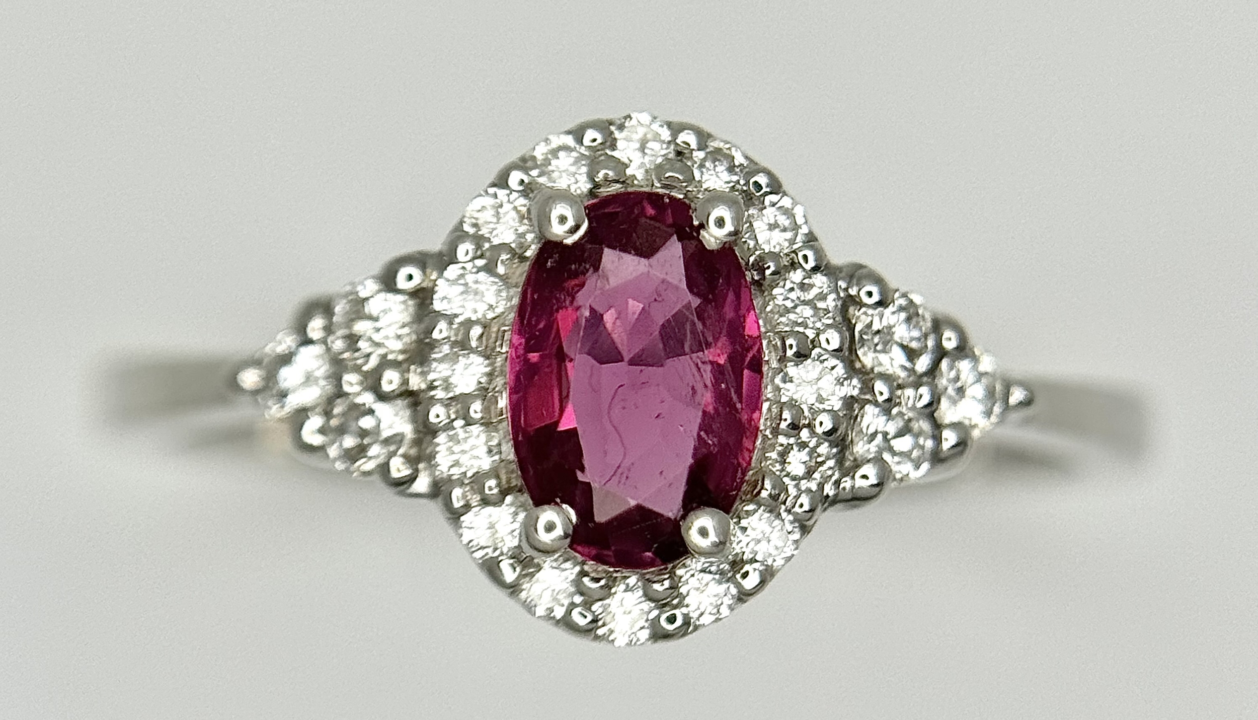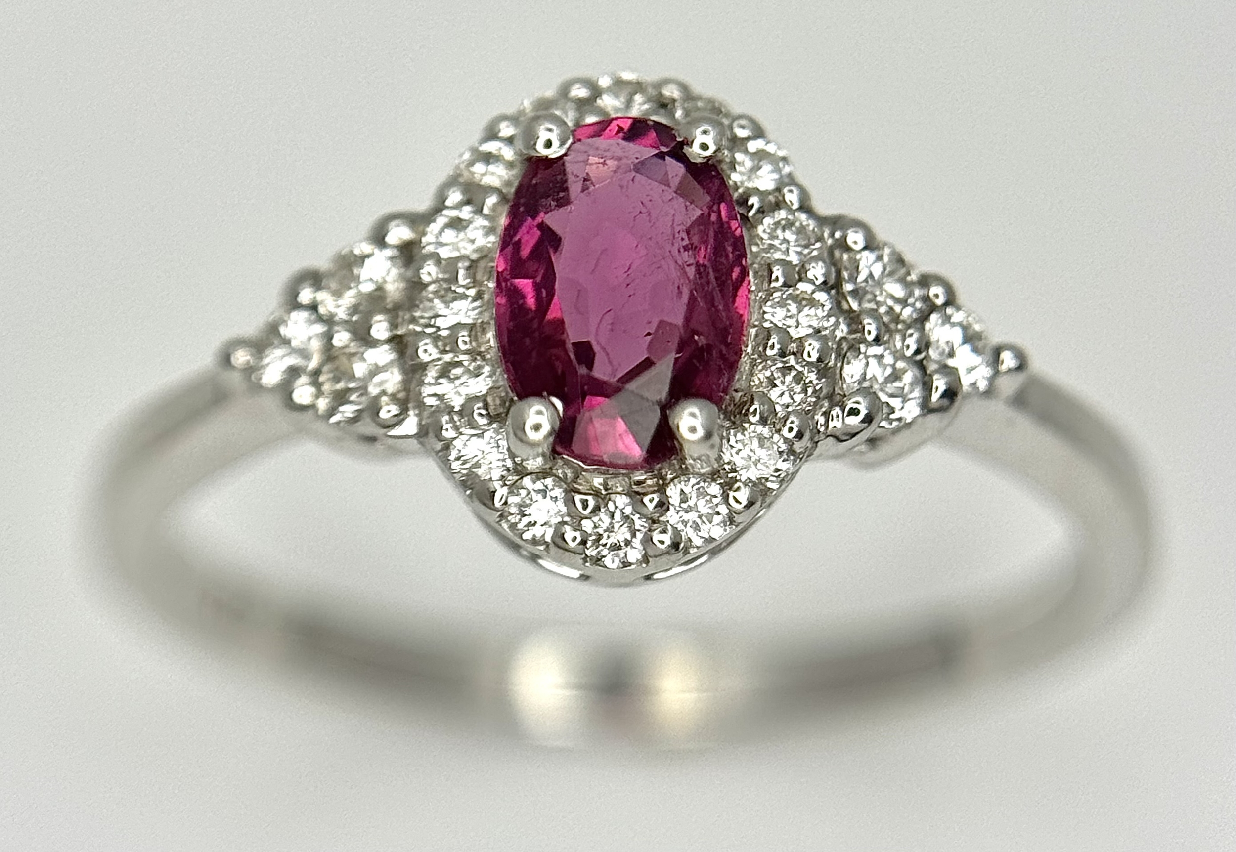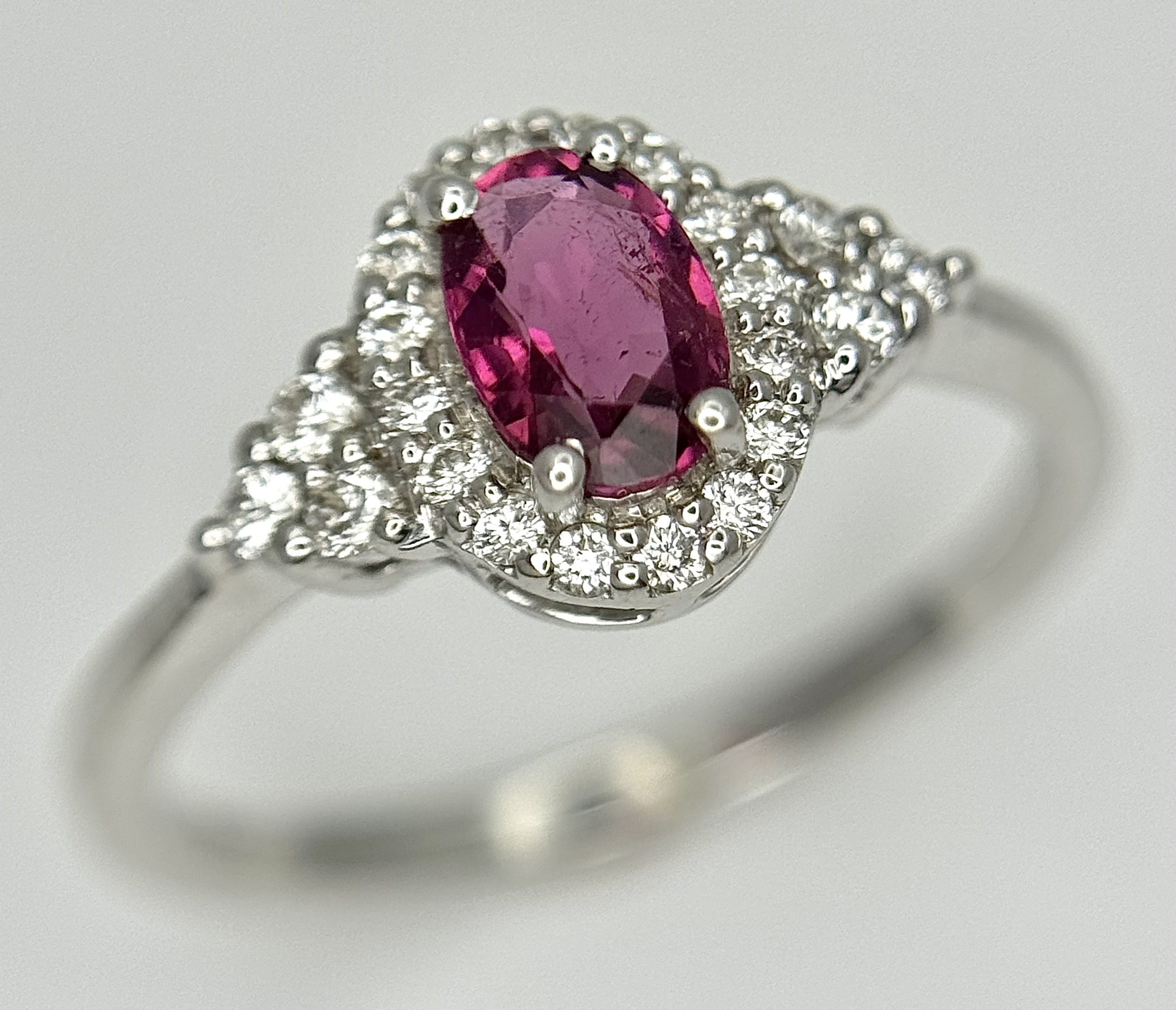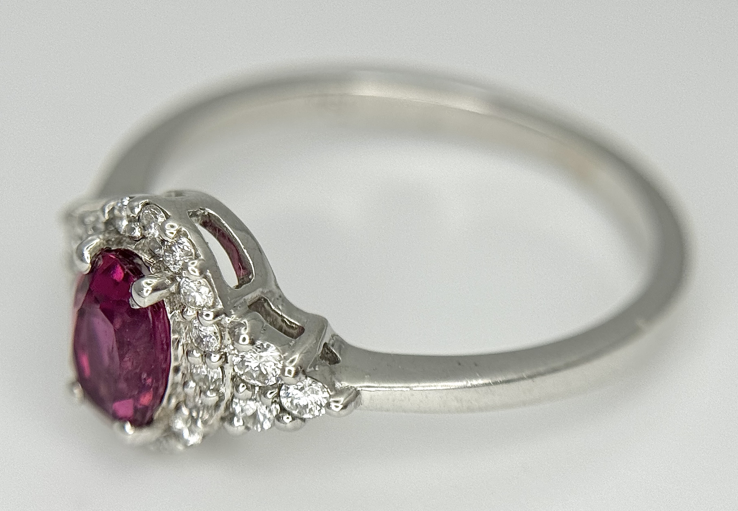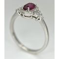An 18K White Gold, Ruby and Diamond Ring. 0.25ct oval cut high grade central ruby with a diamond cluster surround. Size M 1/2. 2.5g.