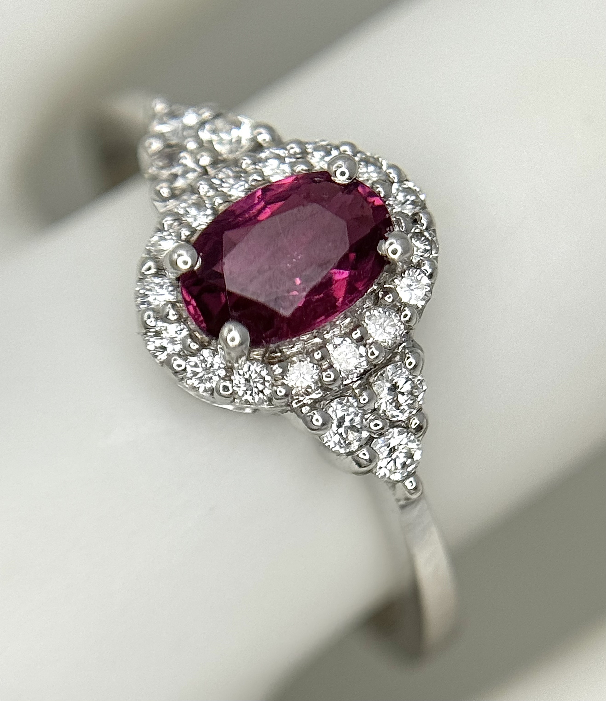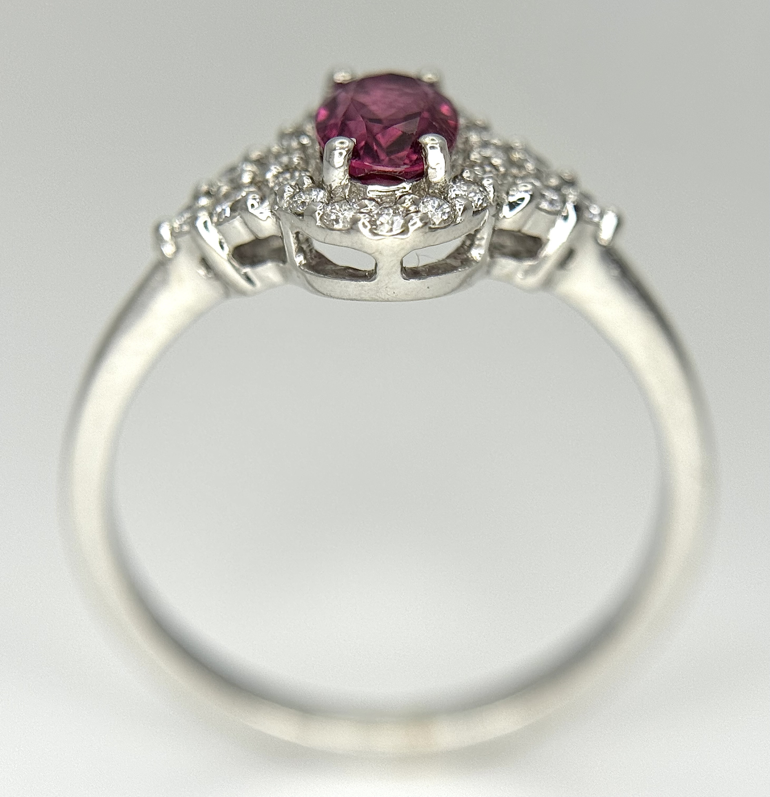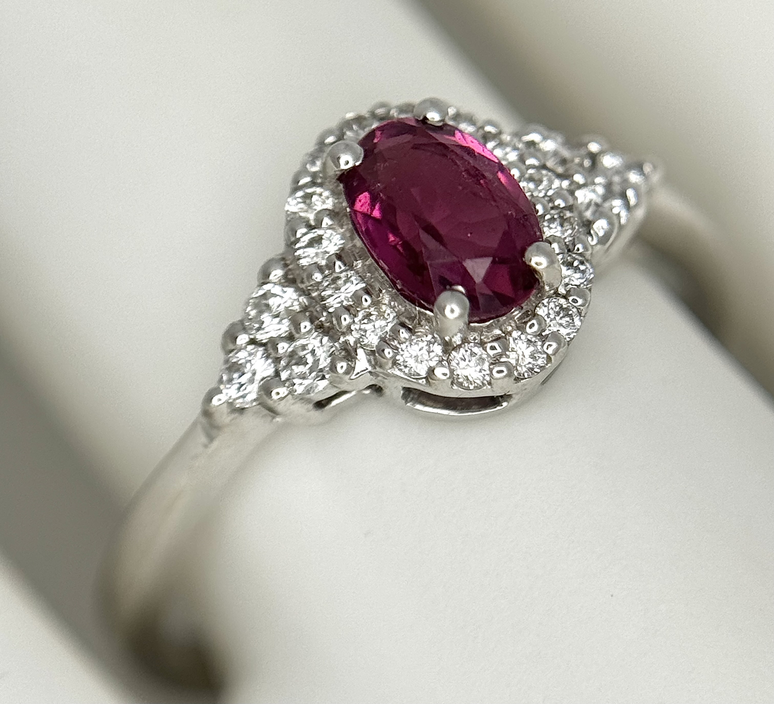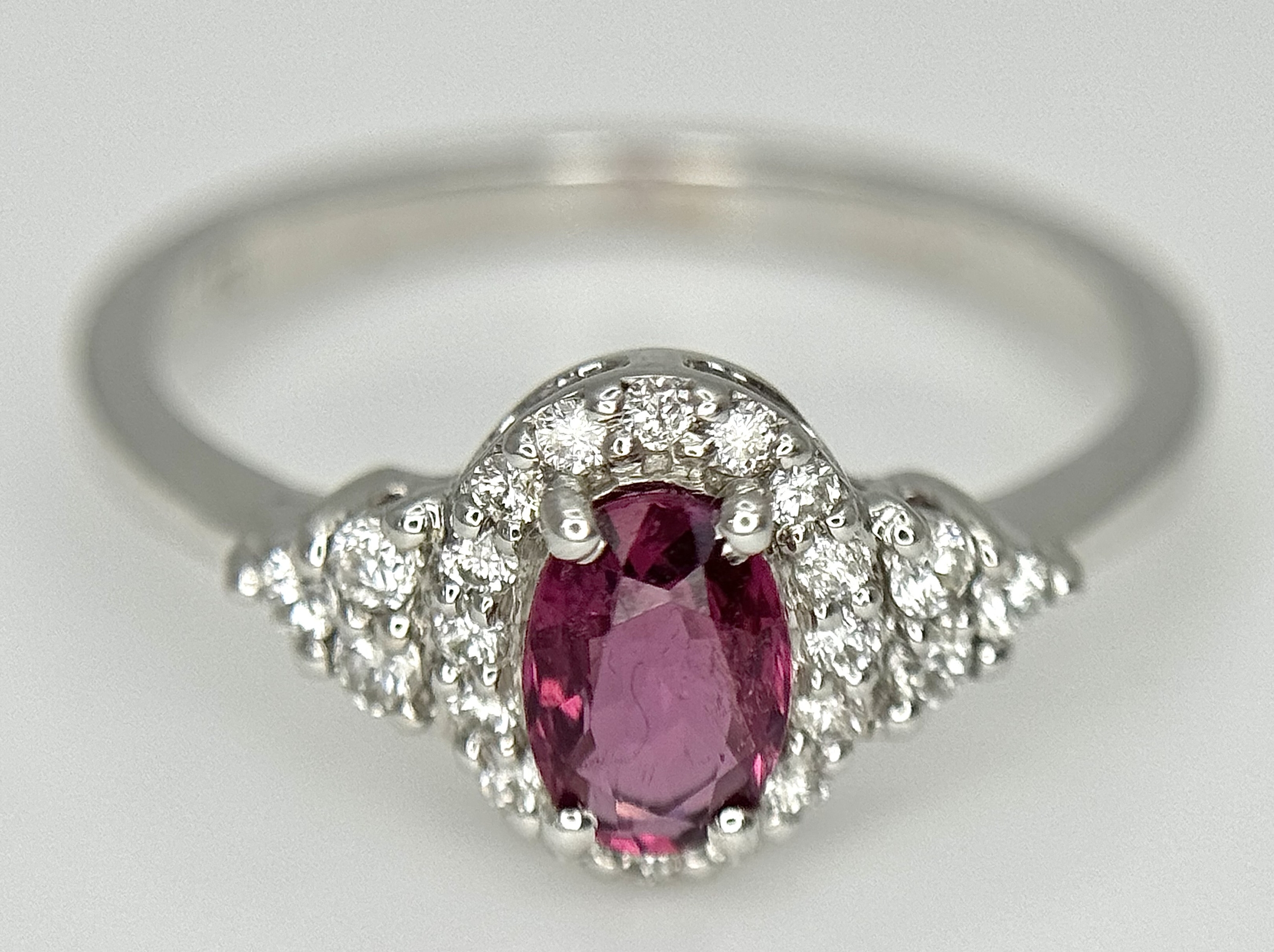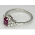 An 18K White Gold, Ruby and Diamond Ring. 0.25ct oval cut high grade central ruby with a diamond cluster surround. Size M 1/2. 2.5g.