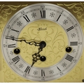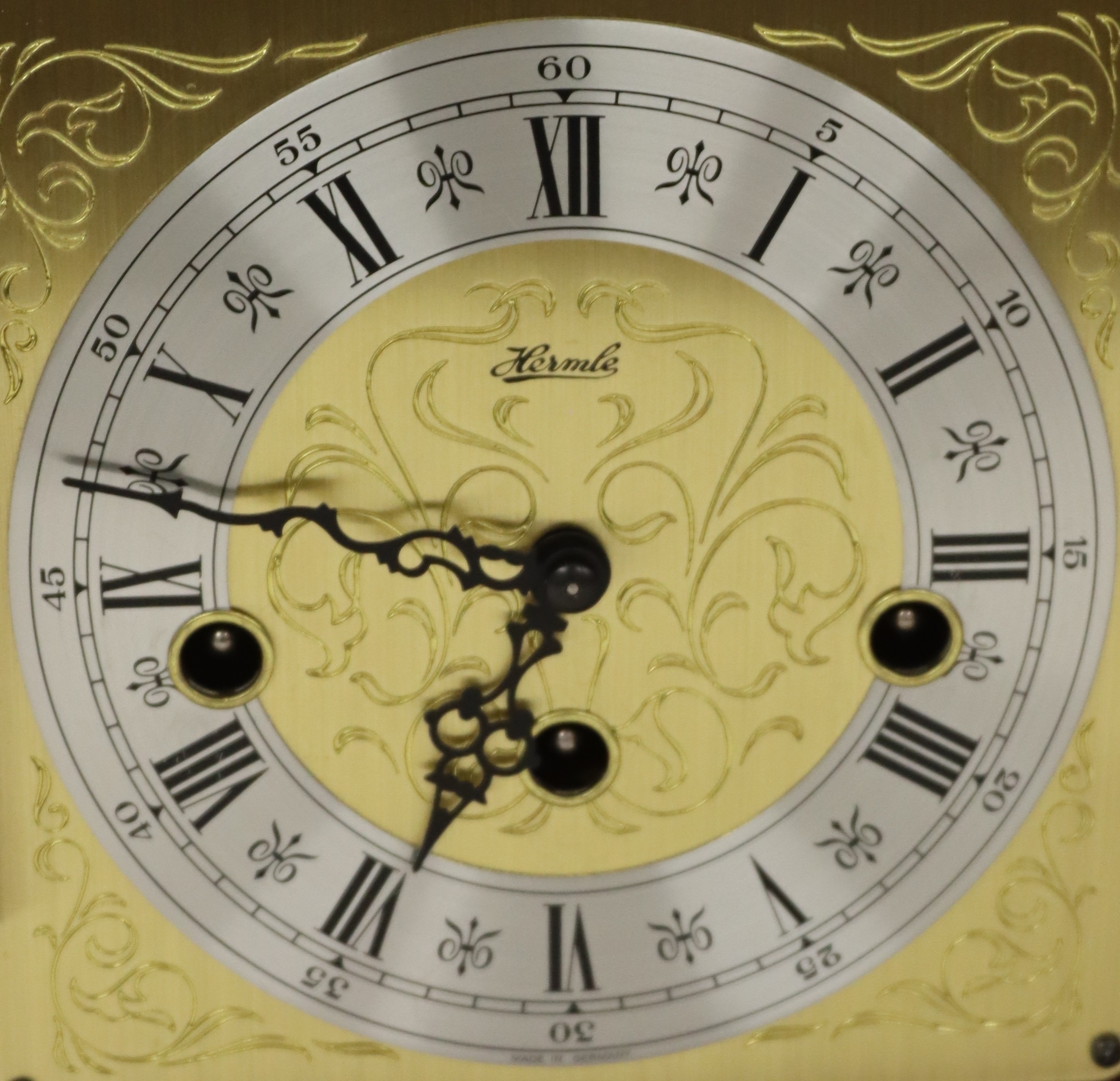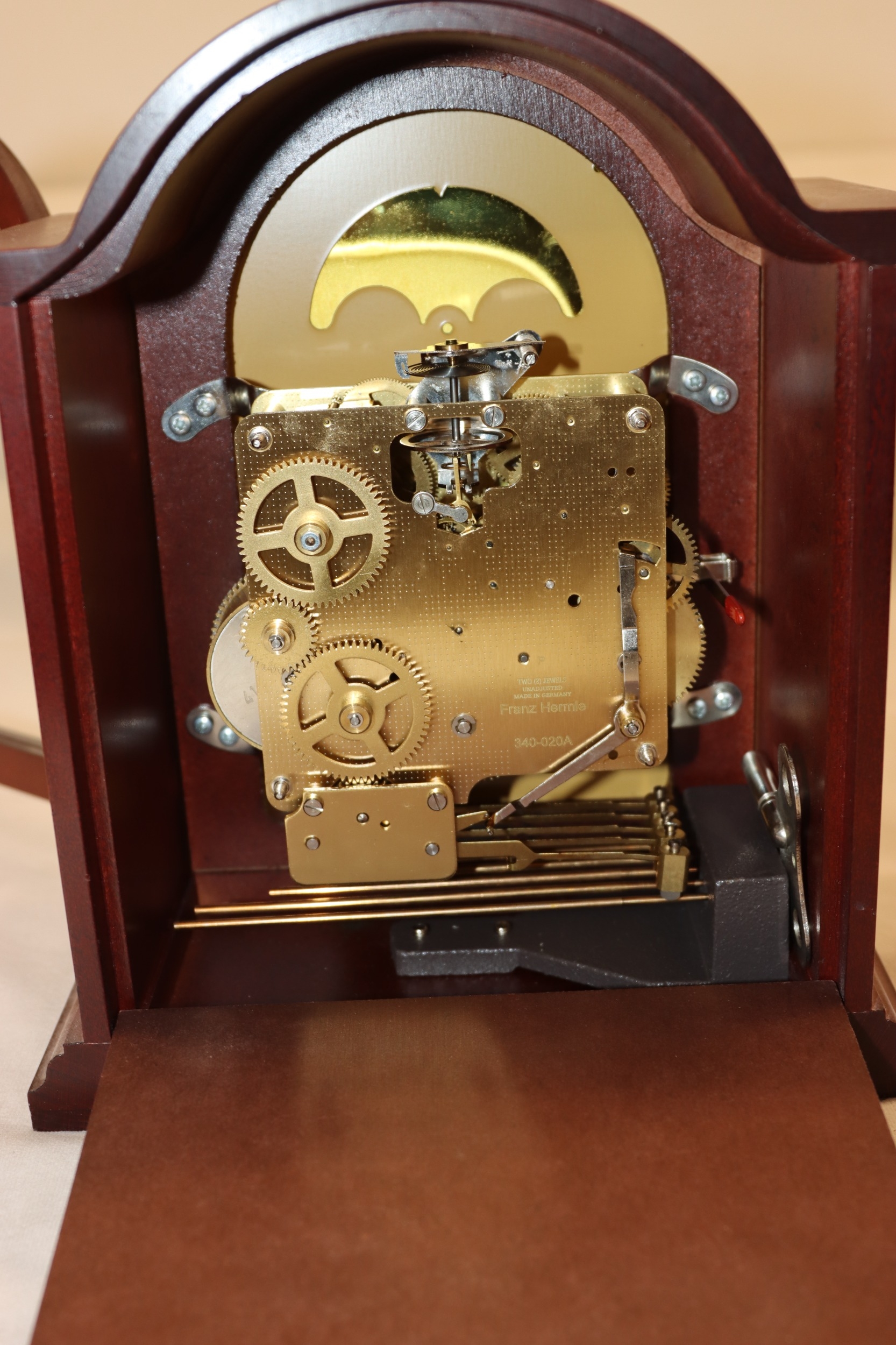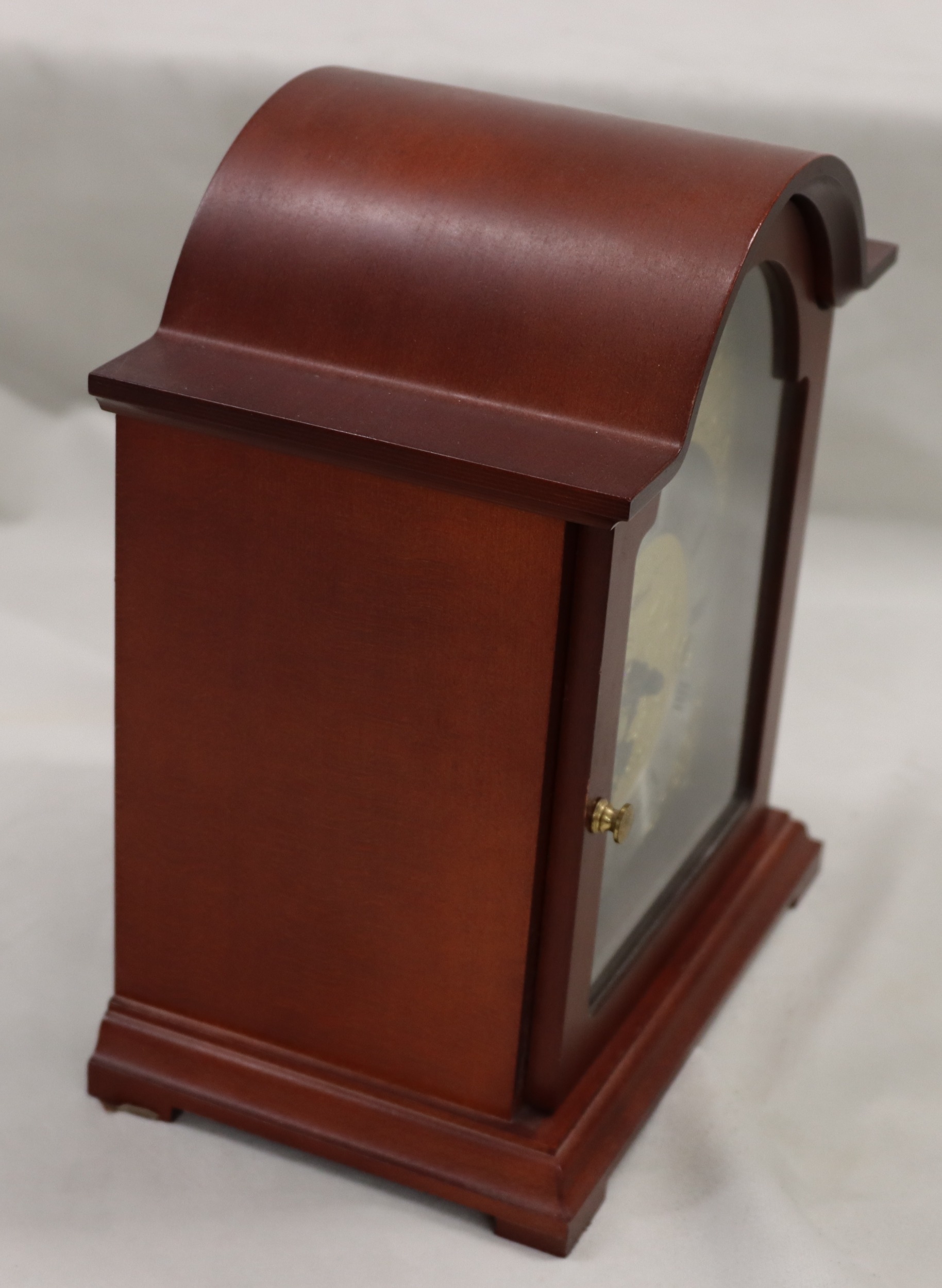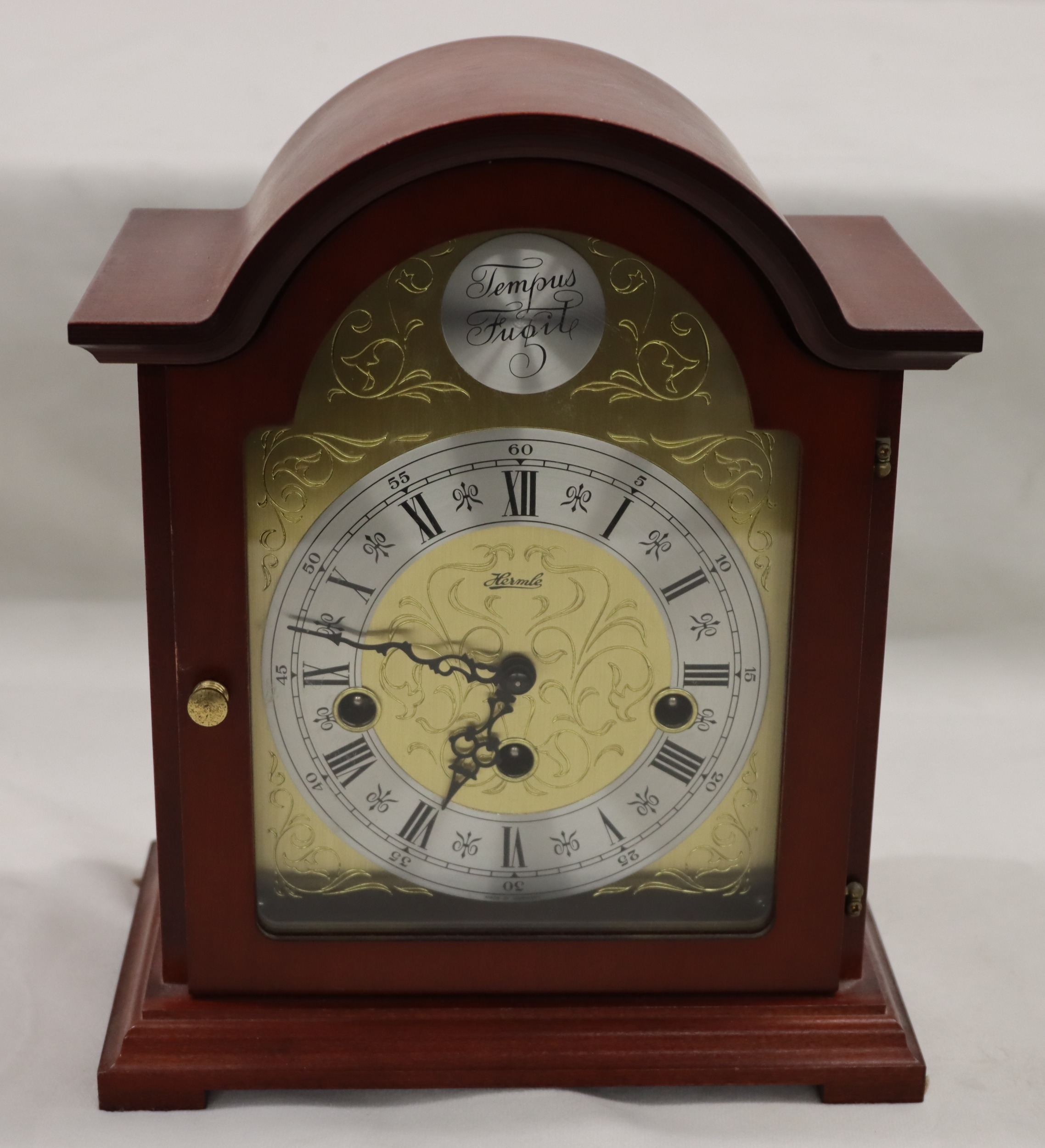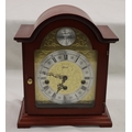A Hermle reproduction mahogany mantel clock, 25cm high.