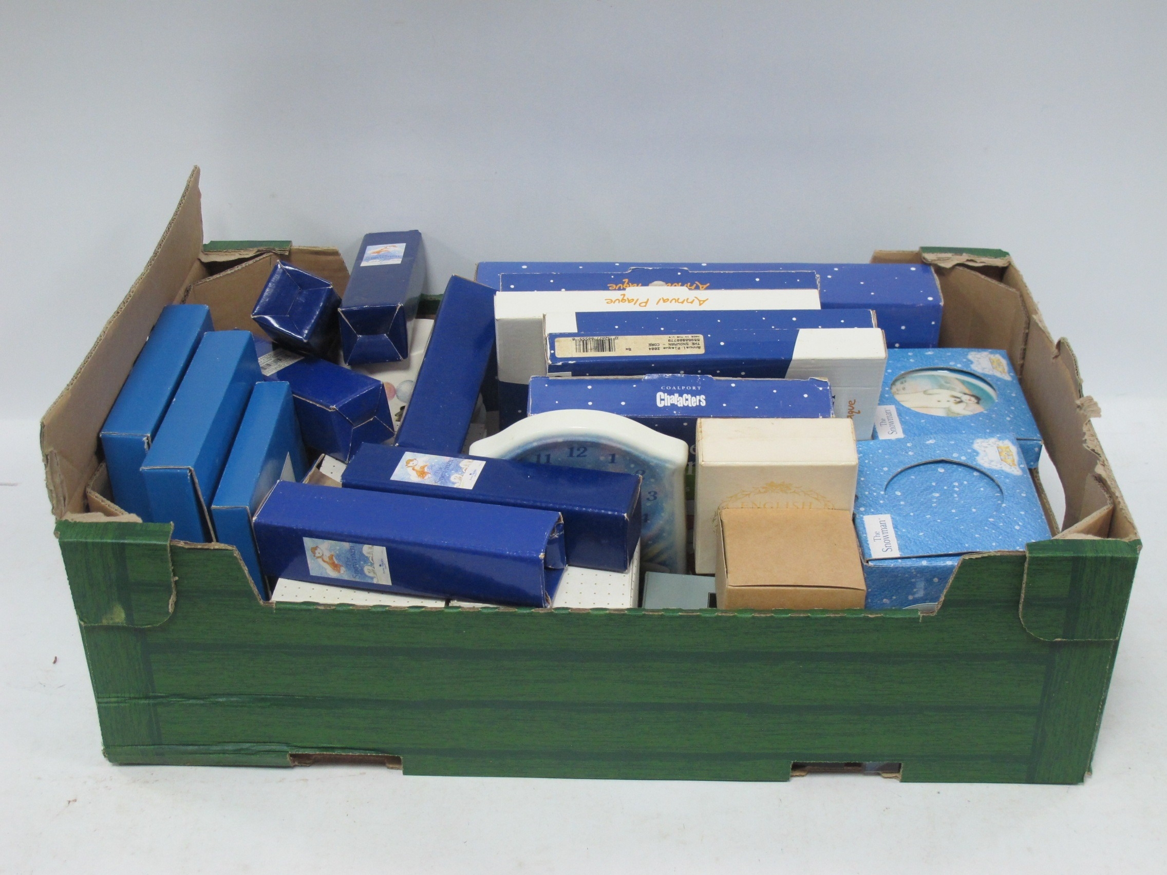 Coalport Characters - The Snowman Collectors Plates, soldier tray and egg cup set, Caithness Snowman related glass paperweights, Border Fine Arts spoons, and various other related ceramics:- One Box.