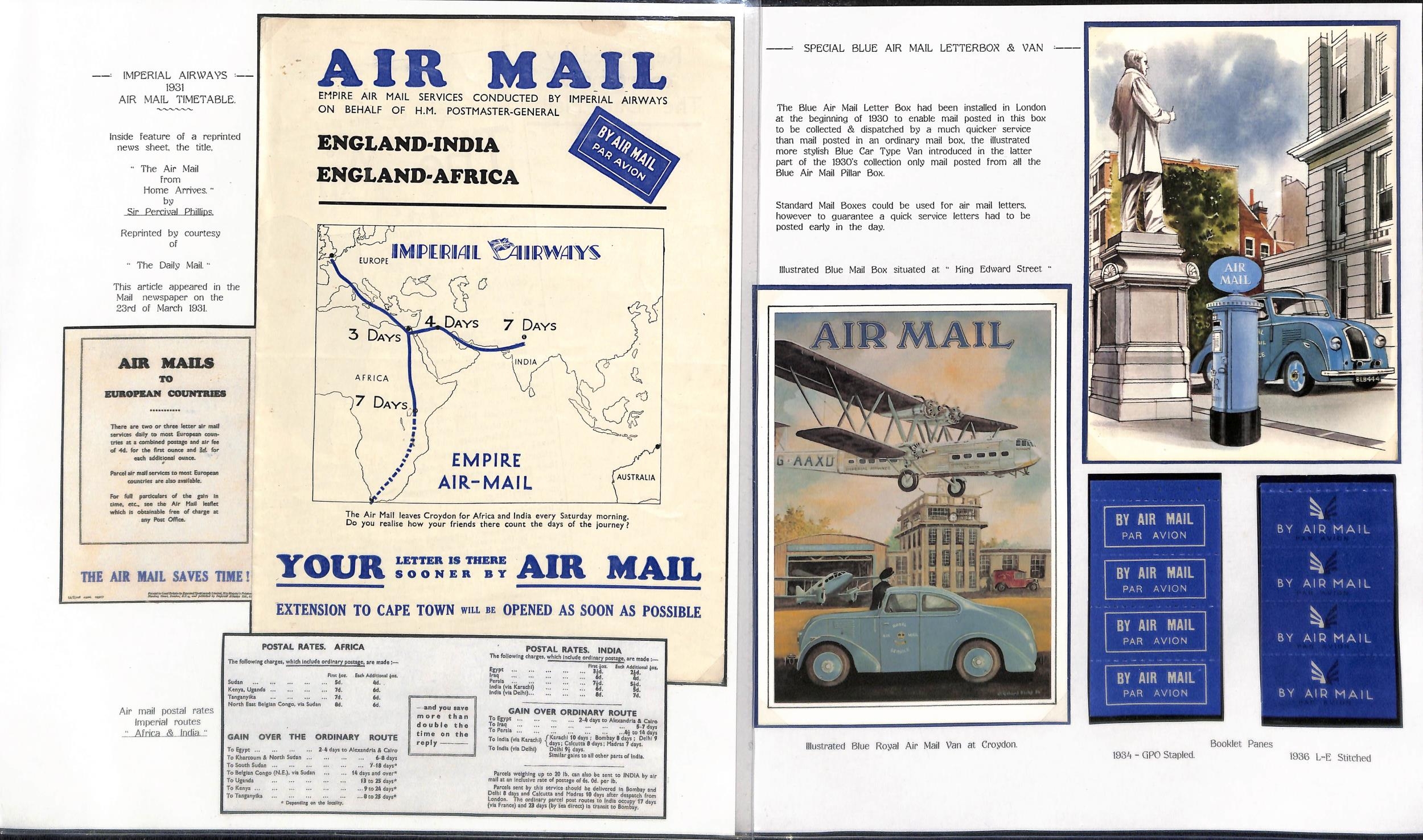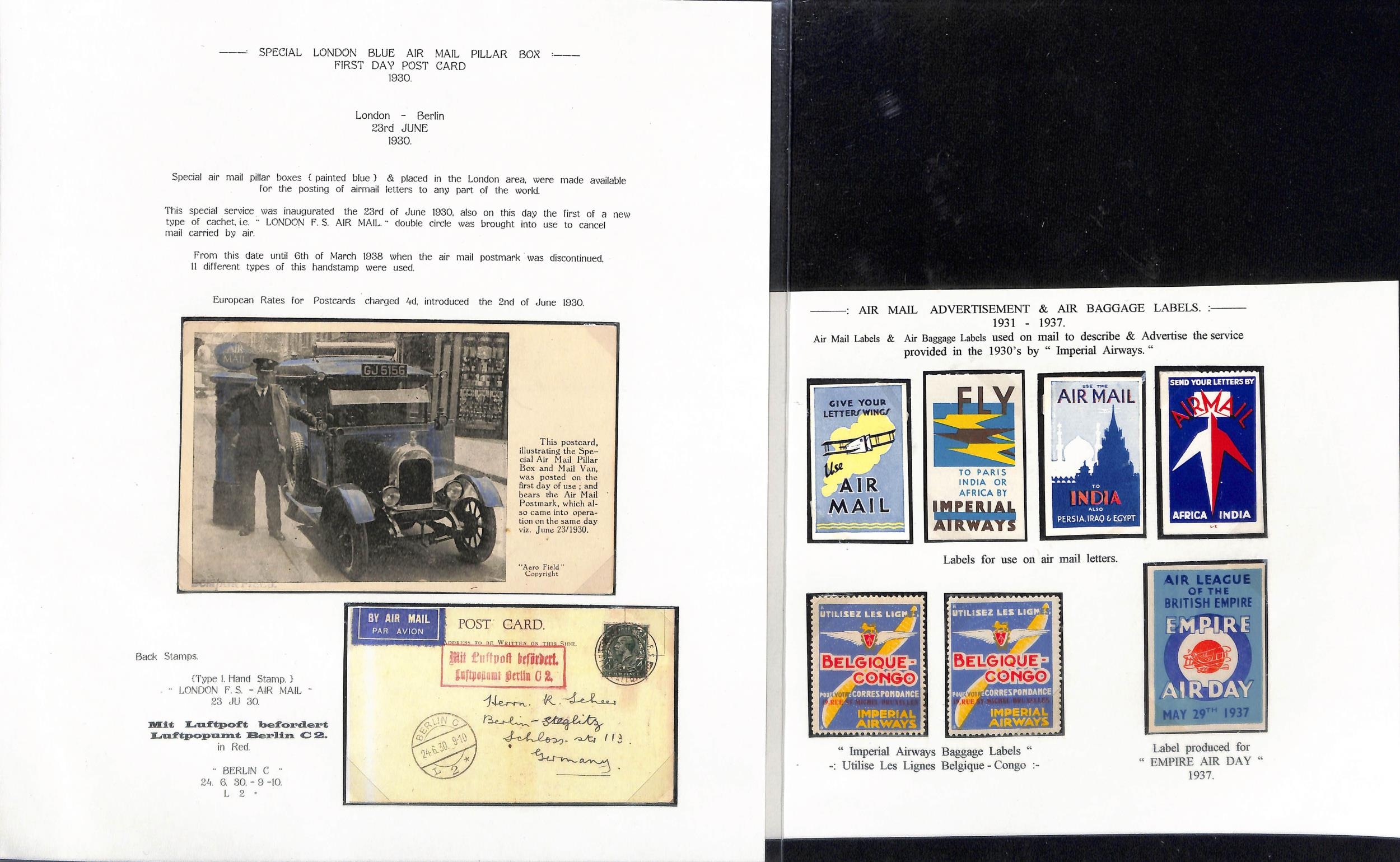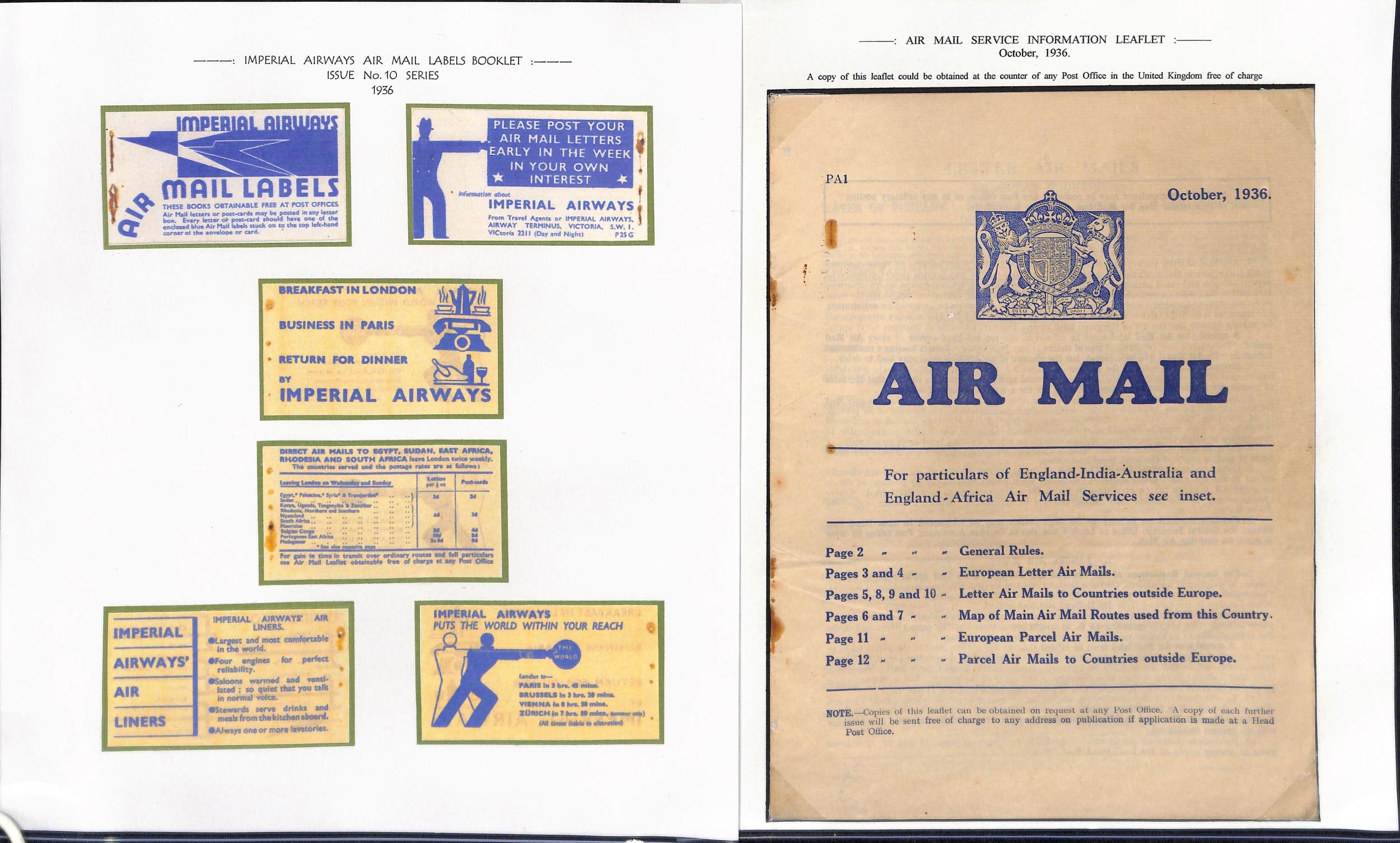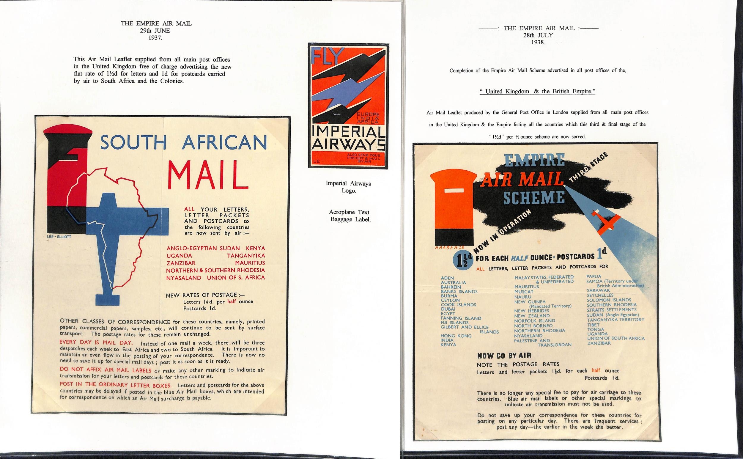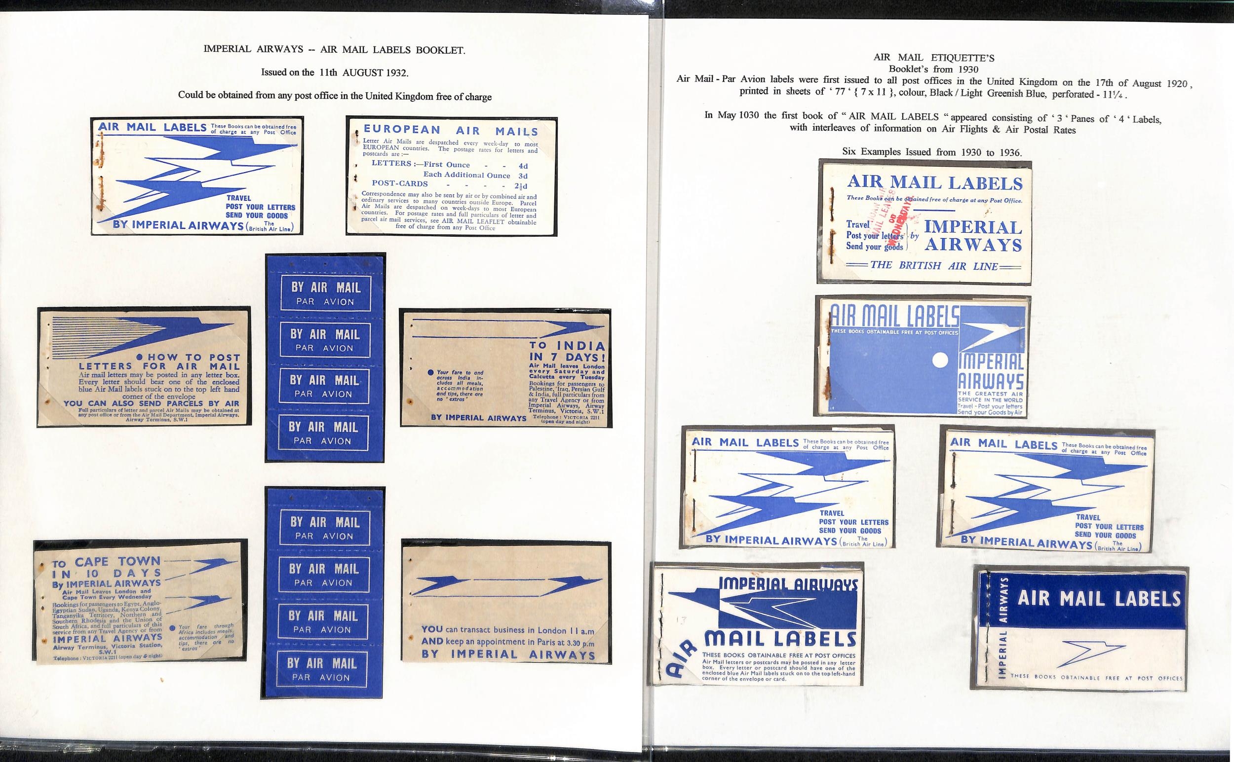 Air Mail labels and leaflets. 1920-38 Labels and leaflets issued by the British Post Office or Imperial Airways including 1920 (Aug.) first G.P.O leaflet on Air Mail Services with an example of the first Air Mail label attached; 1921 (Apr.) European Air Mail timetable; other 1929-38 G.P.O pamphlets (9) and 1931 Air Mail timetable issued by Imperial Airways; c.1928-37 Air Mail bag labels (2) and a letter bundle label; Imperial Airways booklets of Air Mail labels (12, three exploded); Imperial Airways Air Mail publicity labels (7); 1930 postcard depicting the special blue Air Mail van and posting box, flown to Germany with first day use of the "LONDON F.S / AIR MAIL" c.d.s; 1937 Christmas concession labels waiving the surcharge on underpaid mail, British P.O labels unused (2) or on a cover from South Africa, also similar unused labels issued in South Africa (strip of five), Kenya (2) or Southern Rhodesia. A fine and interesting lot. (46).