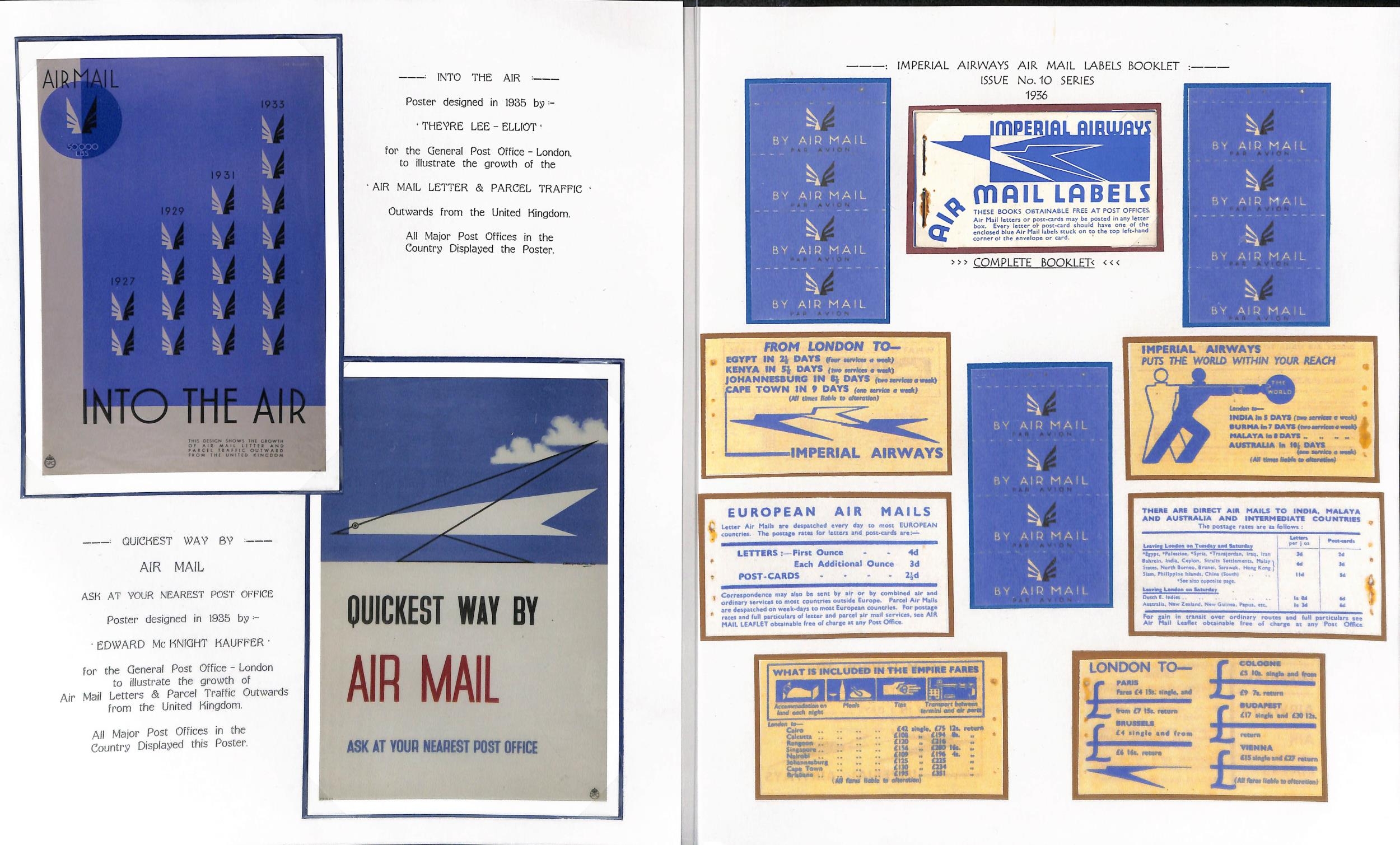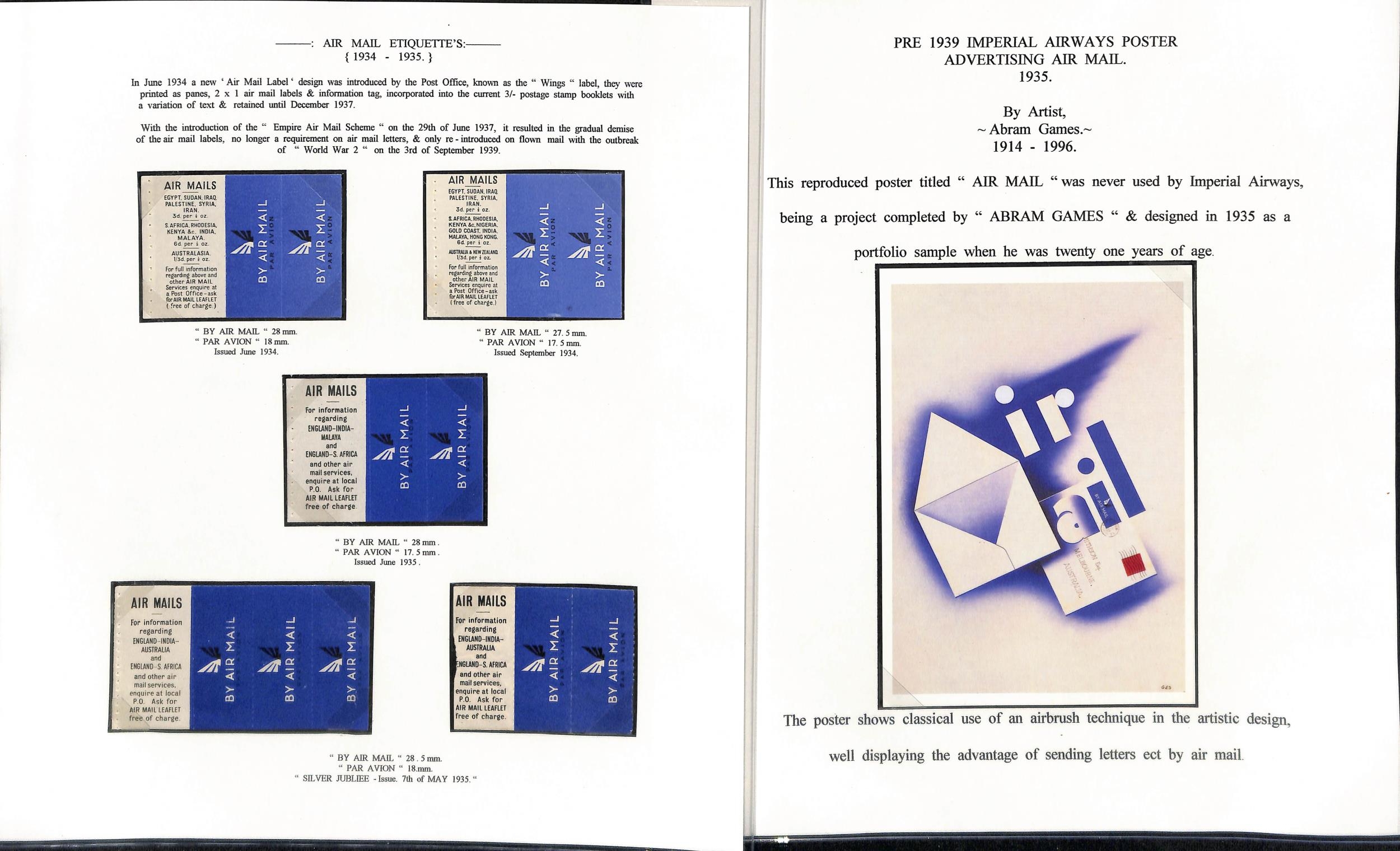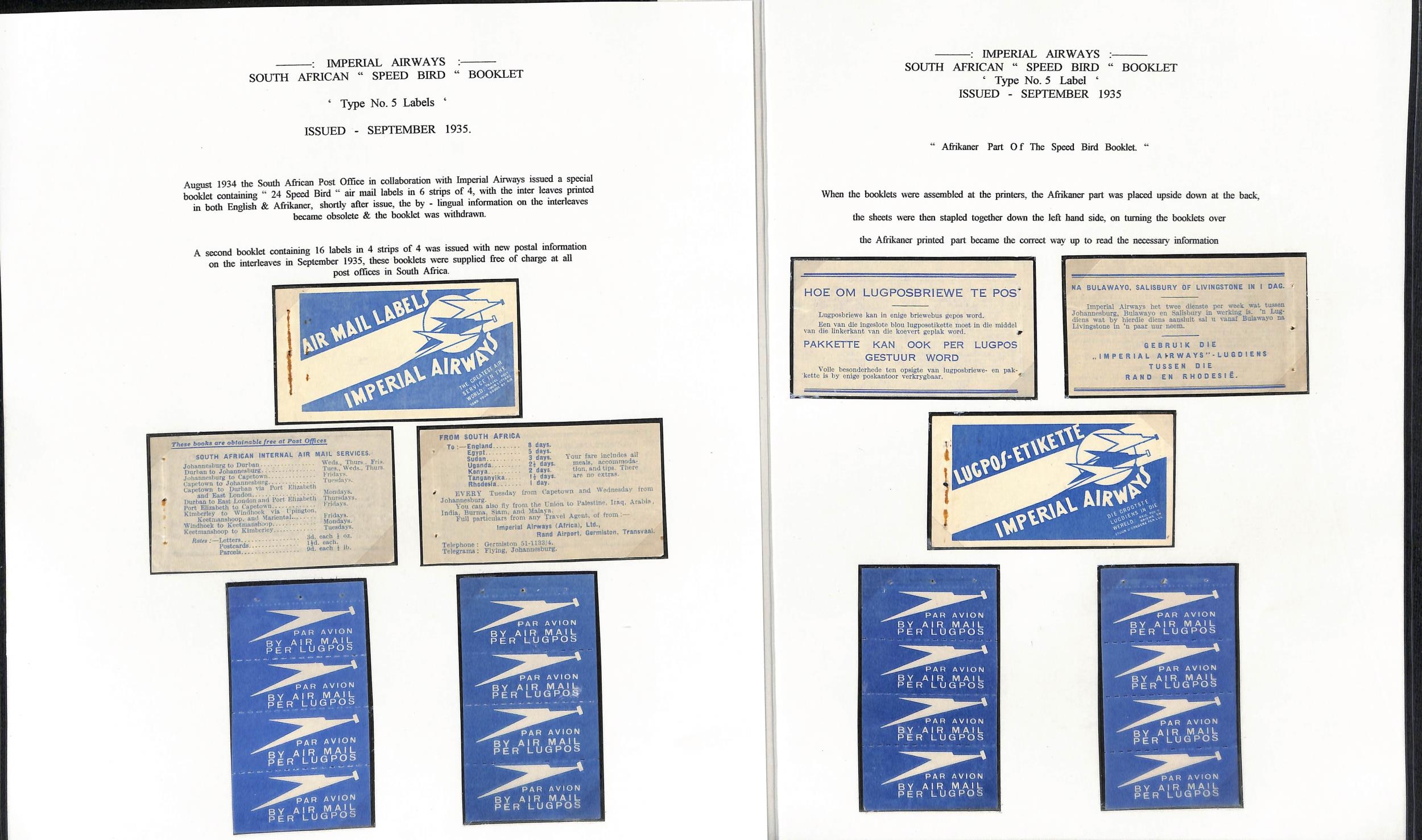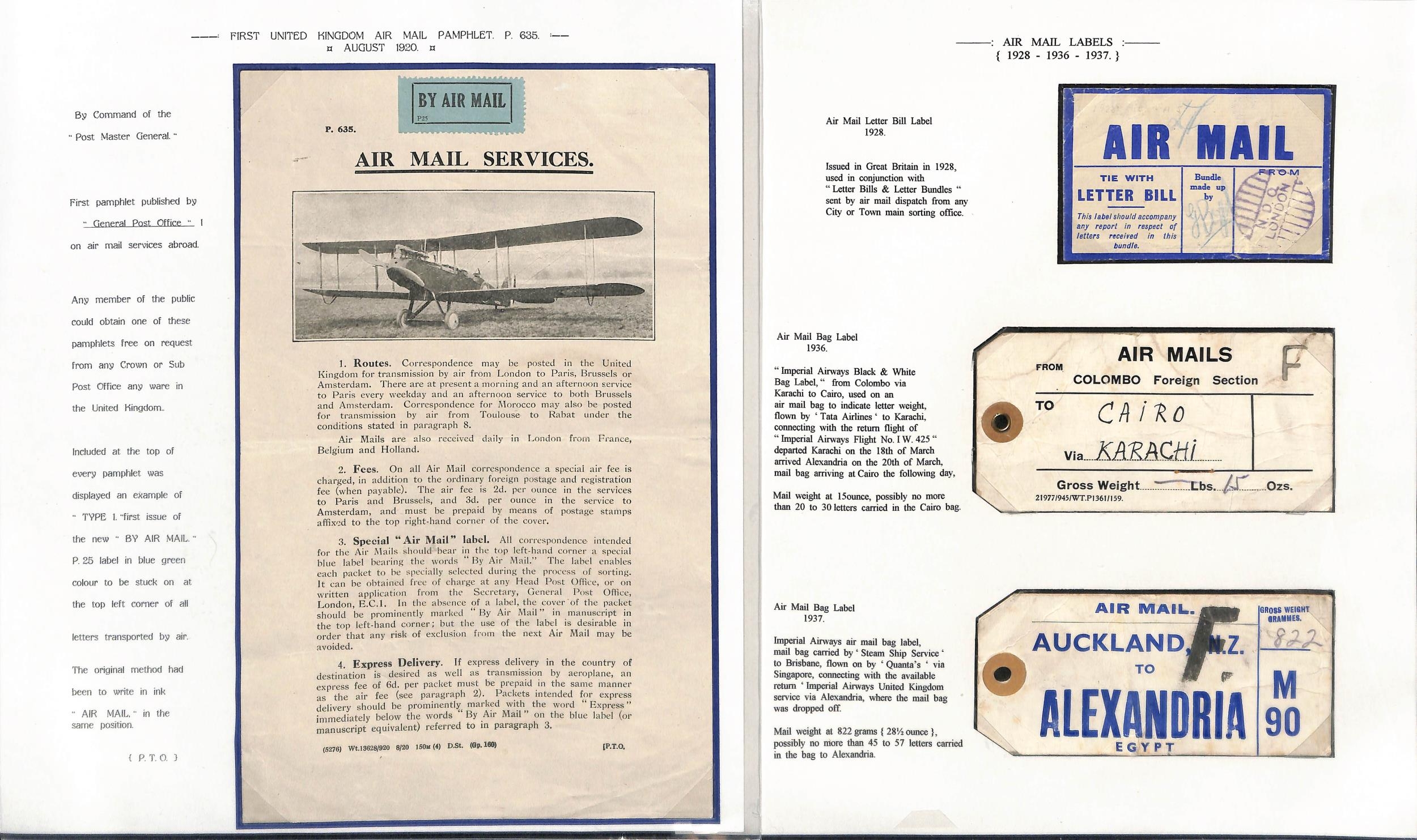 Air Mail labels and leaflets. 1920-38 Labels and leaflets issued by the British Post Office or Imperial Airways including 1920 (Aug.) first G.P.O leaflet on Air Mail Services with an example of the first Air Mail label attached; 1921 (Apr.) European Air Mail timetable; other 1929-38 G.P.O pamphlets (9) and 1931 Air Mail timetable issued by Imperial Airways; c.1928-37 Air Mail bag labels (2) and a letter bundle label; Imperial Airways booklets of Air Mail labels (12, three exploded); Imperial Airways Air Mail publicity labels (7); 1930 postcard depicting the special blue Air Mail van and posting box, flown to Germany with first day use of the "LONDON F.S / AIR MAIL" c.d.s; 1937 Christmas concession labels waiving the surcharge on underpaid mail, British P.O labels unused (2) or on a cover from South Africa, also similar unused labels issued in South Africa (strip of five), Kenya (2) or Southern Rhodesia. A fine and interesting lot. (46).