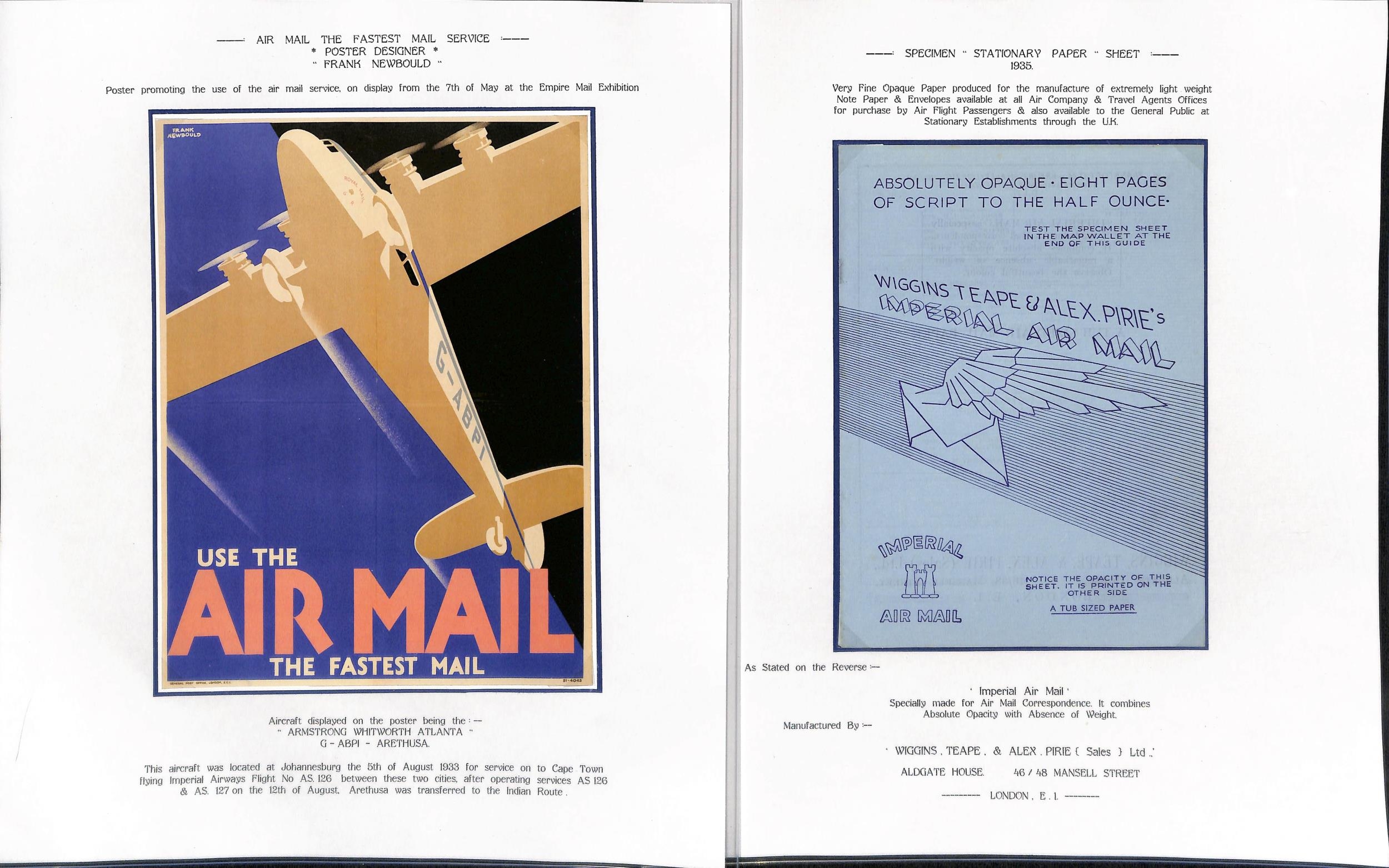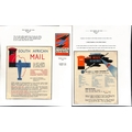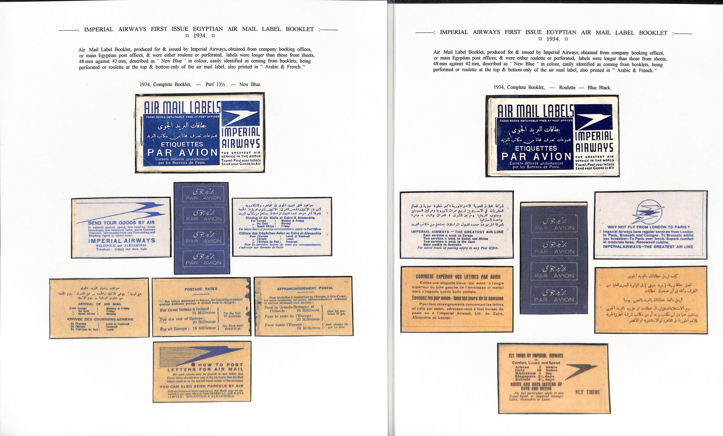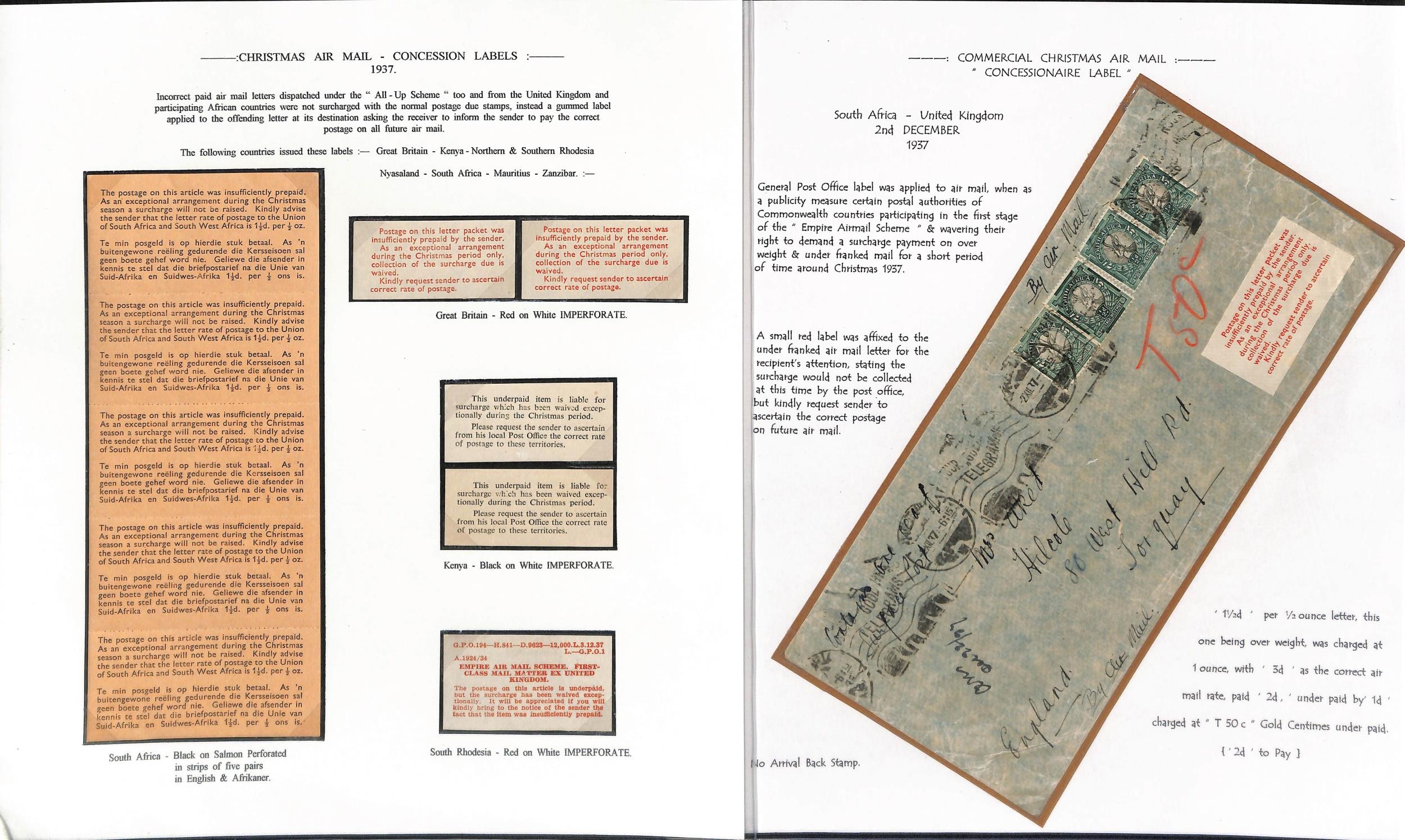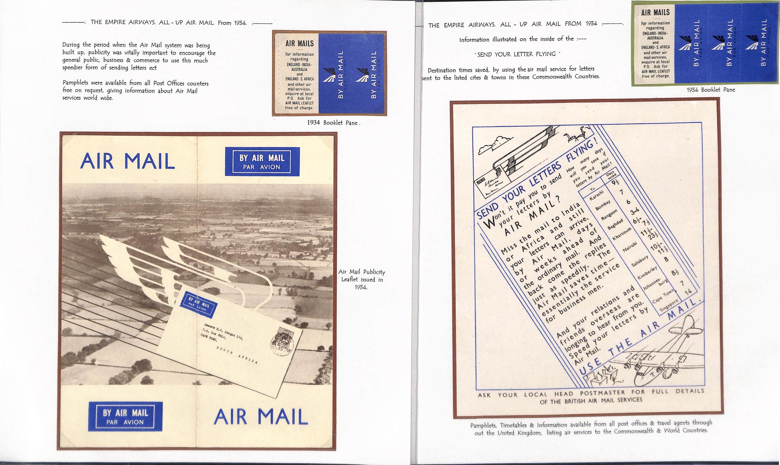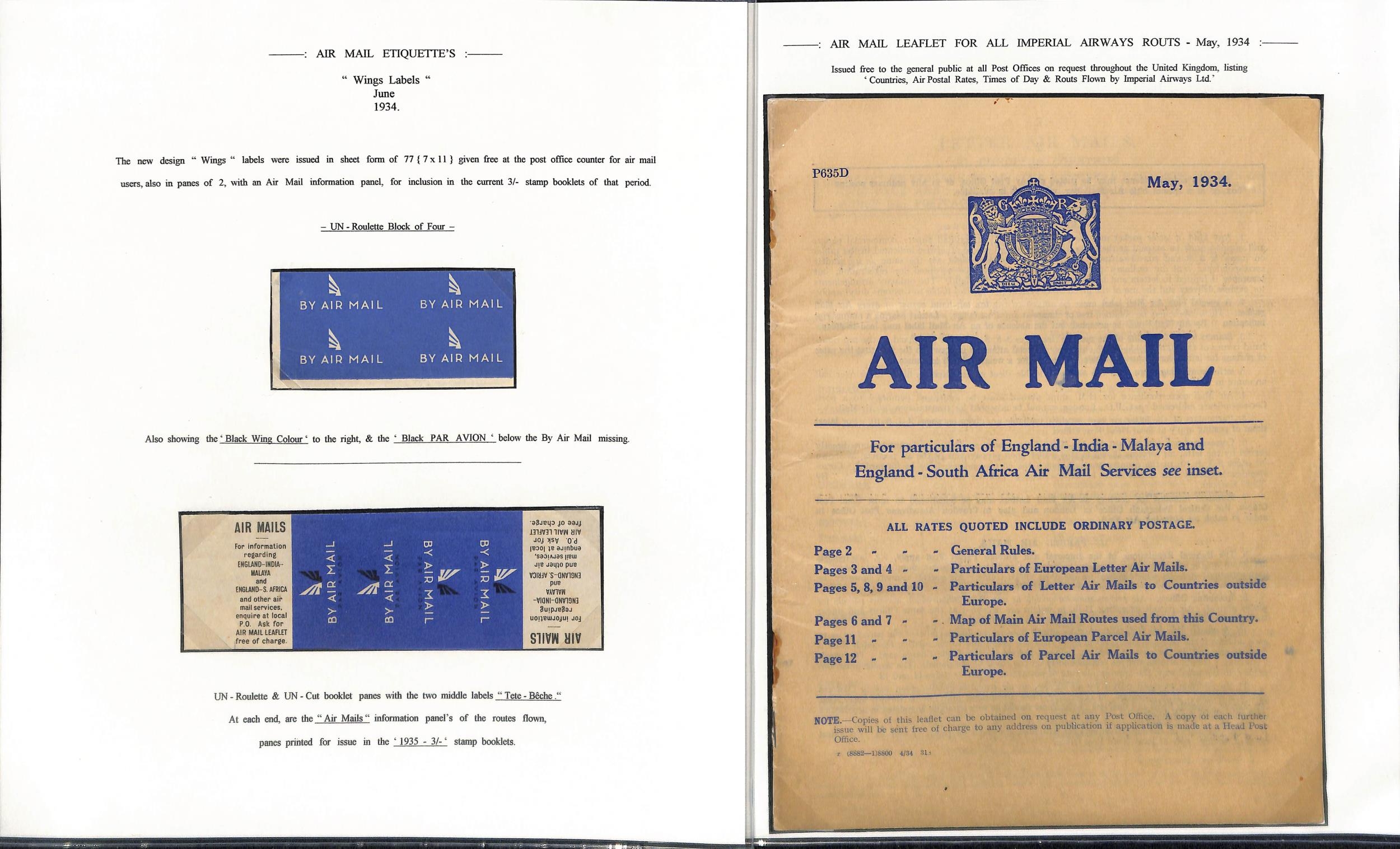Air Mail labels and leaflets. 1920-38 Labels and leaflets issued by the British Post Office or Imperial Airways including 1920 (Aug.) first G.P.O leaflet on Air Mail Services with an example of the first Air Mail label attached; 1921 (Apr.) European Air Mail timetable; other 1929-38 G.P.O pamphlets (9) and 1931 Air Mail timetable issued by Imperial Airways; c.1928-37 Air Mail bag labels (2) and a letter bundle label; Imperial Airways booklets of Air Mail labels (12, three exploded); Imperial Airways Air Mail publicity labels (7); 1930 postcard depicting the special blue Air Mail van and posting box, flown to Germany with first day use of the "LONDON F.S / AIR MAIL" c.d.s; 1937 Christmas concession labels waiving the surcharge on underpaid mail, British P.O labels unused (2) or on a cover from South Africa, also similar unused labels issued in South Africa (strip of five), Kenya (2) or Southern Rhodesia. A fine and interesting lot. (46).