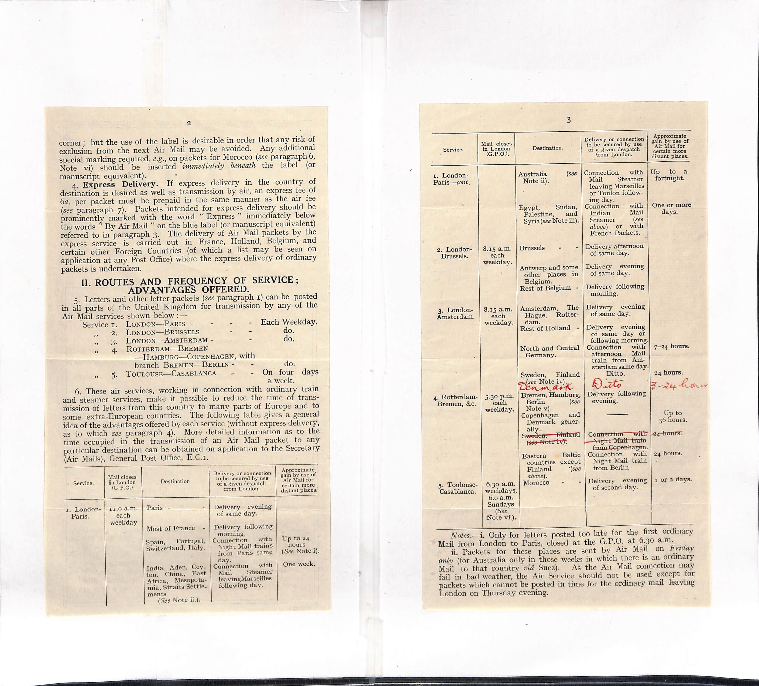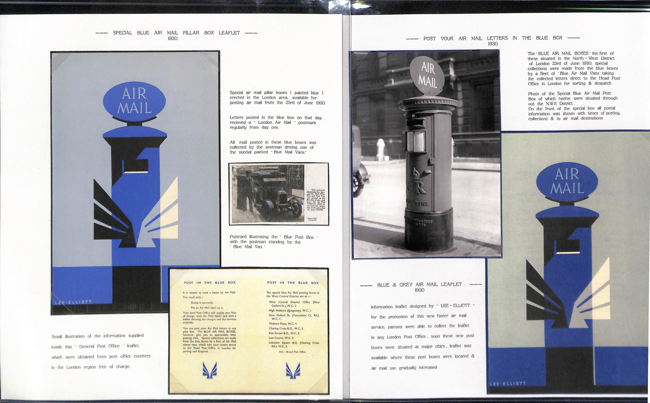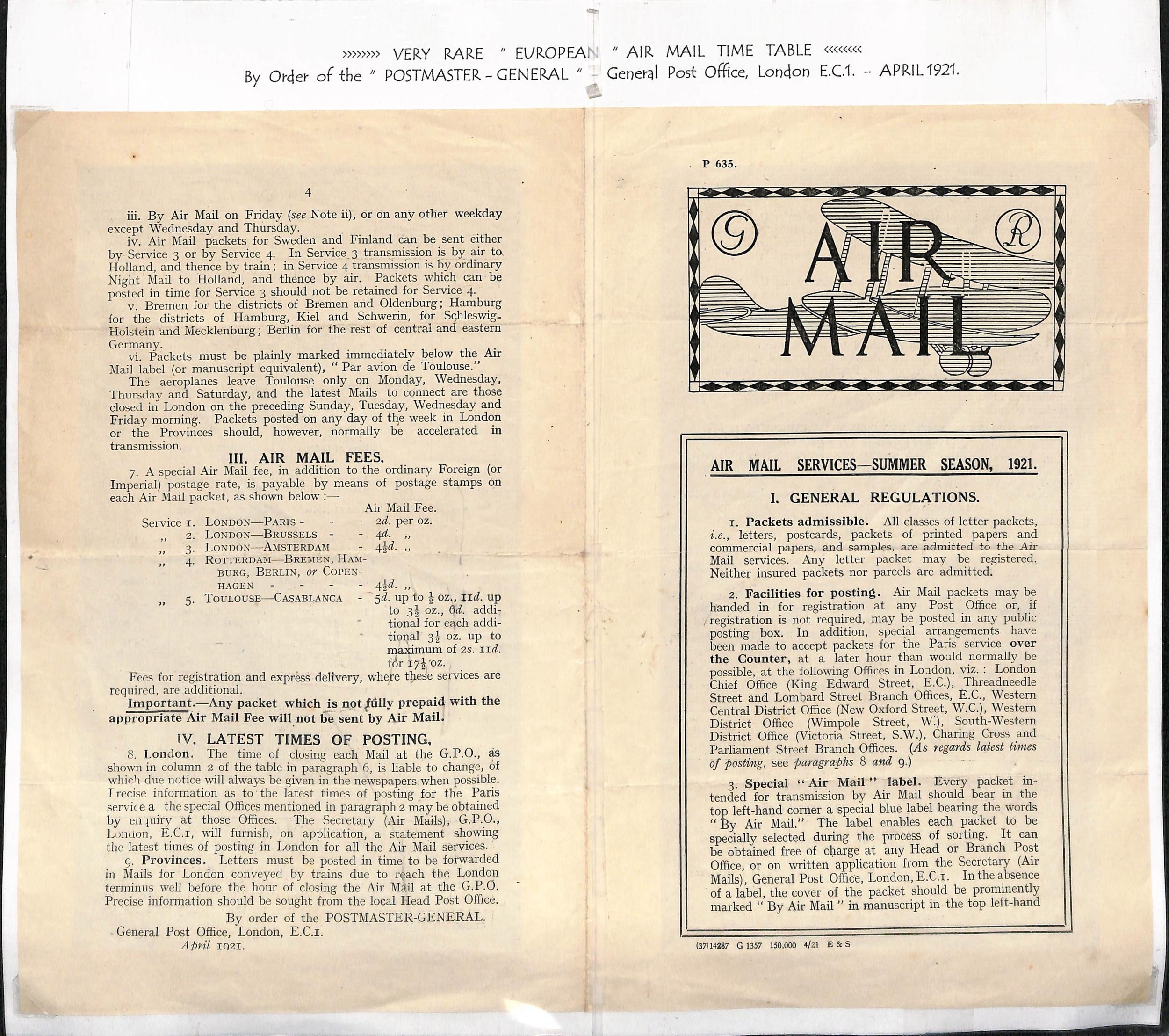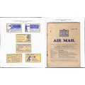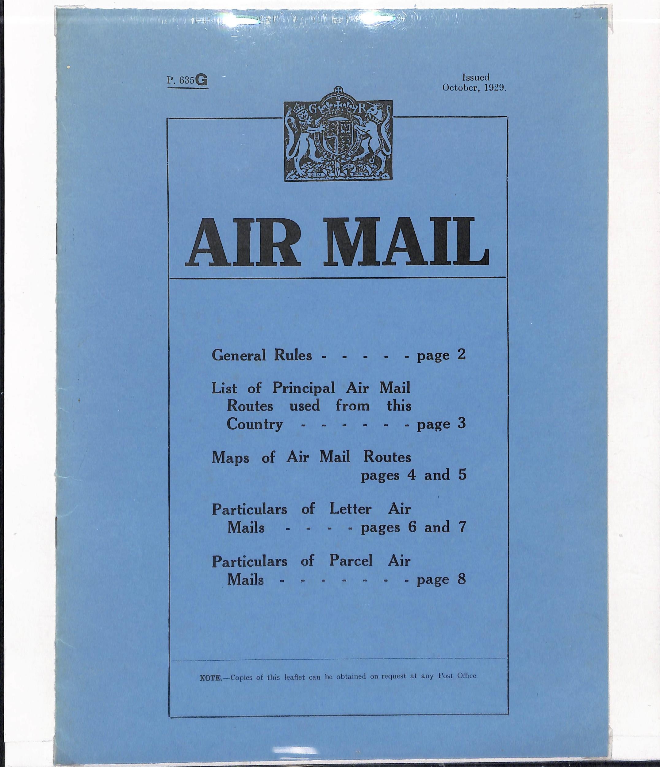 Air Mail labels and leaflets. 1920-38 Labels and leaflets issued by the British Post Office or Imperial Airways including 1920 (Aug.) first G.P.O leaflet on Air Mail Services with an example of the first Air Mail label attached; 1921 (Apr.) European Air Mail timetable; other 1929-38 G.P.O pamphlets (9) and 1931 Air Mail timetable issued by Imperial Airways; c.1928-37 Air Mail bag labels (2) and a letter bundle label; Imperial Airways booklets of Air Mail labels (12, three exploded); Imperial Airways Air Mail publicity labels (7); 1930 postcard depicting the special blue Air Mail van and posting box, flown to Germany with first day use of the "LONDON F.S / AIR MAIL" c.d.s; 1937 Christmas concession labels waiving the surcharge on underpaid mail, British P.O labels unused (2) or on a cover from South Africa, also similar unused labels issued in South Africa (strip of five), Kenya (2) or Southern Rhodesia. A fine and interesting lot. (46).