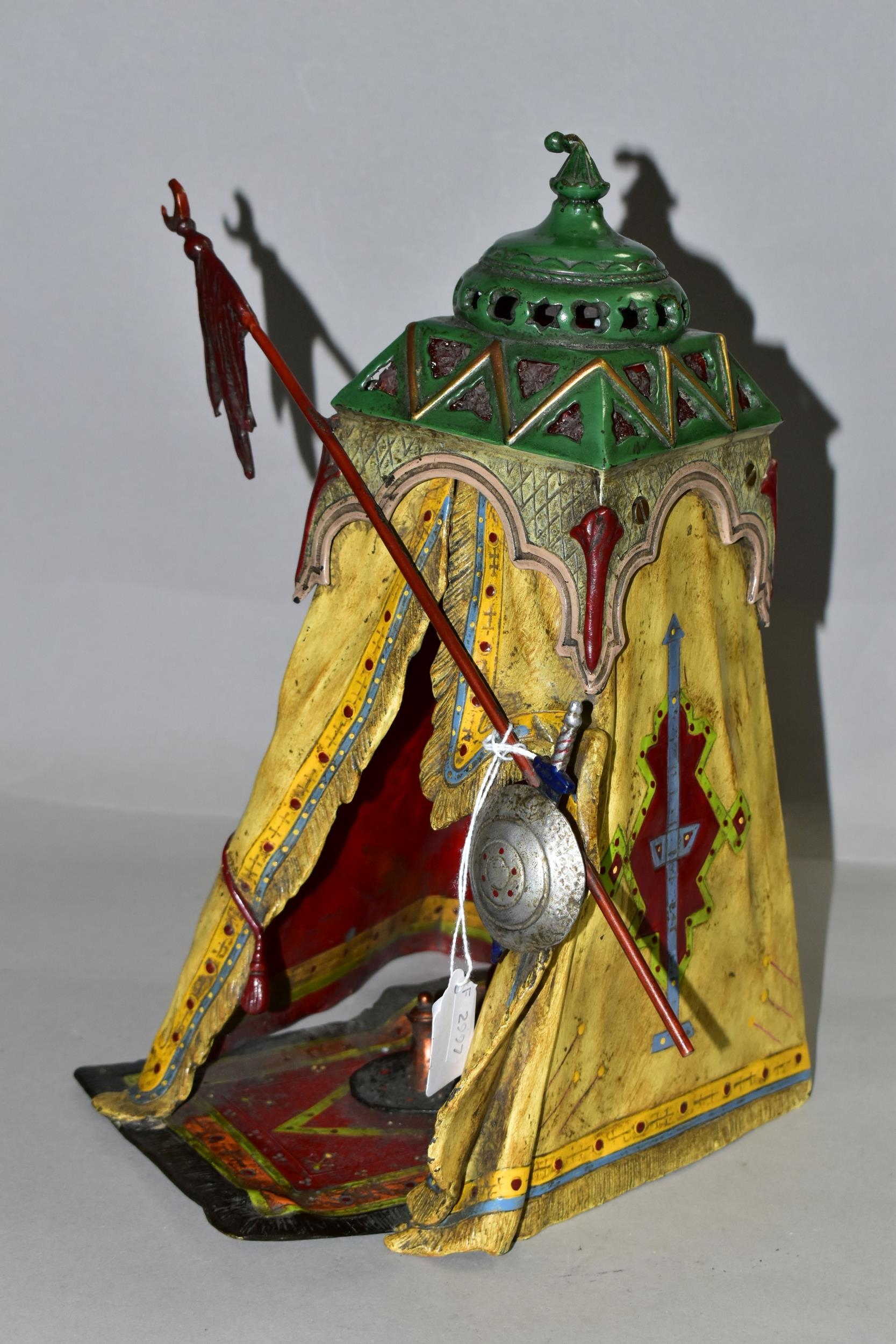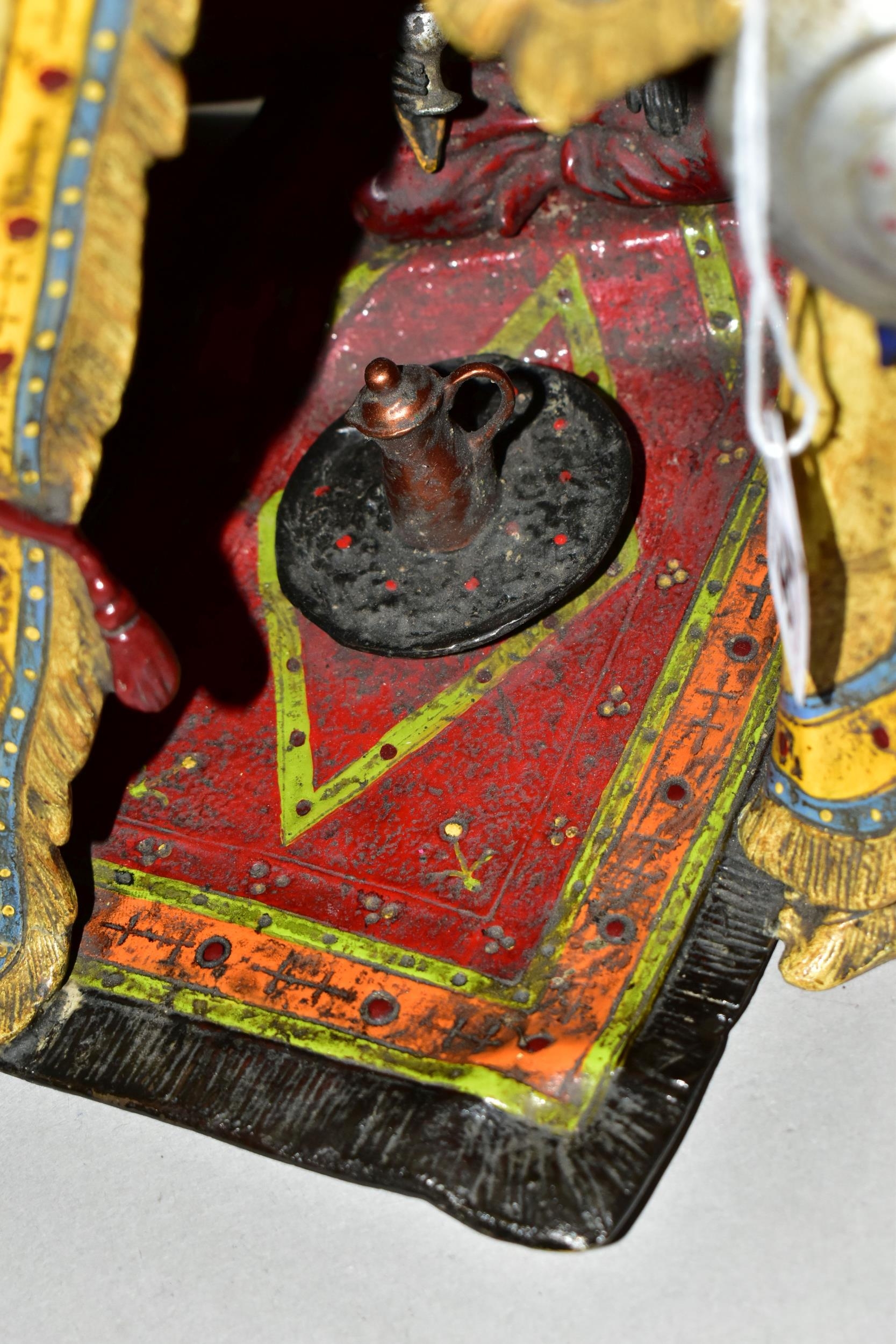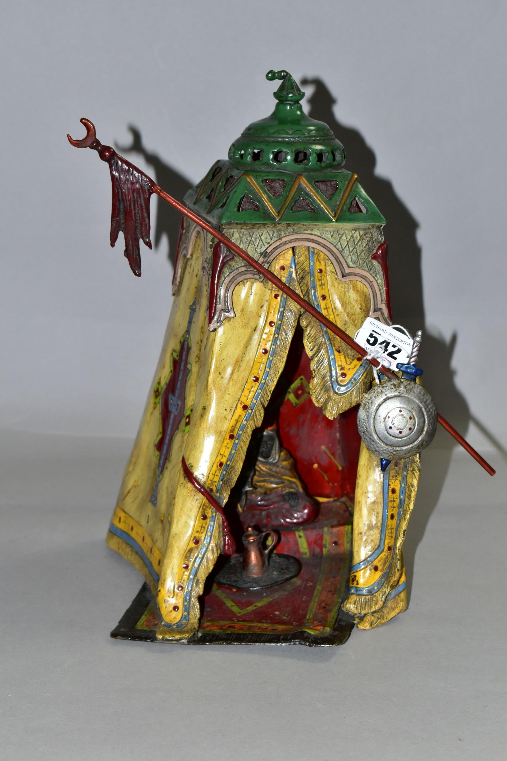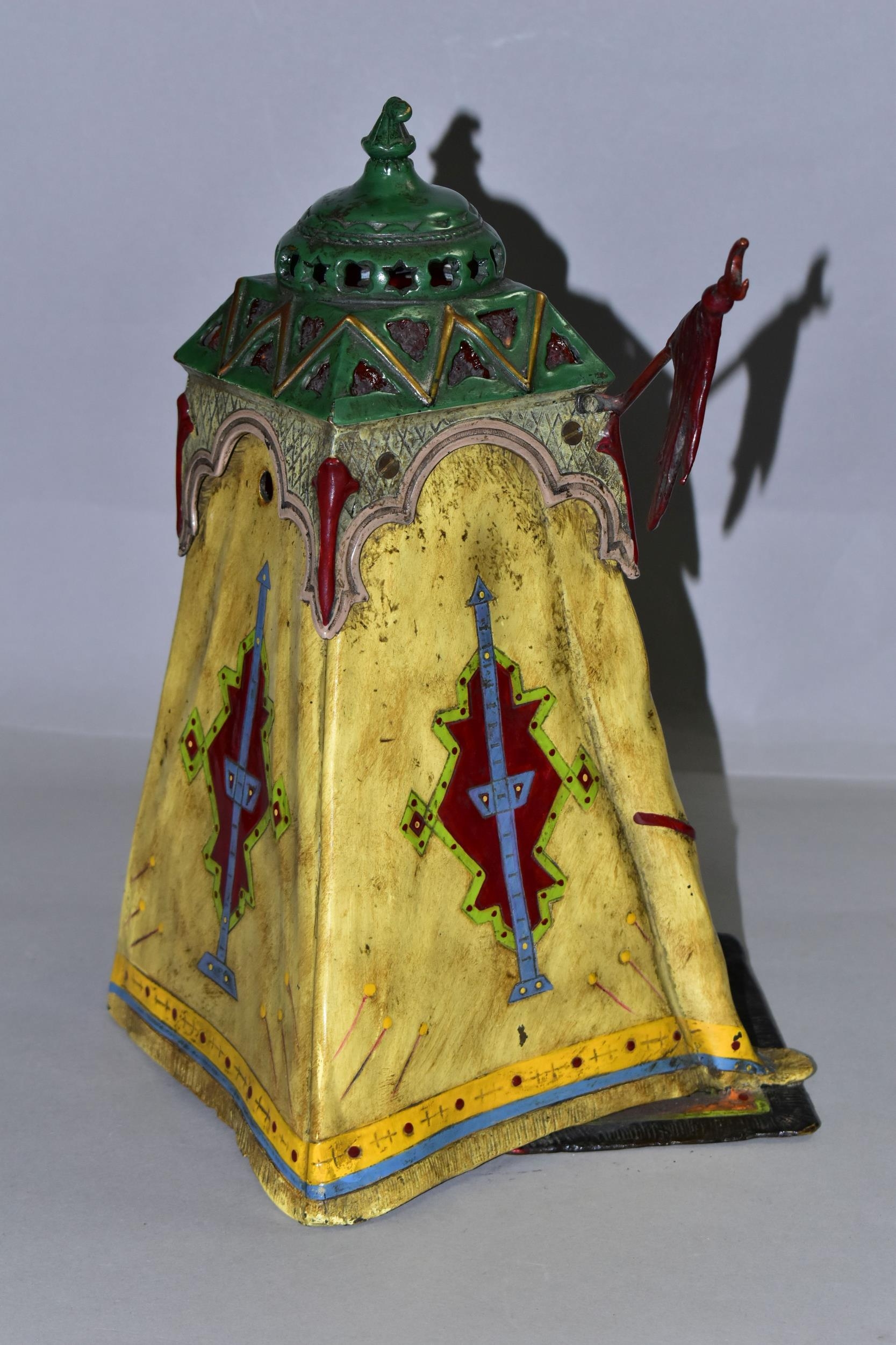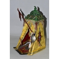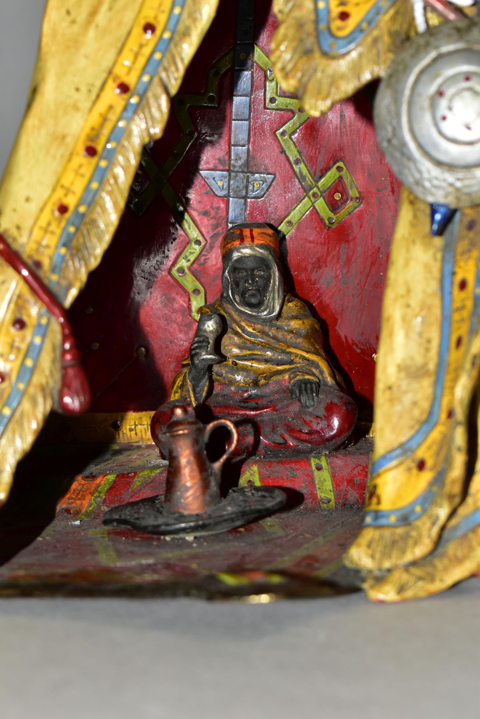 A COLD PAINTED BRONZE AND SPELTER LAMP IN THE STYLE OF FRANZ BERGMAN, modelled in the form of a carpet seller with coffee pot seated within a small Egyptian tent, no electrical fittings, height 33cm (Condition Report: top of tent is bent, glass panels are all intact but slightly gappy in the corners, some areas of wear to the paint)