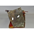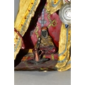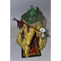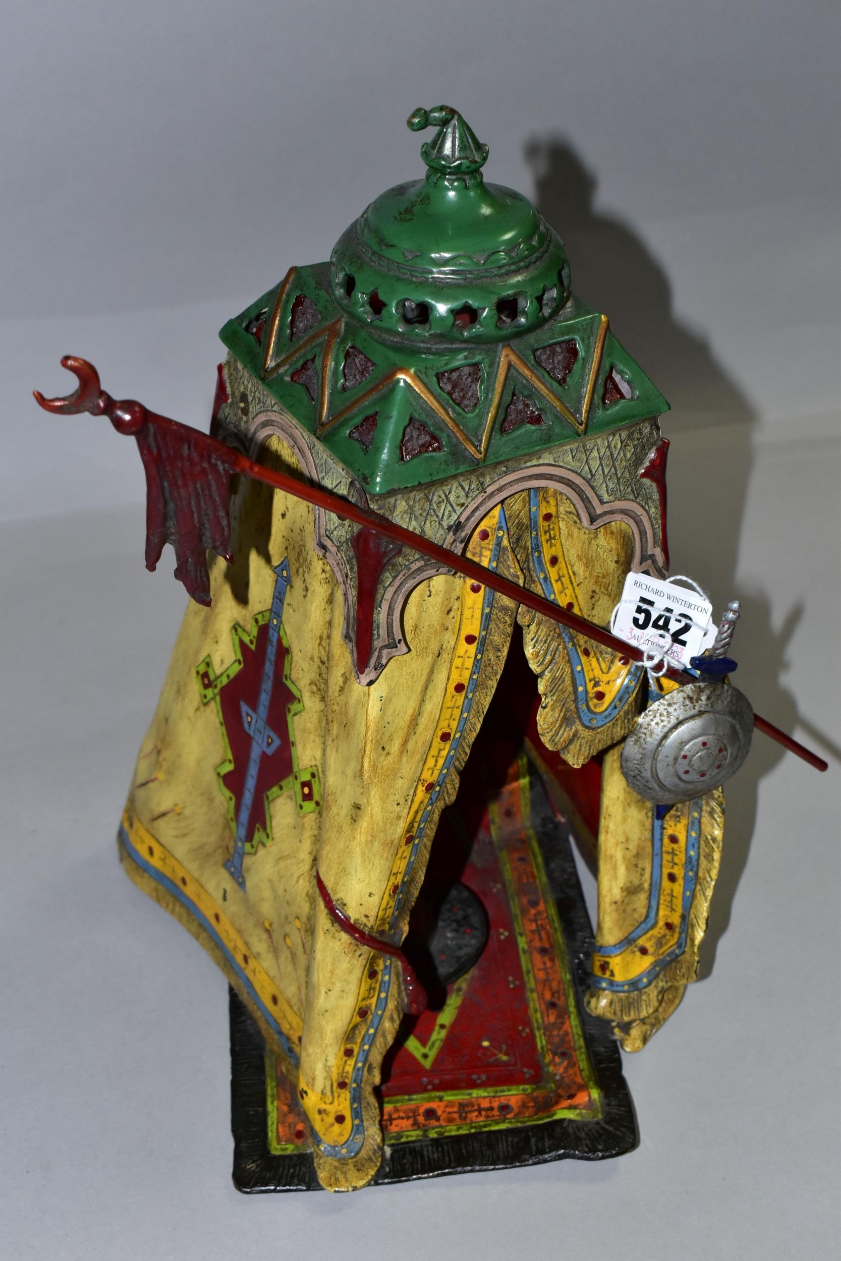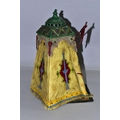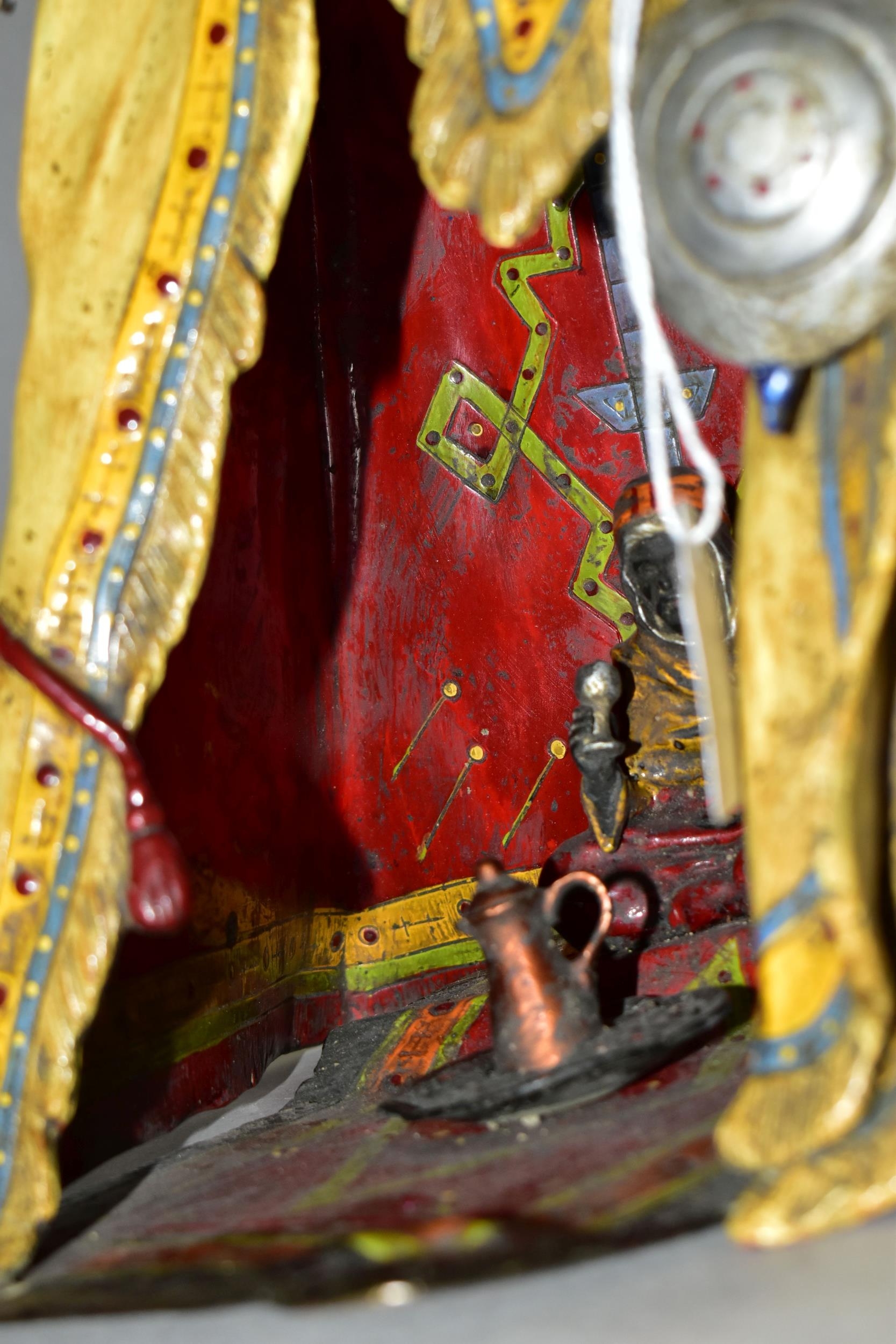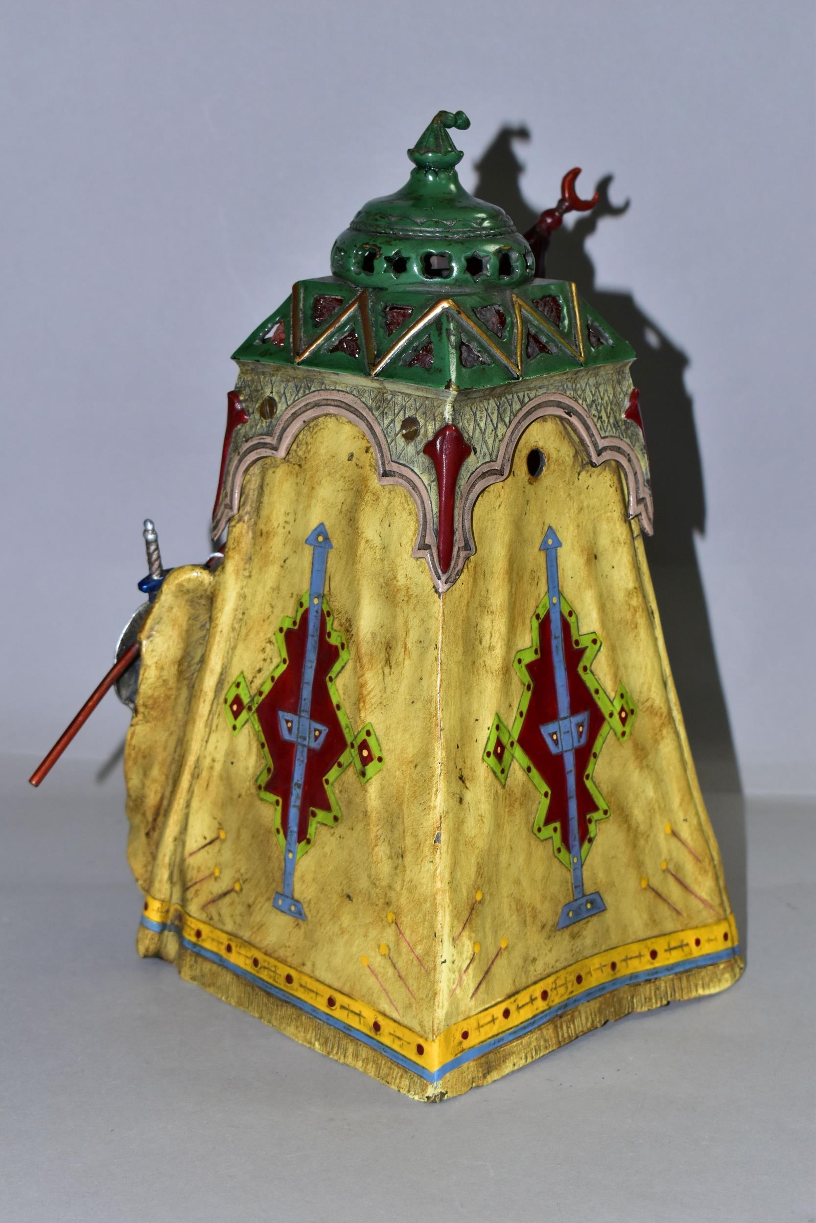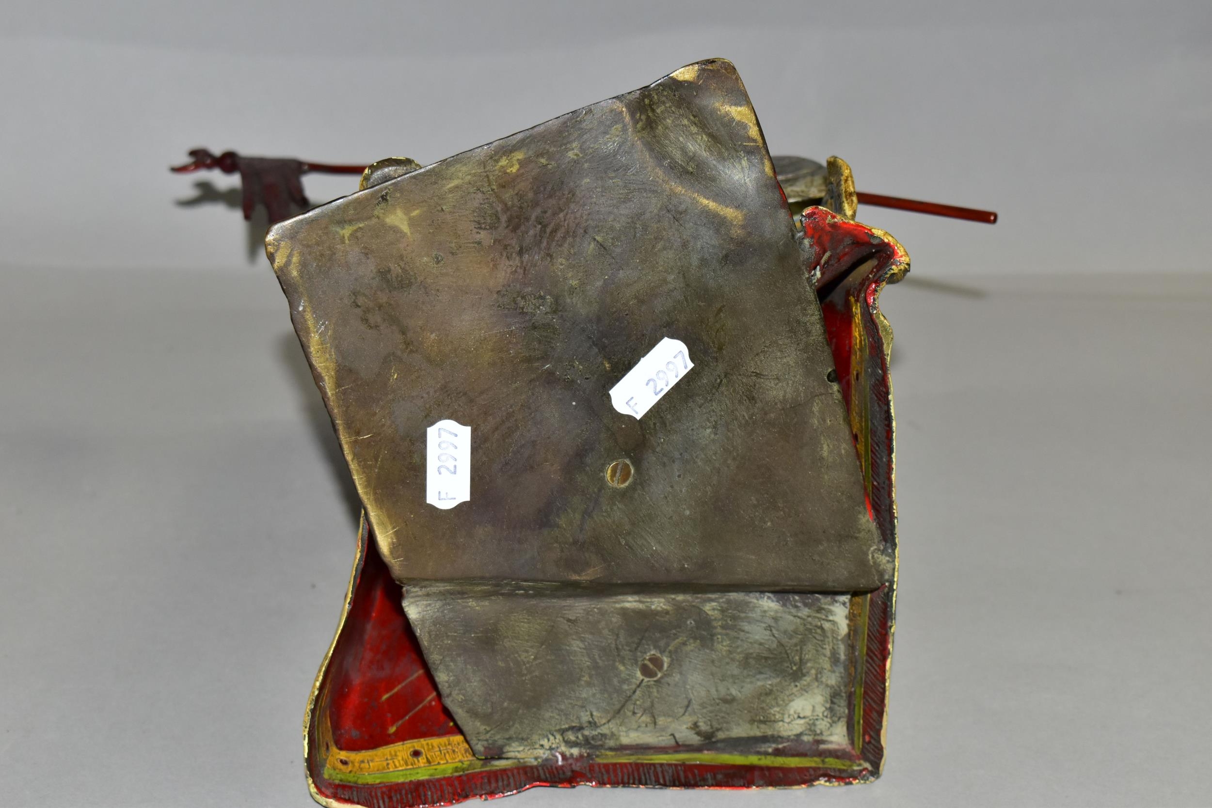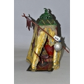 A COLD PAINTED BRONZE AND SPELTER LAMP IN THE STYLE OF FRANZ BERGMAN, modelled in the form of a carpet seller with coffee pot seated within a small Egyptian tent, no electrical fittings, height 33cm (Condition Report: top of tent is bent, glass panels are all intact but slightly gappy in the corners, some areas of wear to the paint)