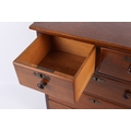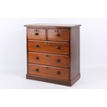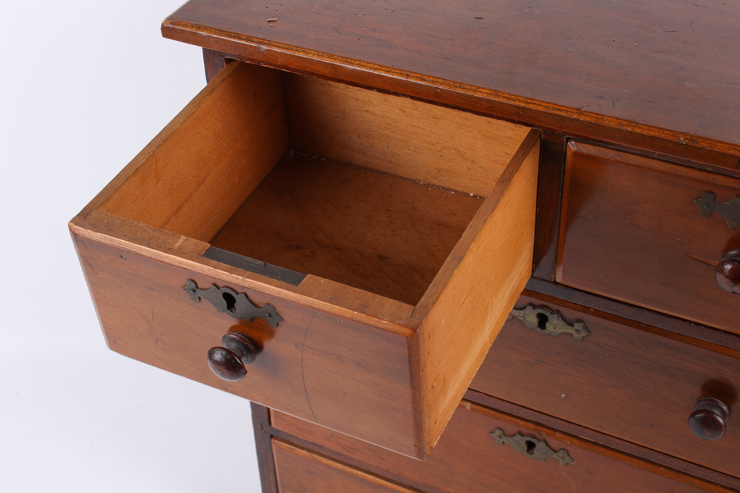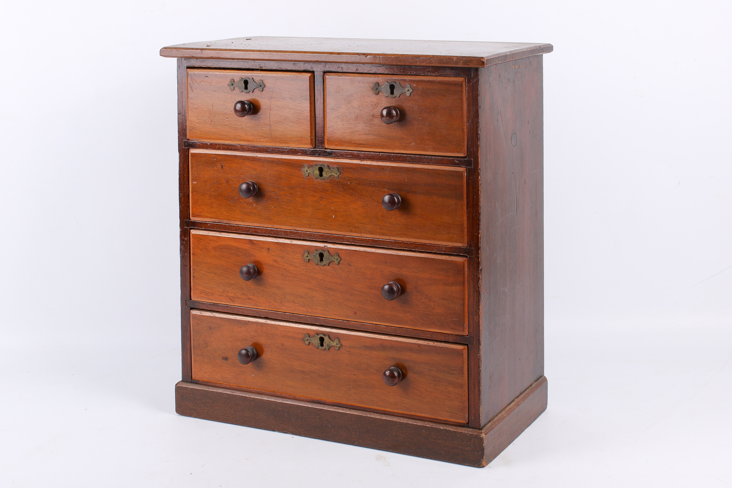An Edwardian mahogany miniature chest of drawers, Two short over three long drawers, having brass escutcheons and turned handles, raised on a plinth case. Two paper labels to the back reading 'To Dear Barbara on her third Birthday. With love from F-a--ice' and 'Susanna, given by her mother June 12th 1947- Happy Birthday'. H37cm x W35cm x D17cm