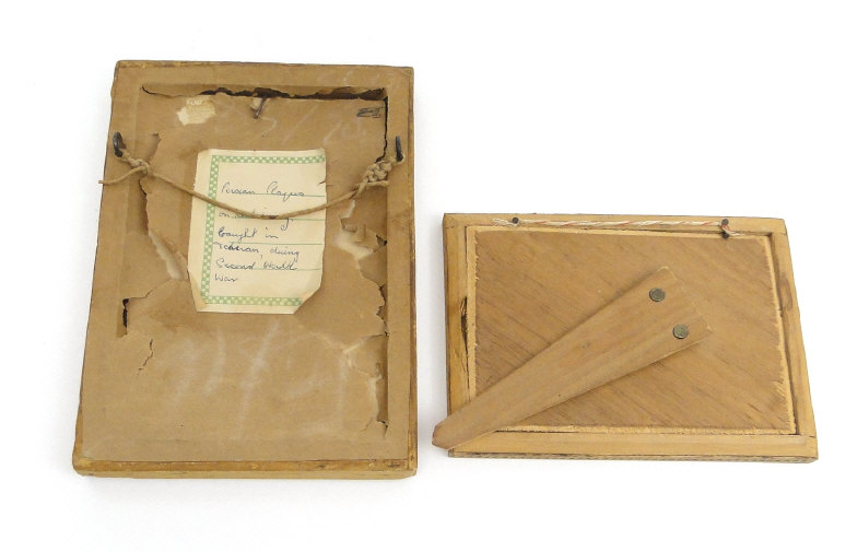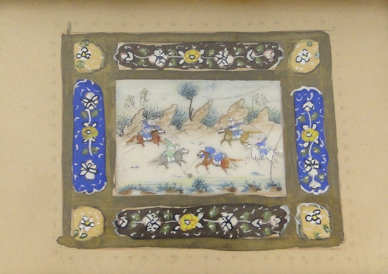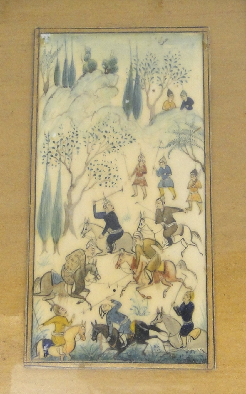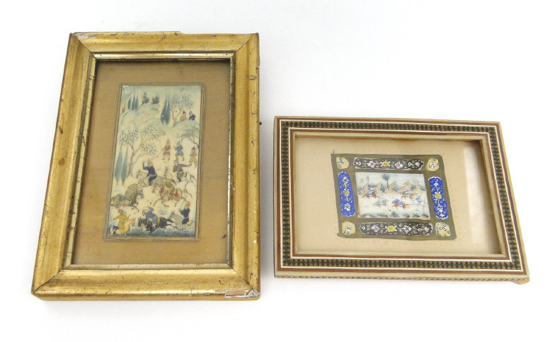 Two Middle Eastern paintings onto bone panel of warriors, each framed, the larger 11cm x 6cm excluding the frames