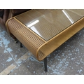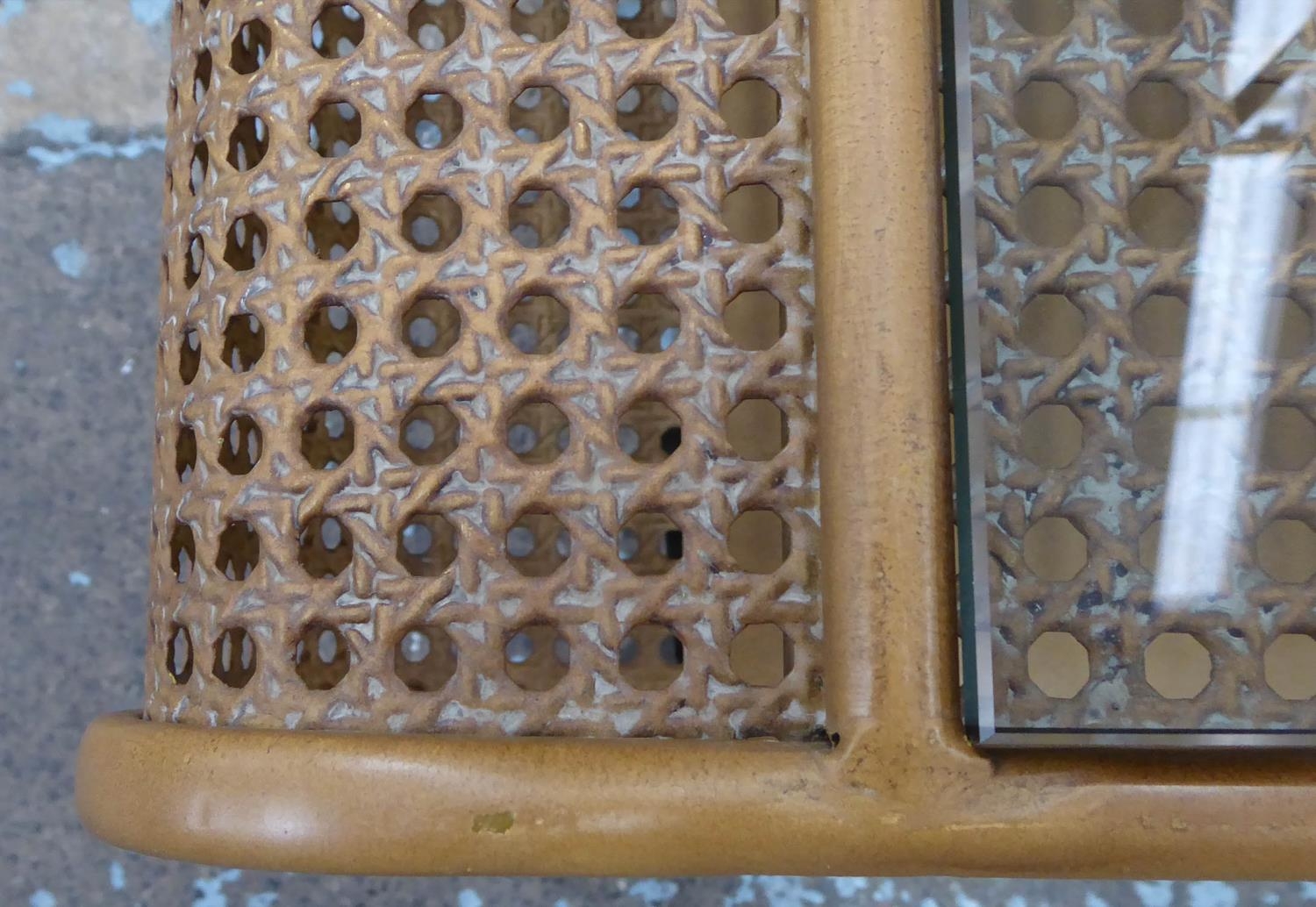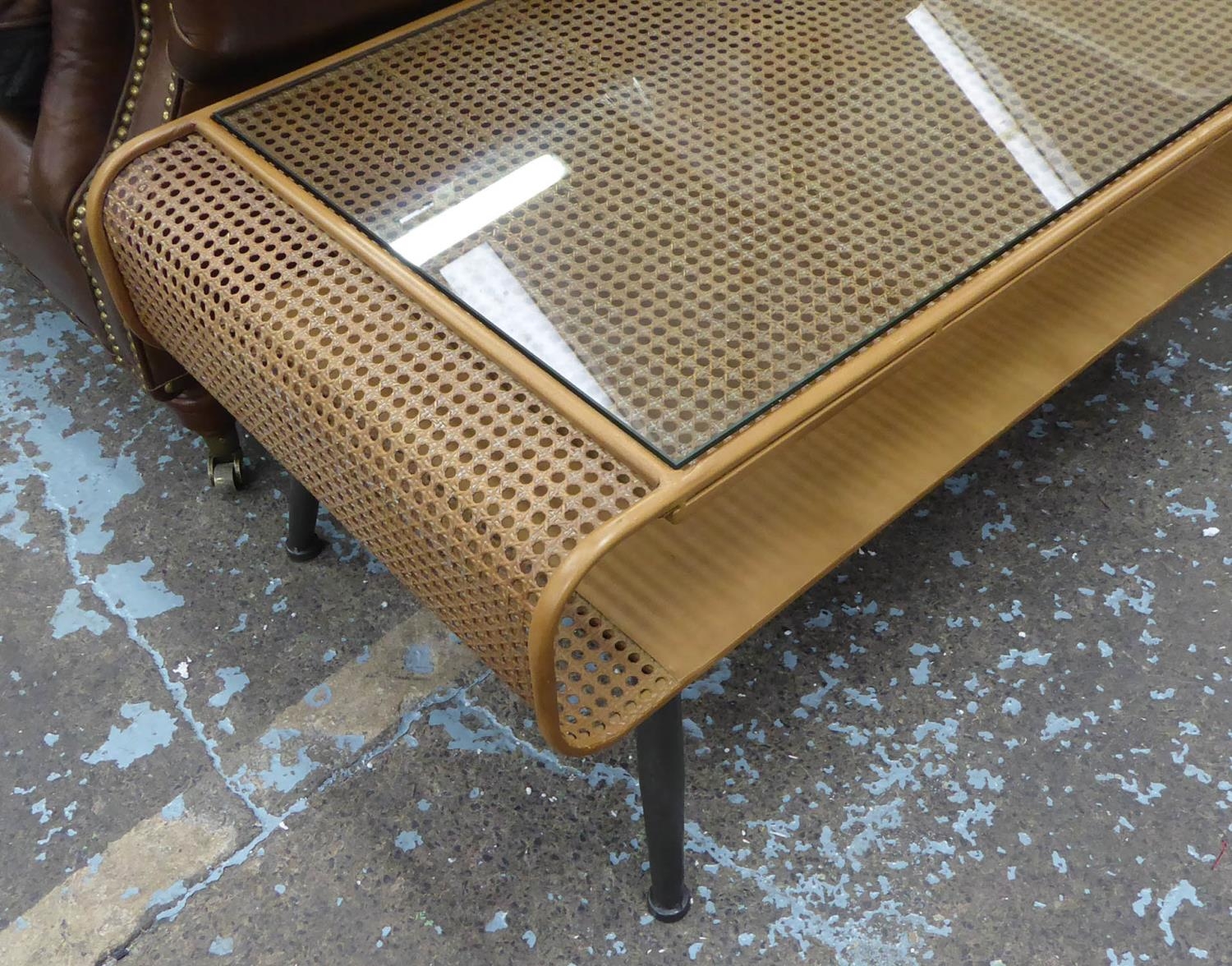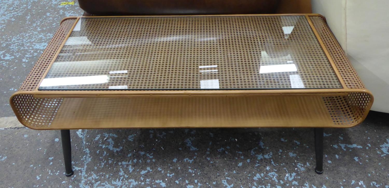 LOW TABLE, 1960's Danish style, faux rattan with glass top, 120cm x 50cm x 45cm.