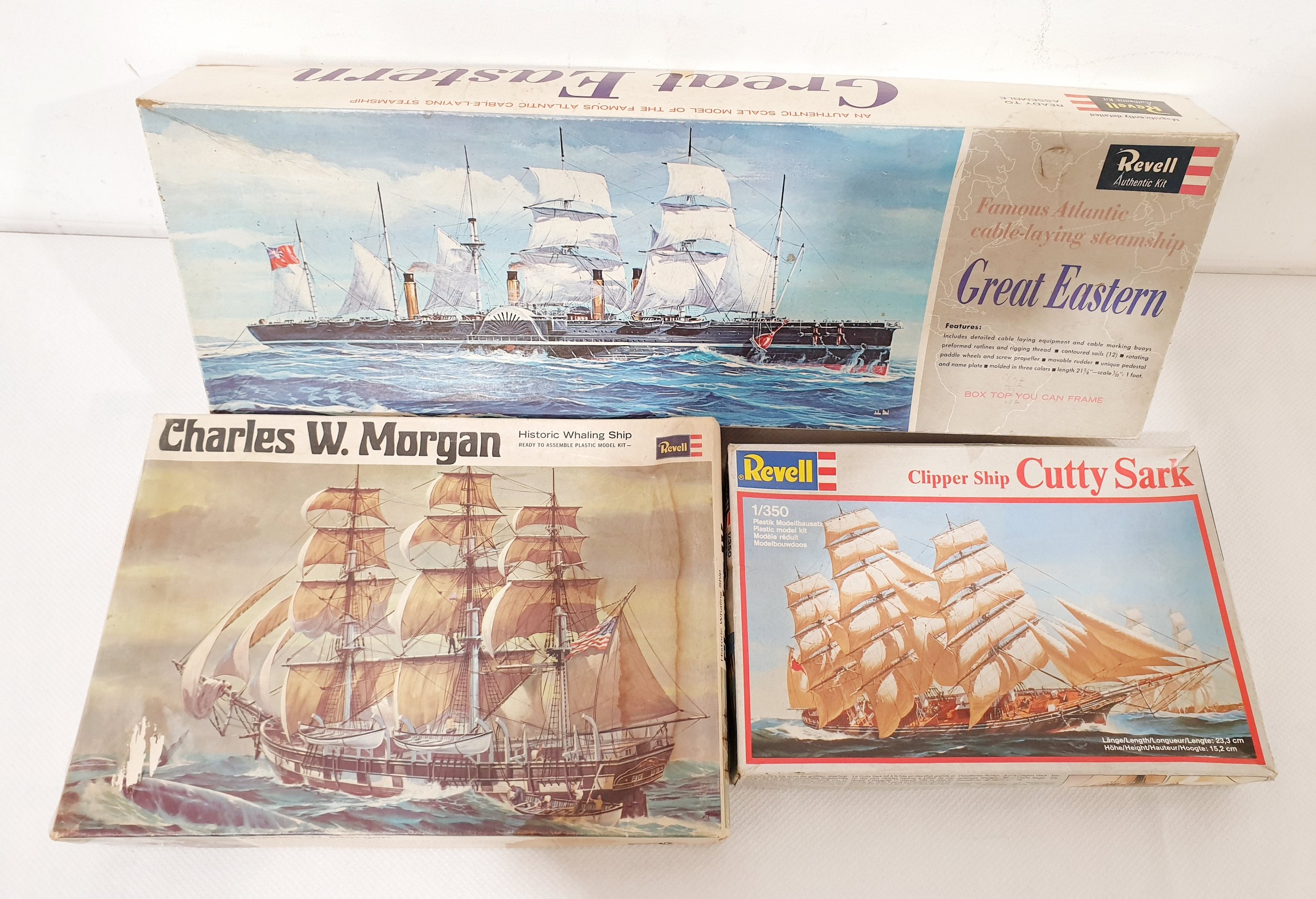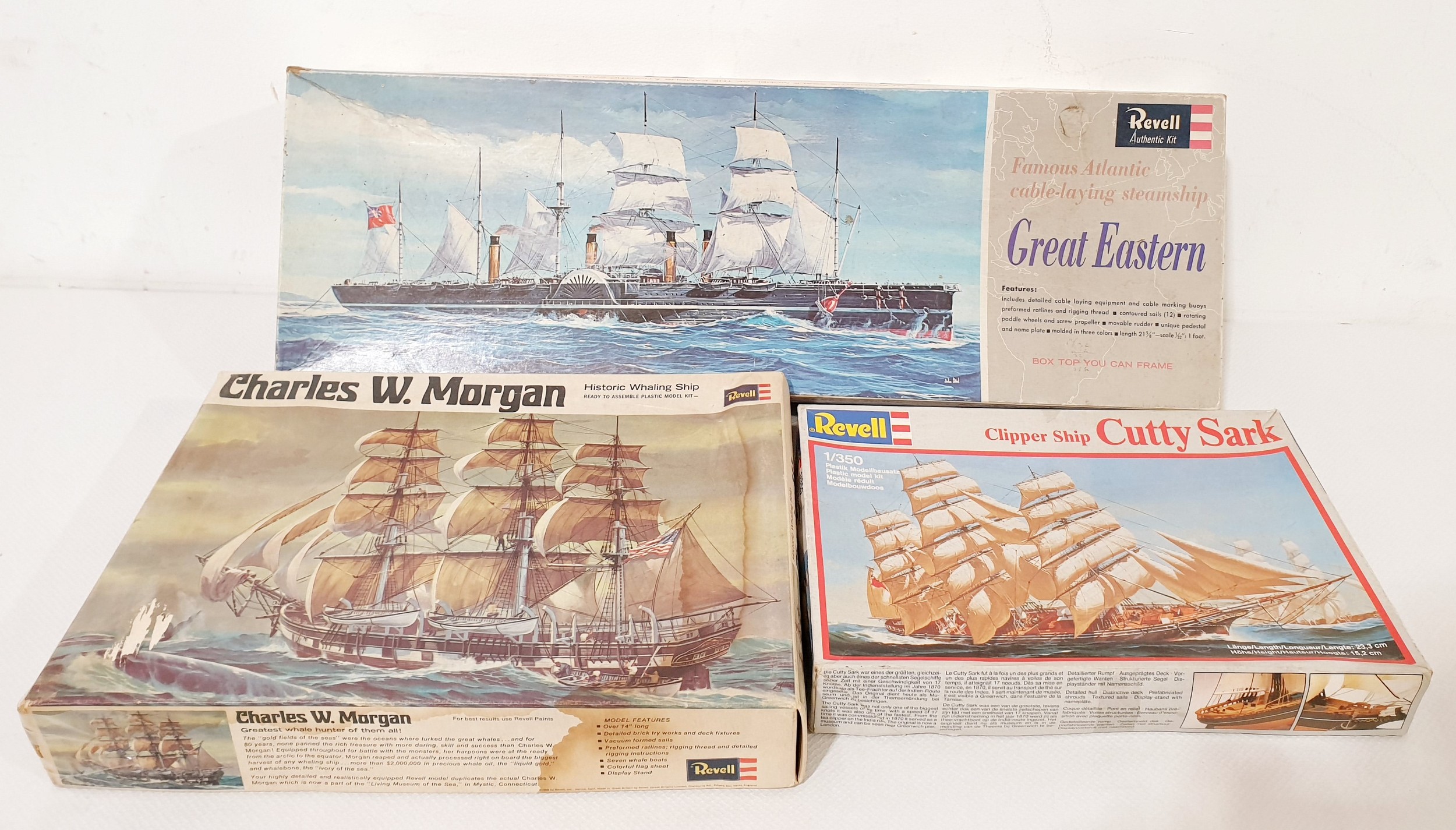 Three Revell model ship kits 'Charles W Morgan', 1:384 scale 'Great Eastern' & 1:350 scale 'Cutty Sark'. No Shipping. Arrange collection or your own packer and shipper, please.