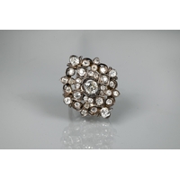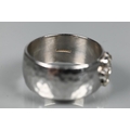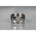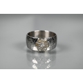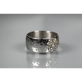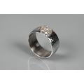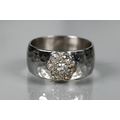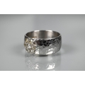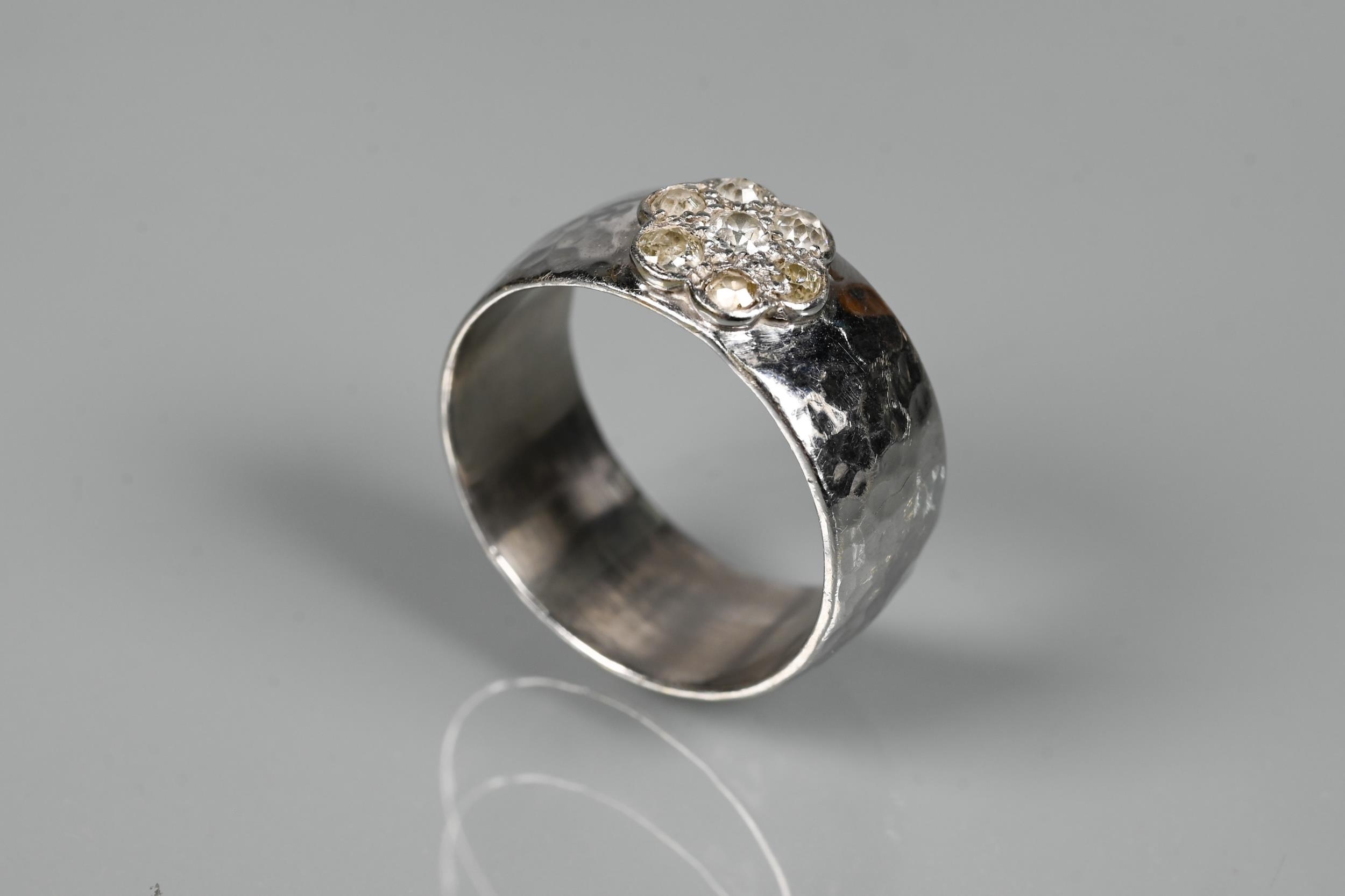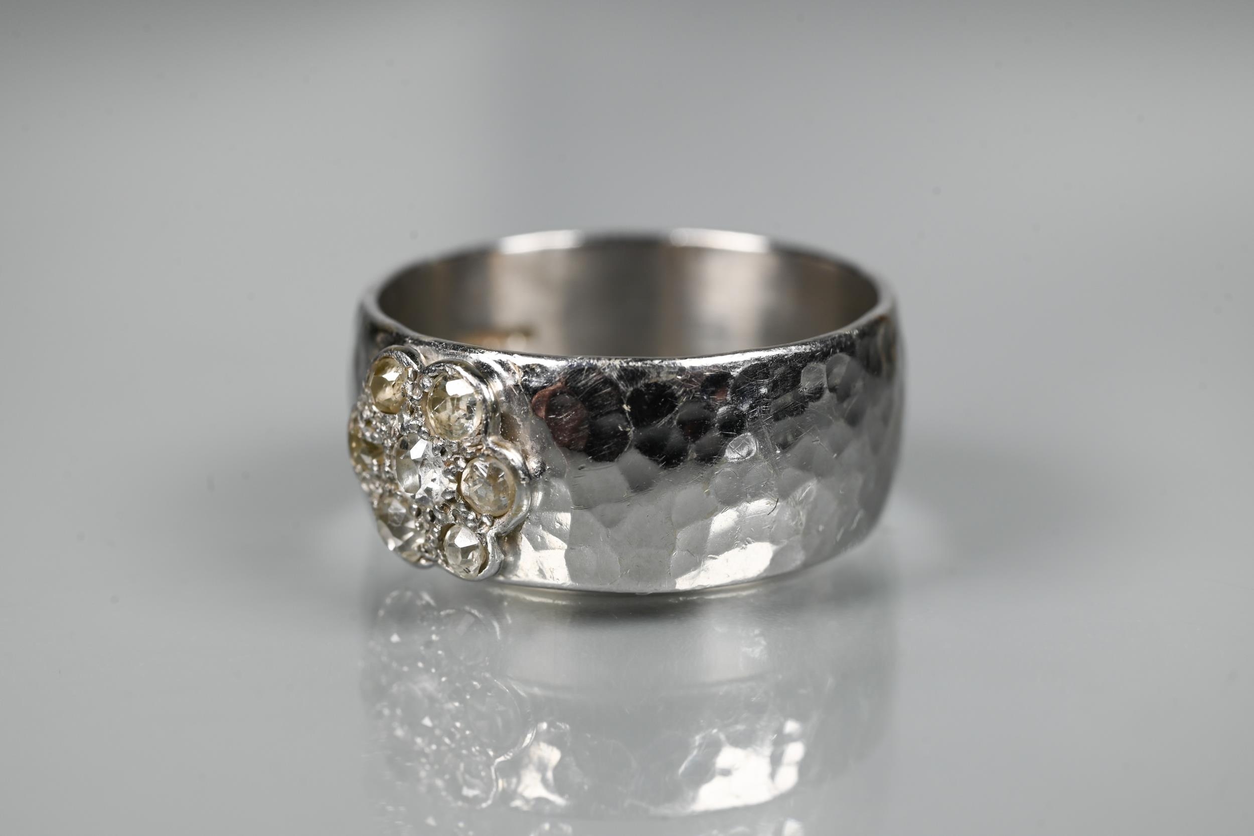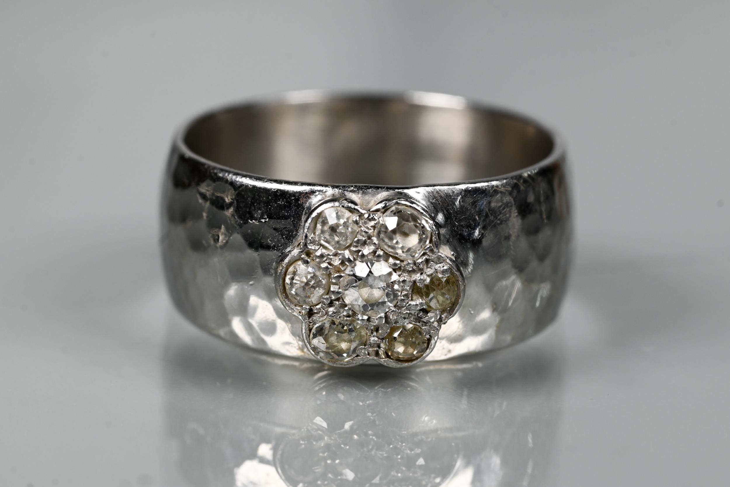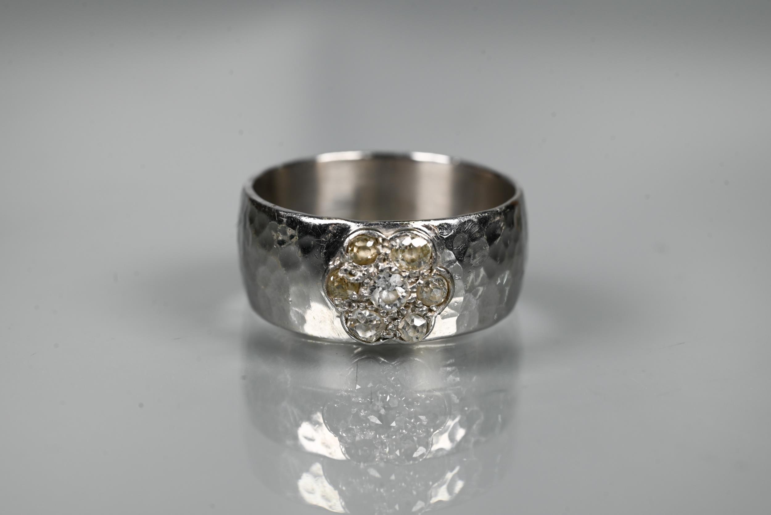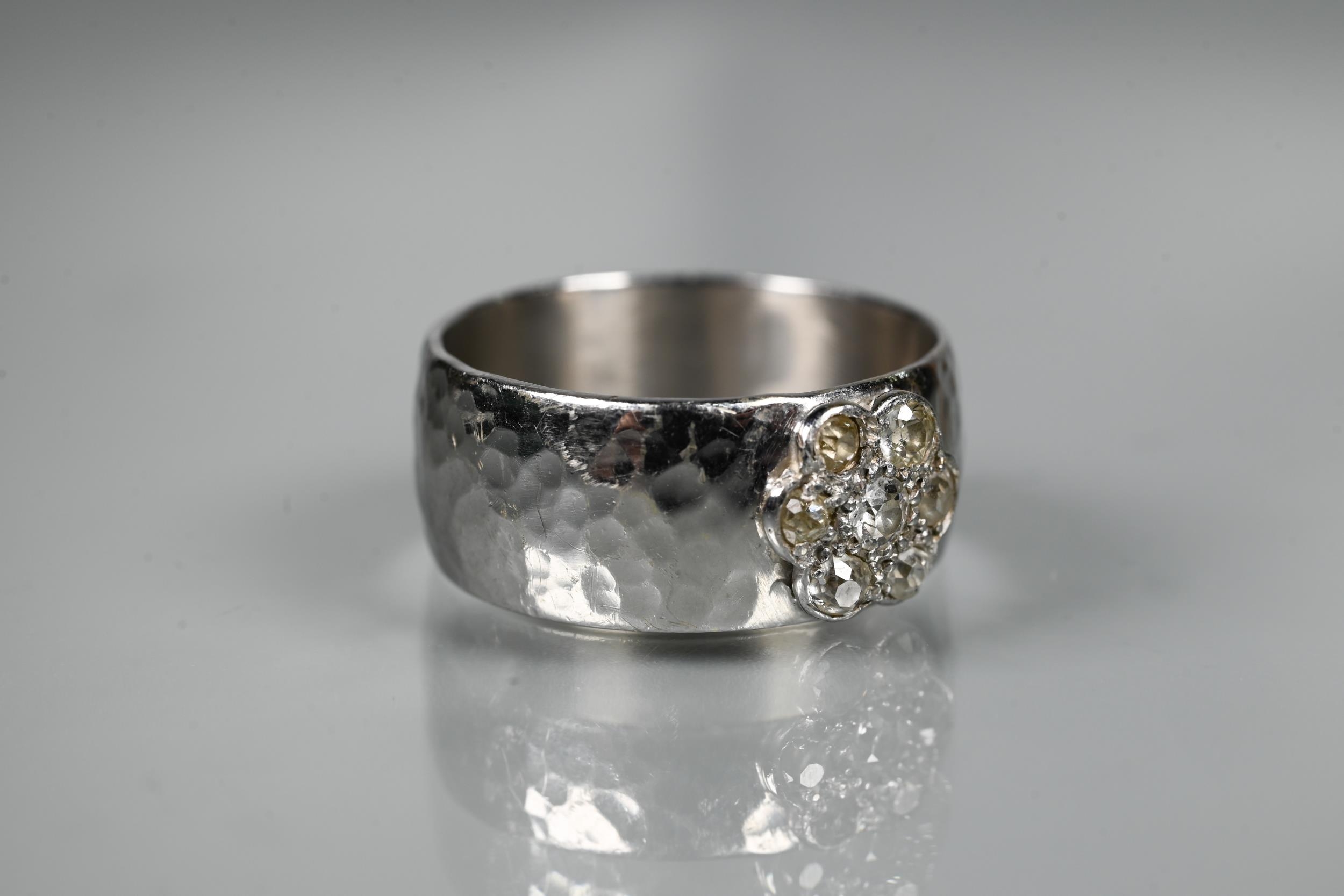 A contemporary 9ct white gold wide band with hammered finish, set with seven-stone diamond cluster, ring size R, approx 8.7g all in