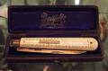 Cased mother of pearl handle pen knife having Sheffield silver blade.
