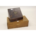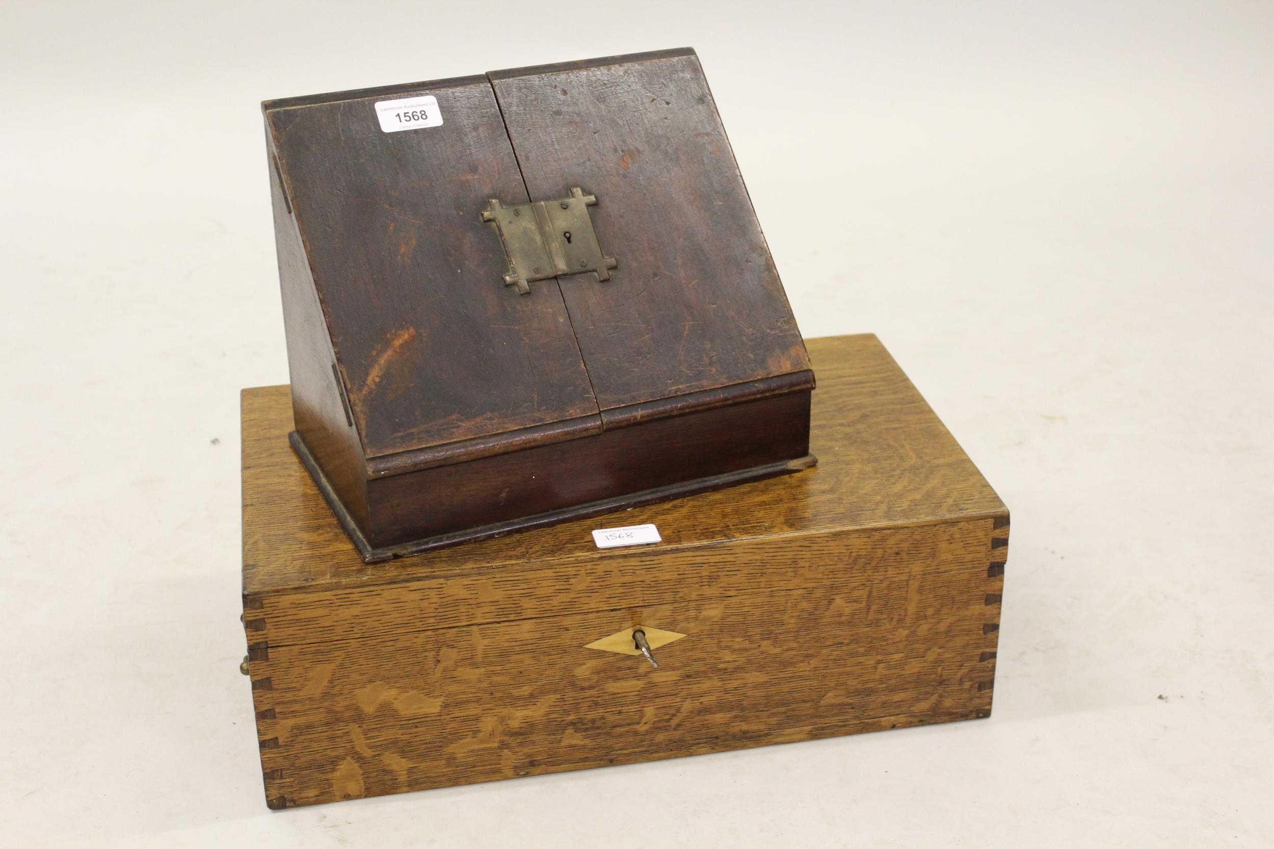 Late 19th / early 20th Century stationery box, the sloping front with hinged doors enclosing fitted interior, together with an oak fold-over writing slope with brass carrying handles