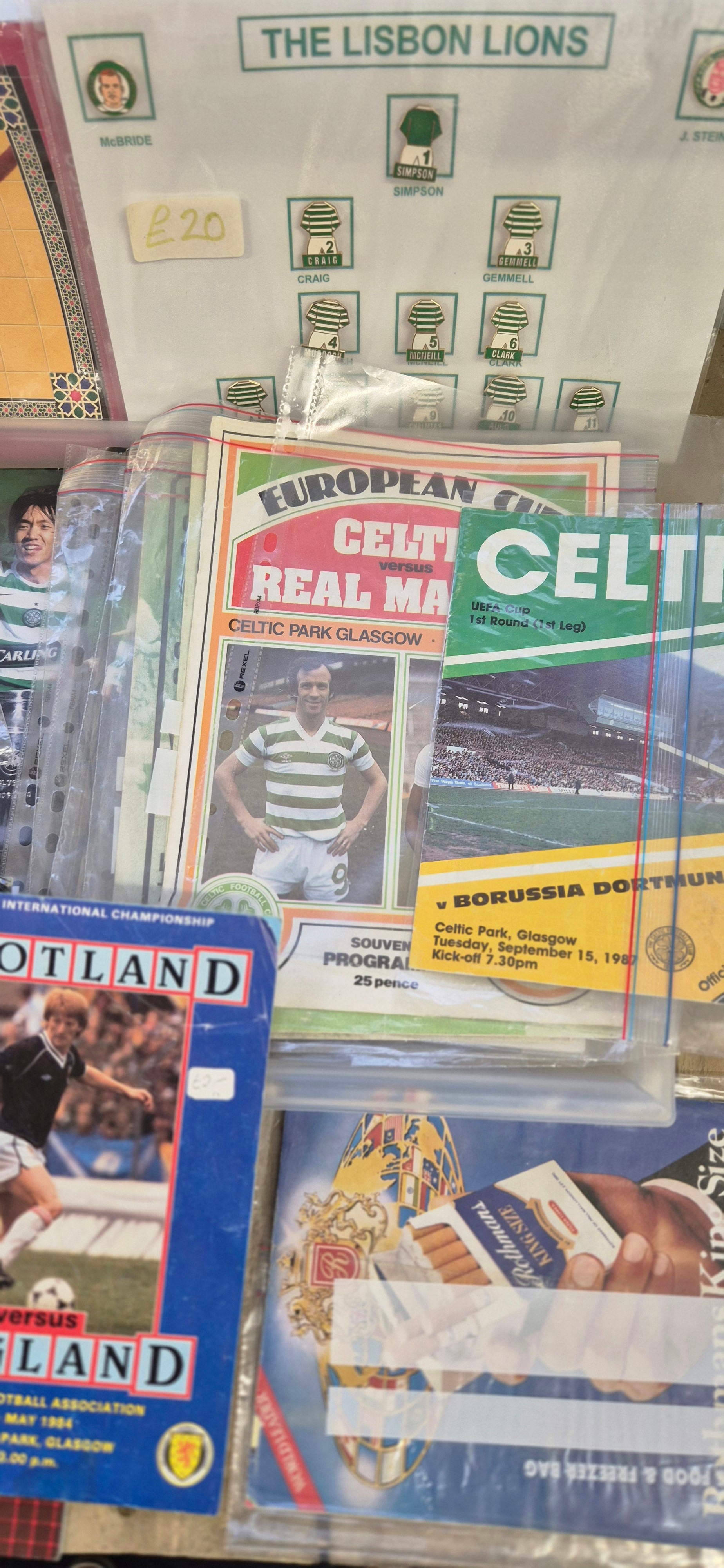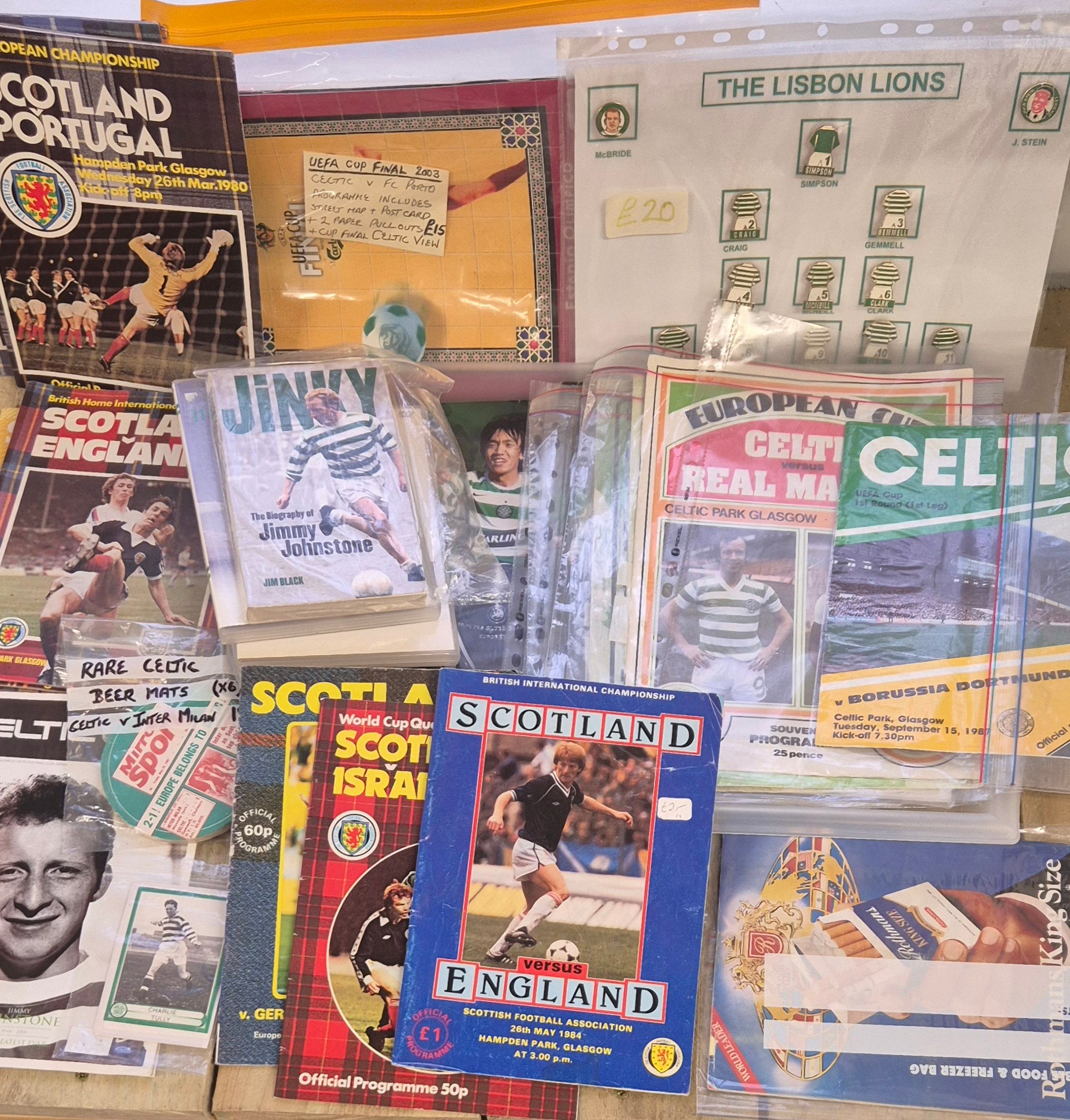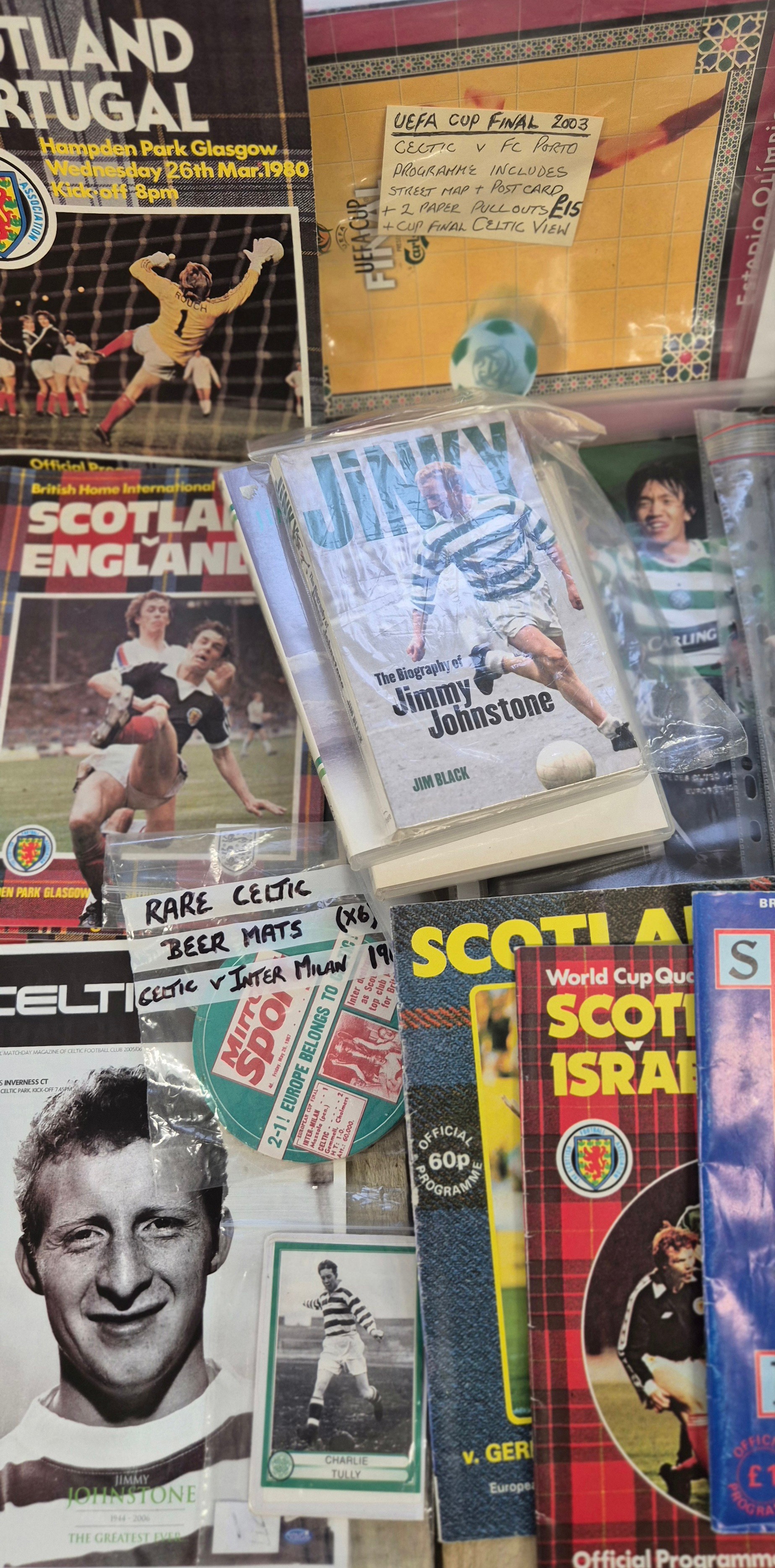 Large Collection of Scottish Football Programs & Memorabilia; Lisbon Lions Pin Badges, Celtic vs Inter Milan Beermats, Jinky Book, Celtic European programmes 1980's-present, Seville final programme with newspaper and 13 1980's Scotland programmes.