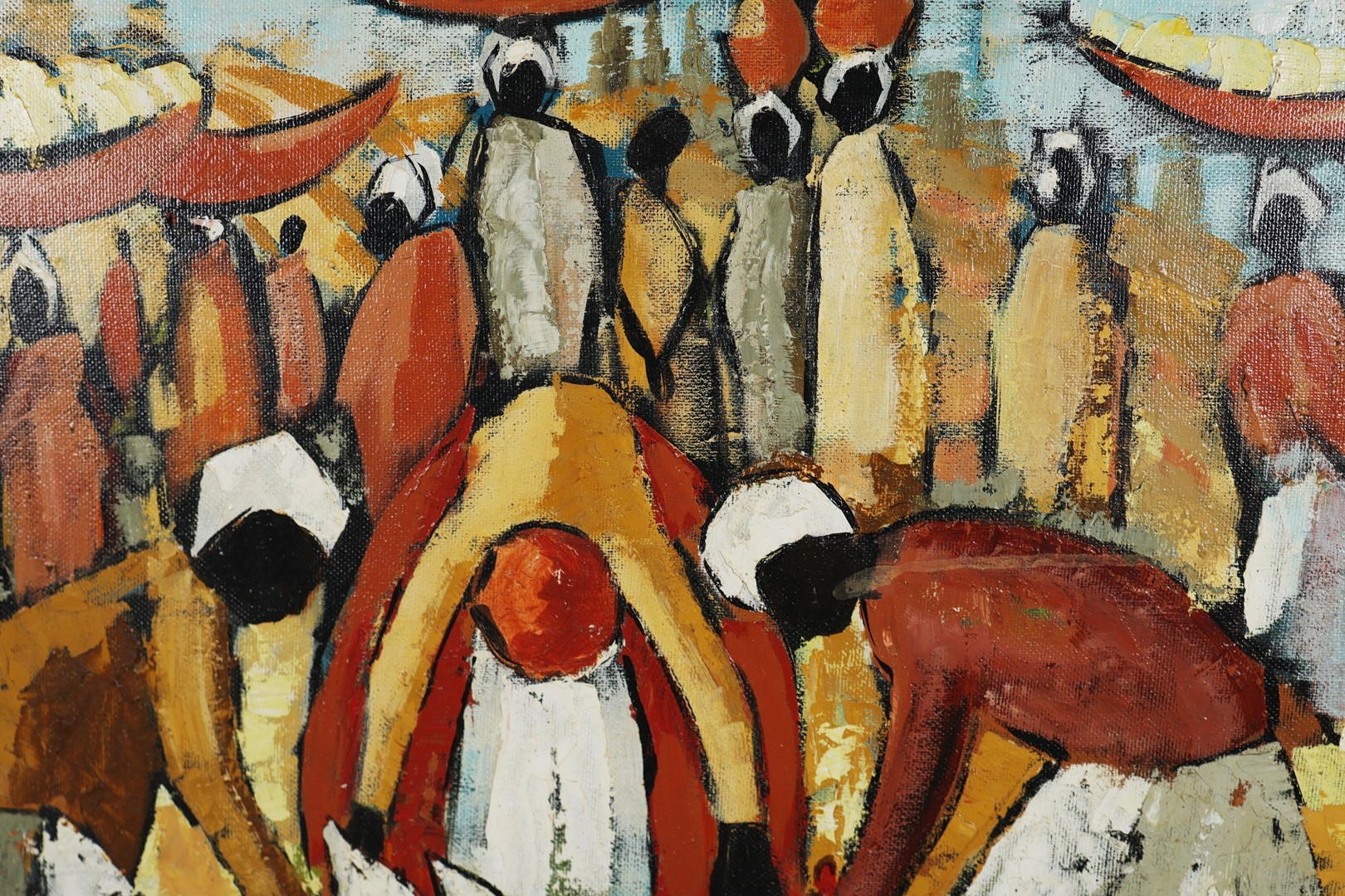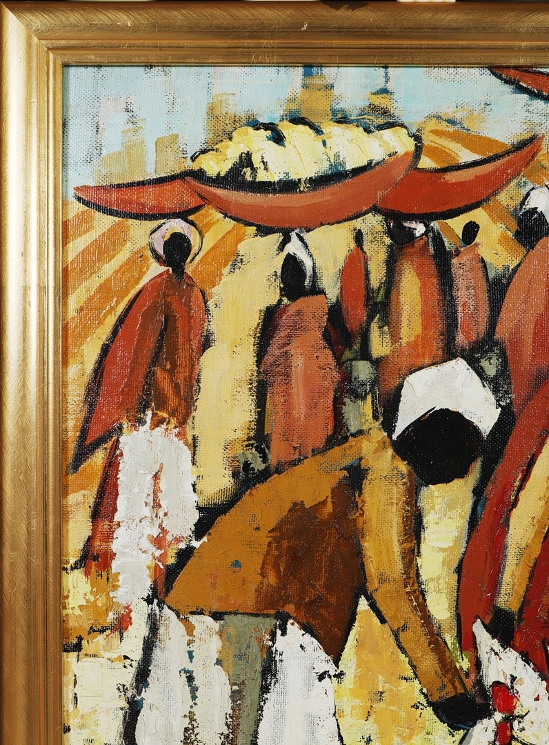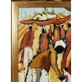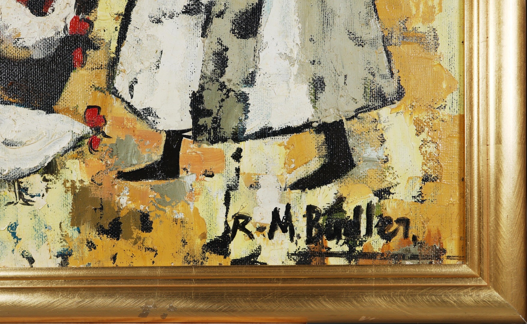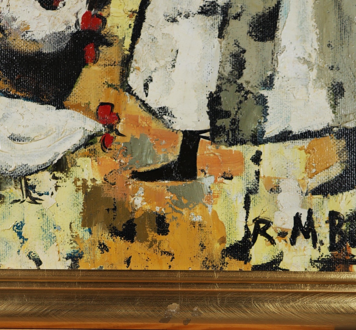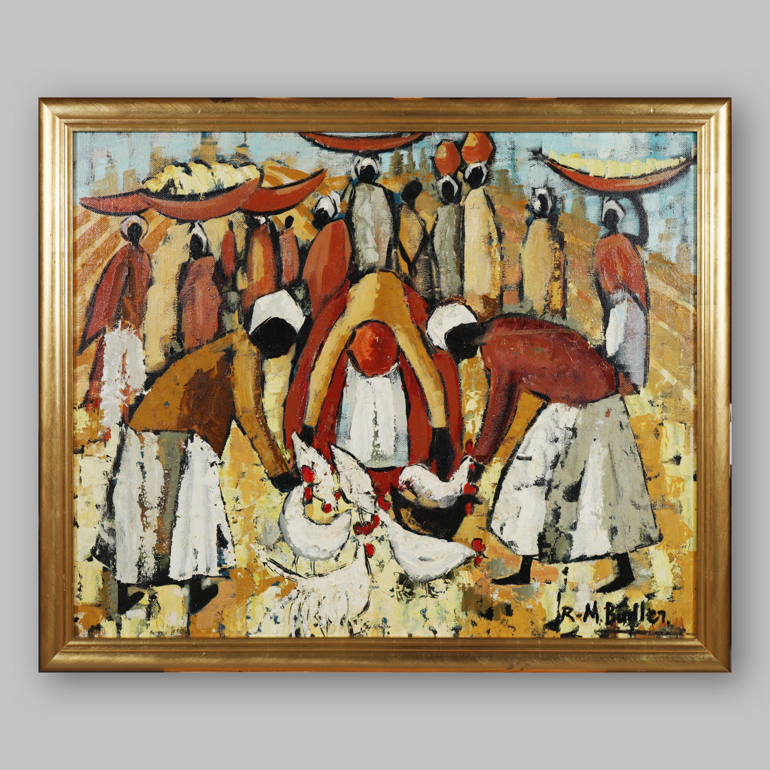ROSE-MARIE BUDLER (SOUTH AFRICAN). FEEDING THE CHICKENS. oil on canvas, 67cm x 82cm, framed.