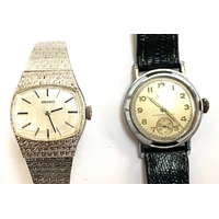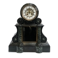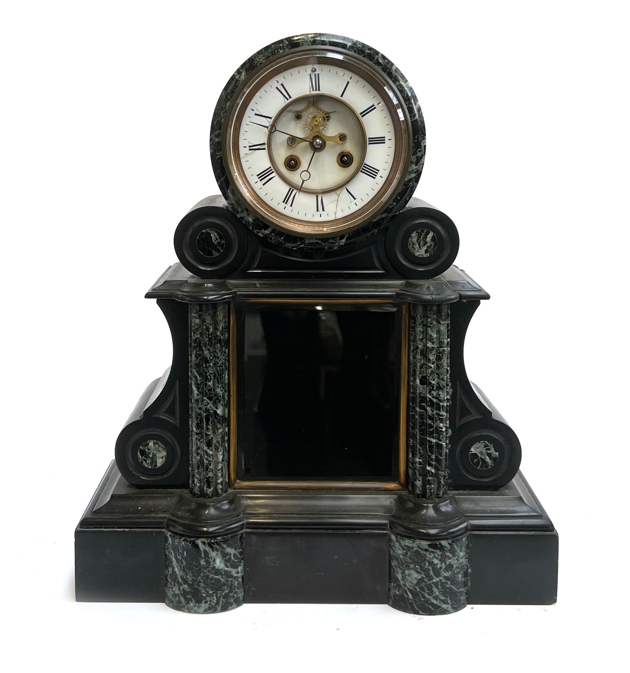 A slate and serpentine marble mantel clock with bevelled glass panel, 44cmH