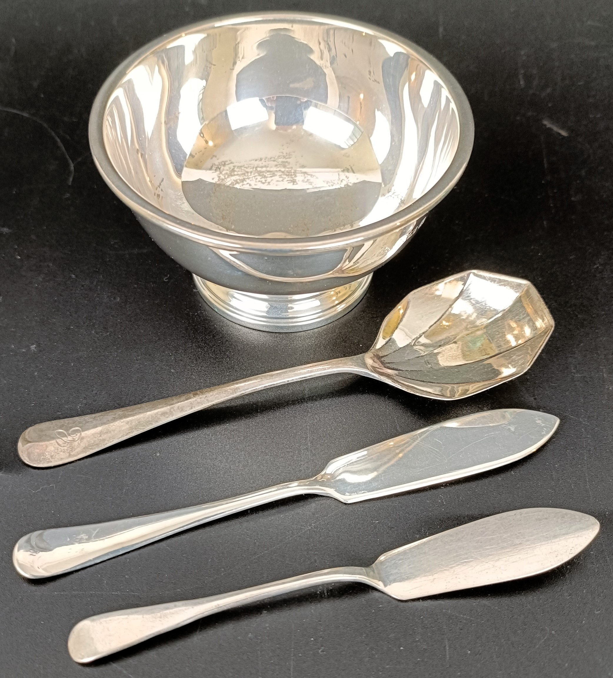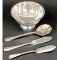 A silver sugar bowl, a serving spoon, and two butter knives, 4.2 ozt