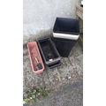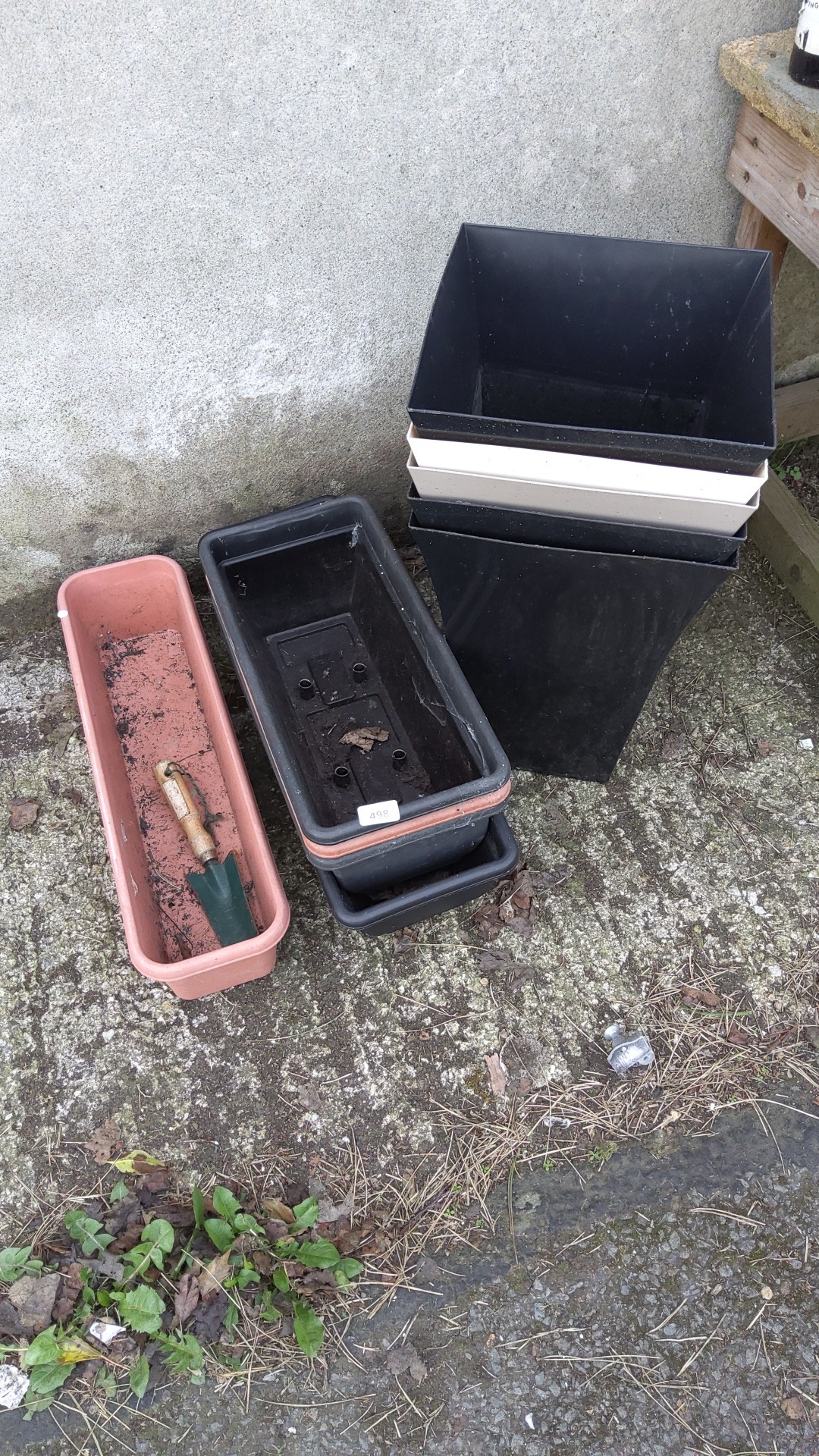 An assortment of plastic garden planters, including tall square tapered planters in black and white, rectangular trough planters with saucers, and a terracotta-coloured window box.