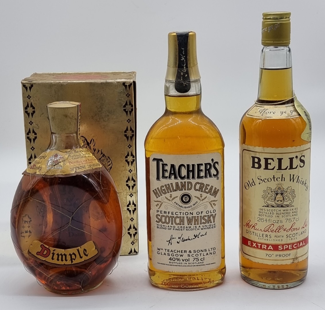 Three old 26 2/3 fl.oz. bottles of Blended Whisky, comprising: Teacher's; Bell's; and Dimple, in oc. (3)