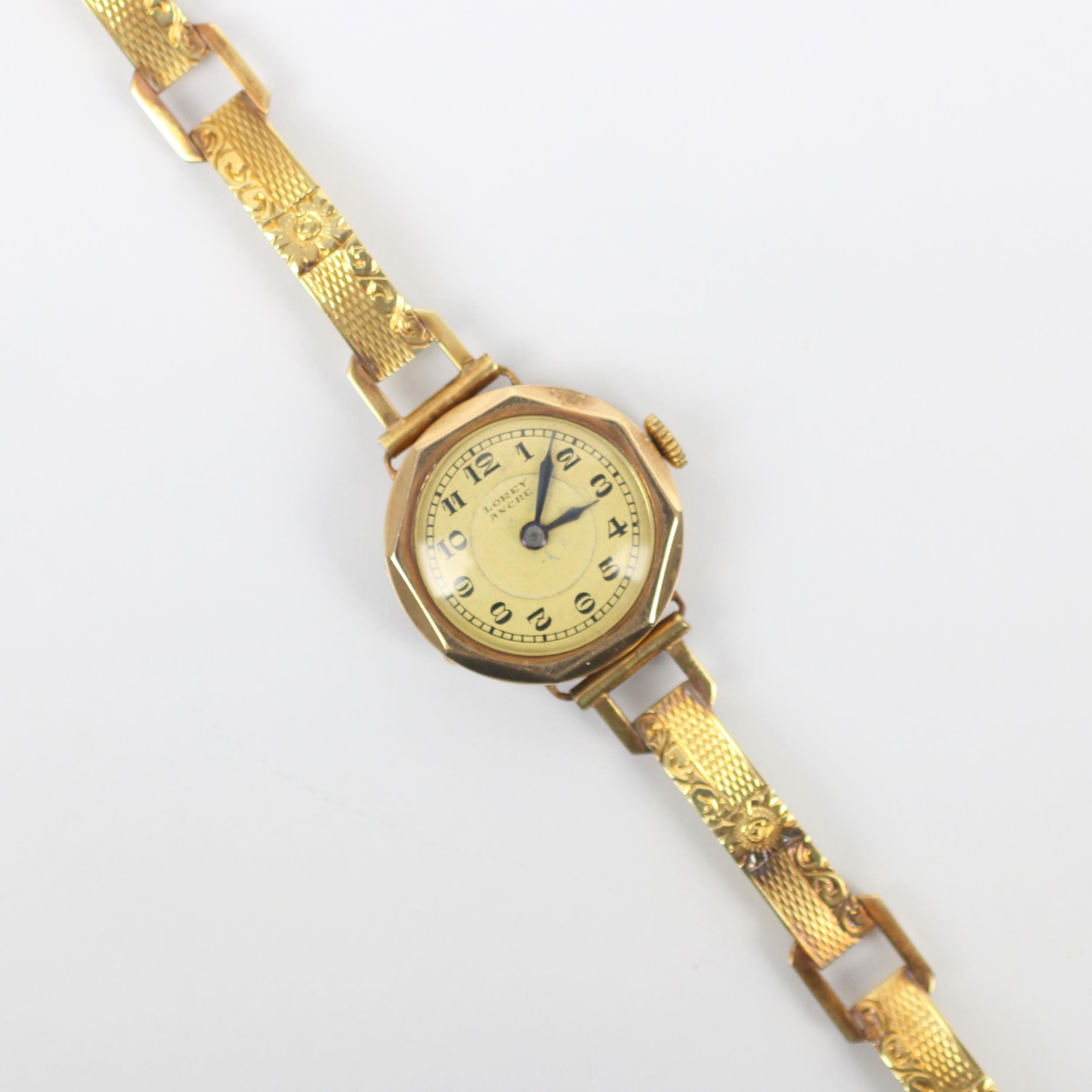 An early 20th century yellow metal wristwatch, the circular cream dial with Arabic numerals, set to plain polished octagonal case, unmarked, upon integral hollow yellow metal bracelet, stamped '585' 16cm long, 13gms (including movement)