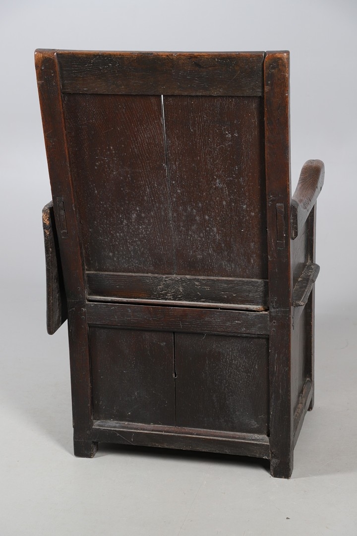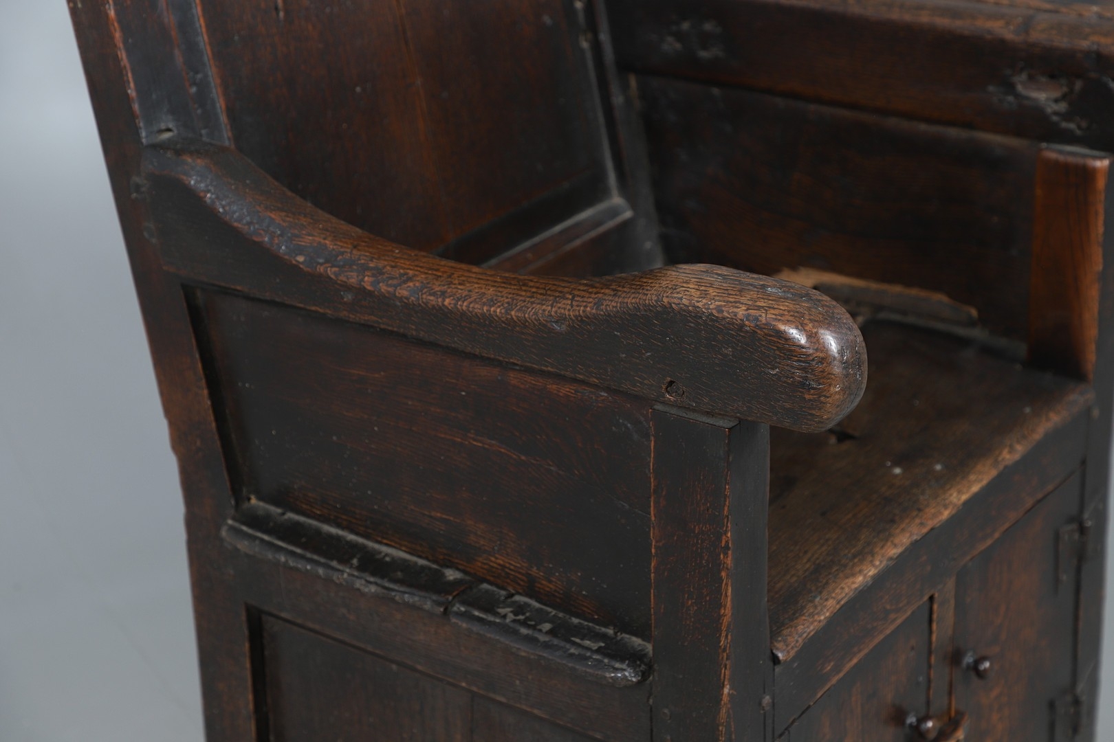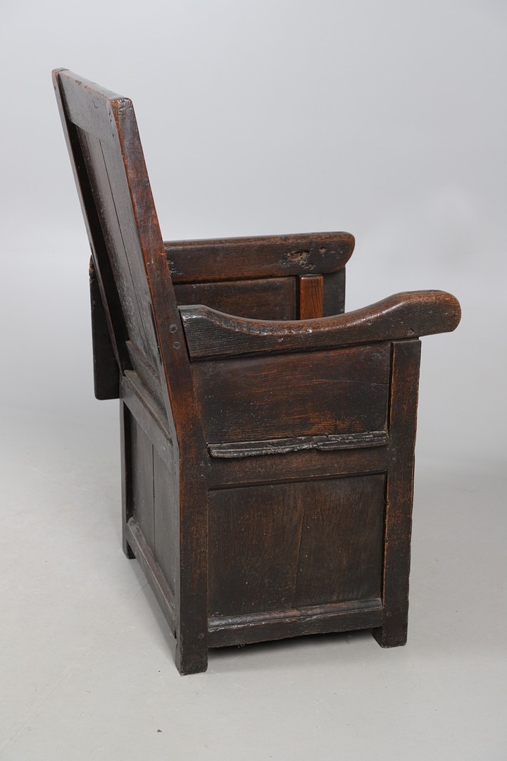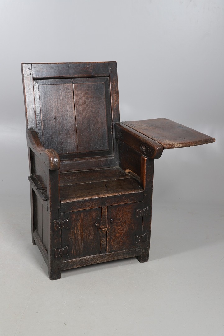 AN UNUSUAL 17TH CENTURY OAK CHAIR. with panelled back and sides, hinged side flap with supporting iron pole, box base with cupboard doors, height 115cm, width 66cm, depth 63cm.