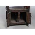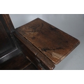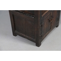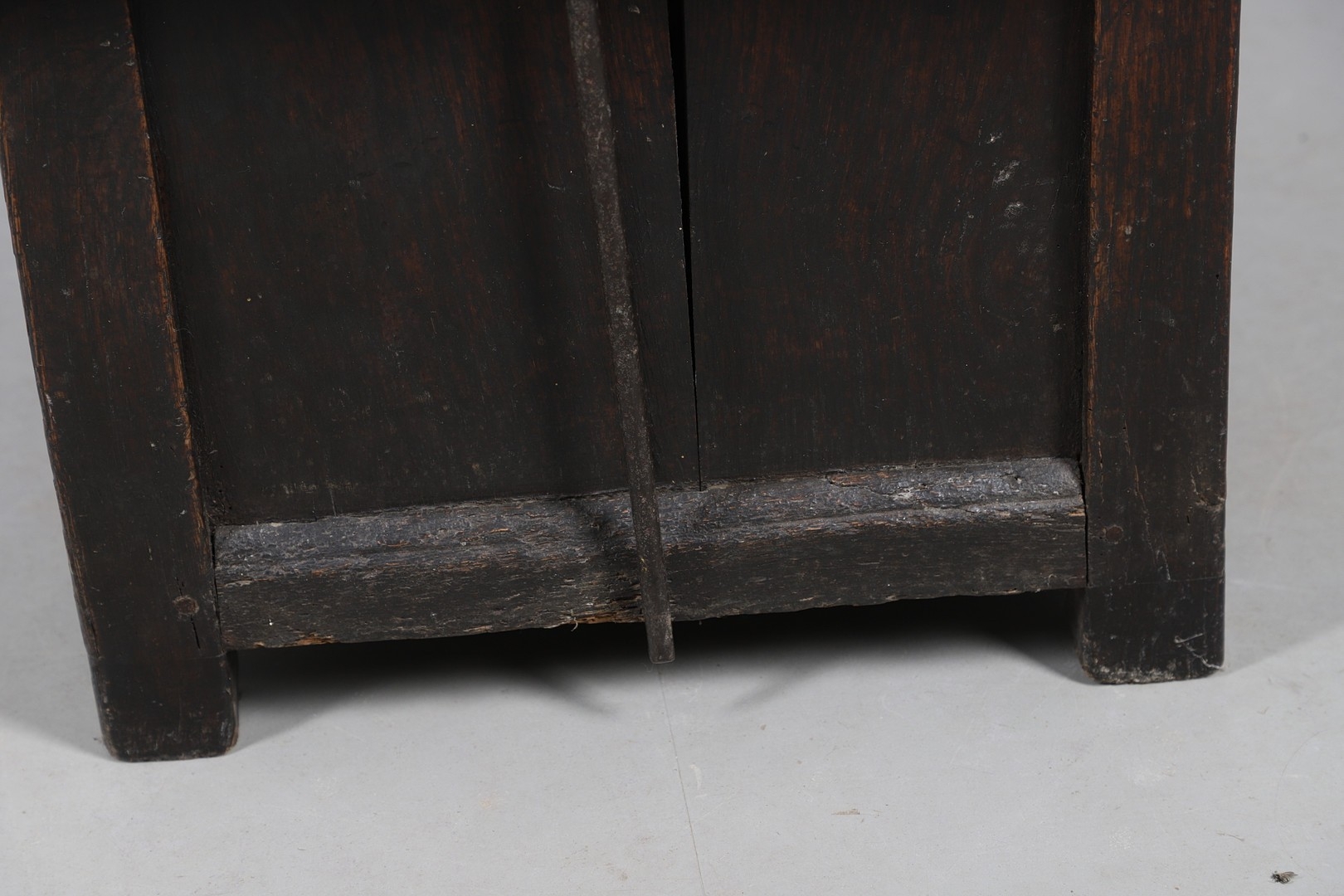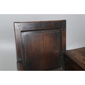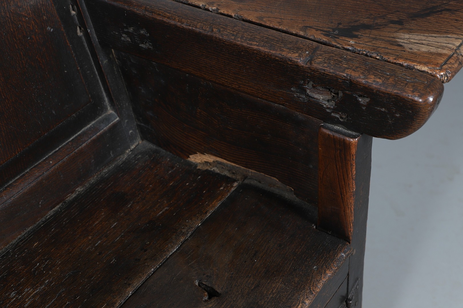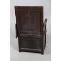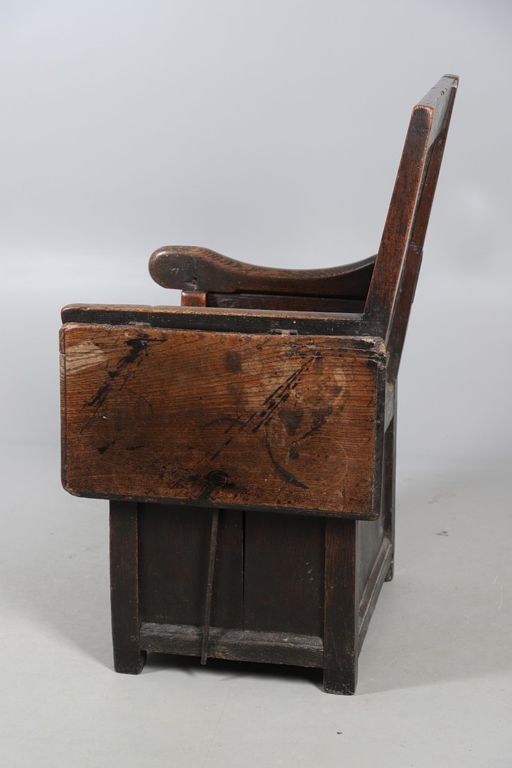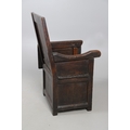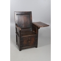 AN UNUSUAL 17TH CENTURY OAK CHAIR. with panelled back and sides, hinged side flap with supporting iron pole, box base with cupboard doors, height 115cm, width 66cm, depth 63cm.