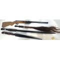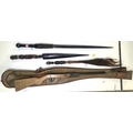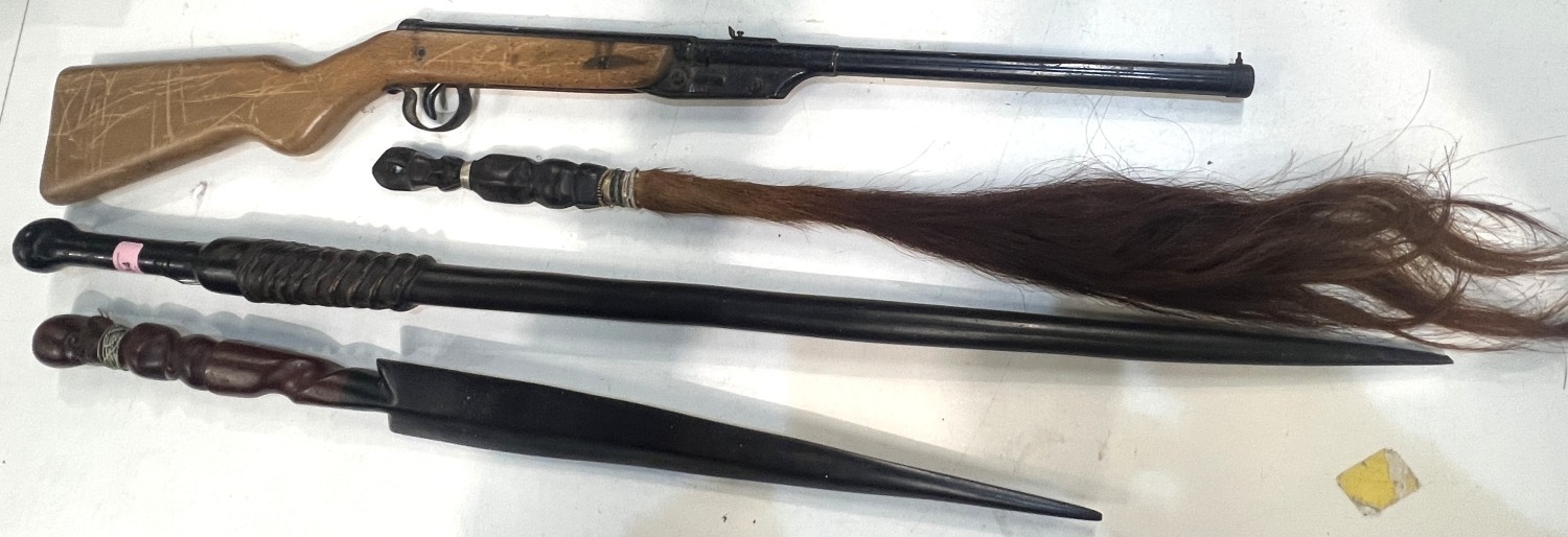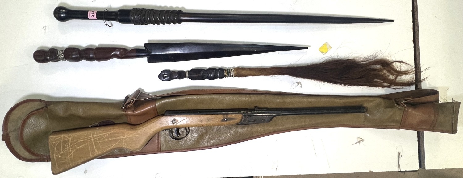 An African carved ebony and horn stick, the horn smoothed into a tapering point, two other African items and a Diana air rifle; Parts for Stuart models, scratch built machine and a Zebra push along toy.