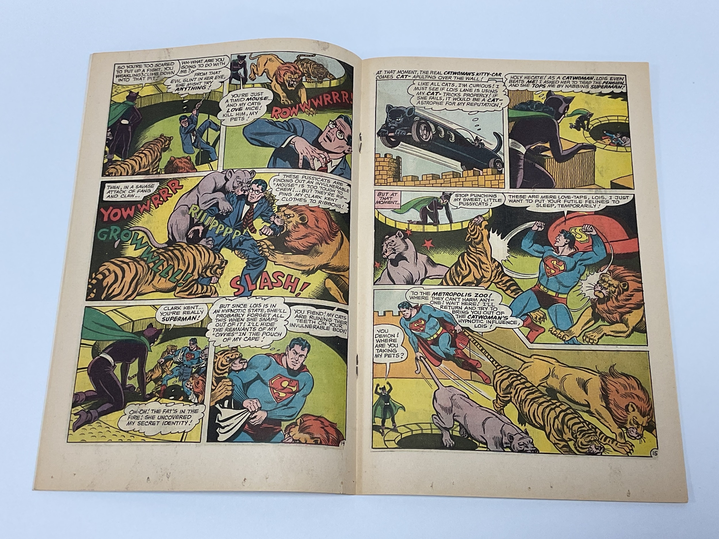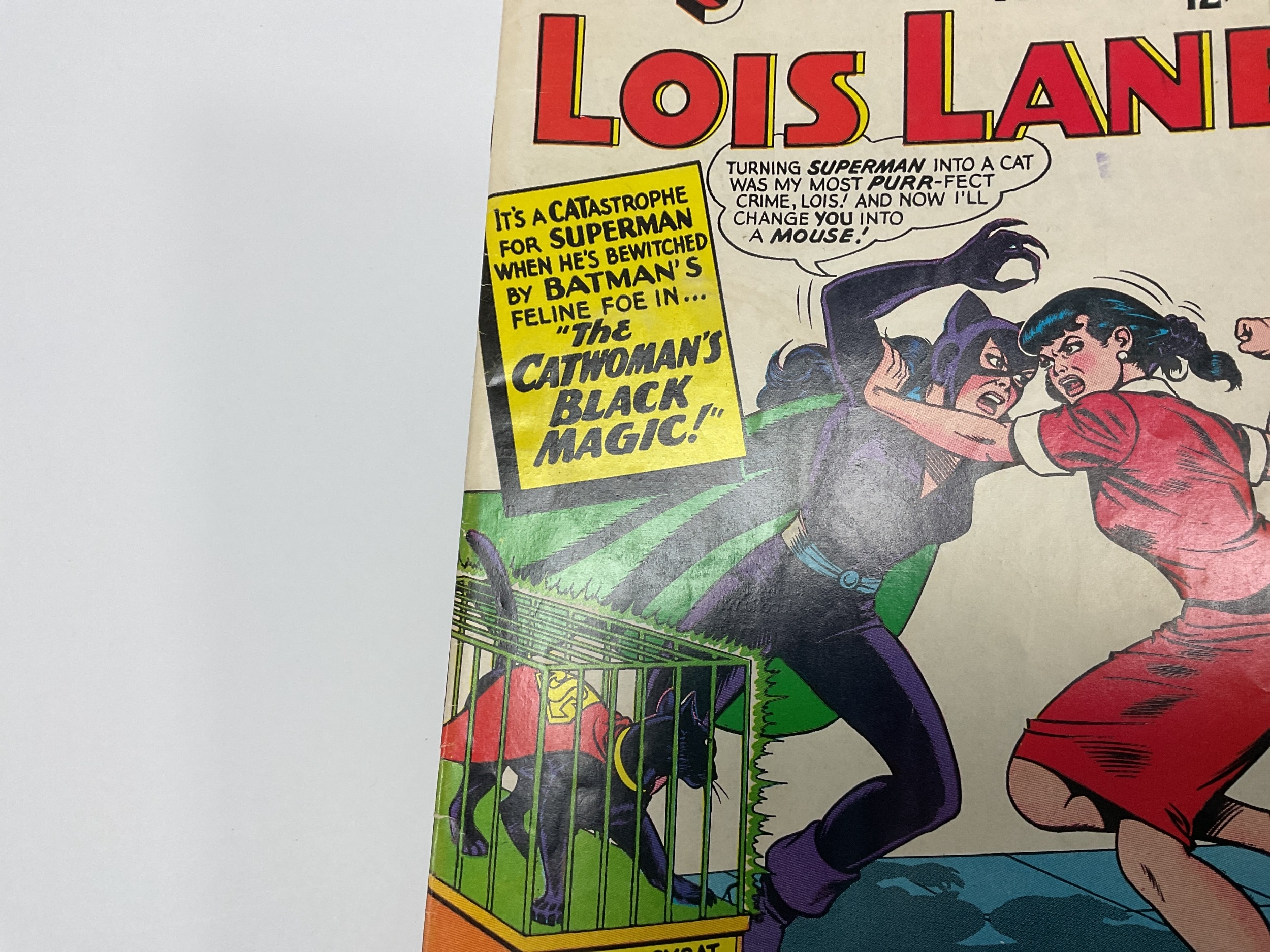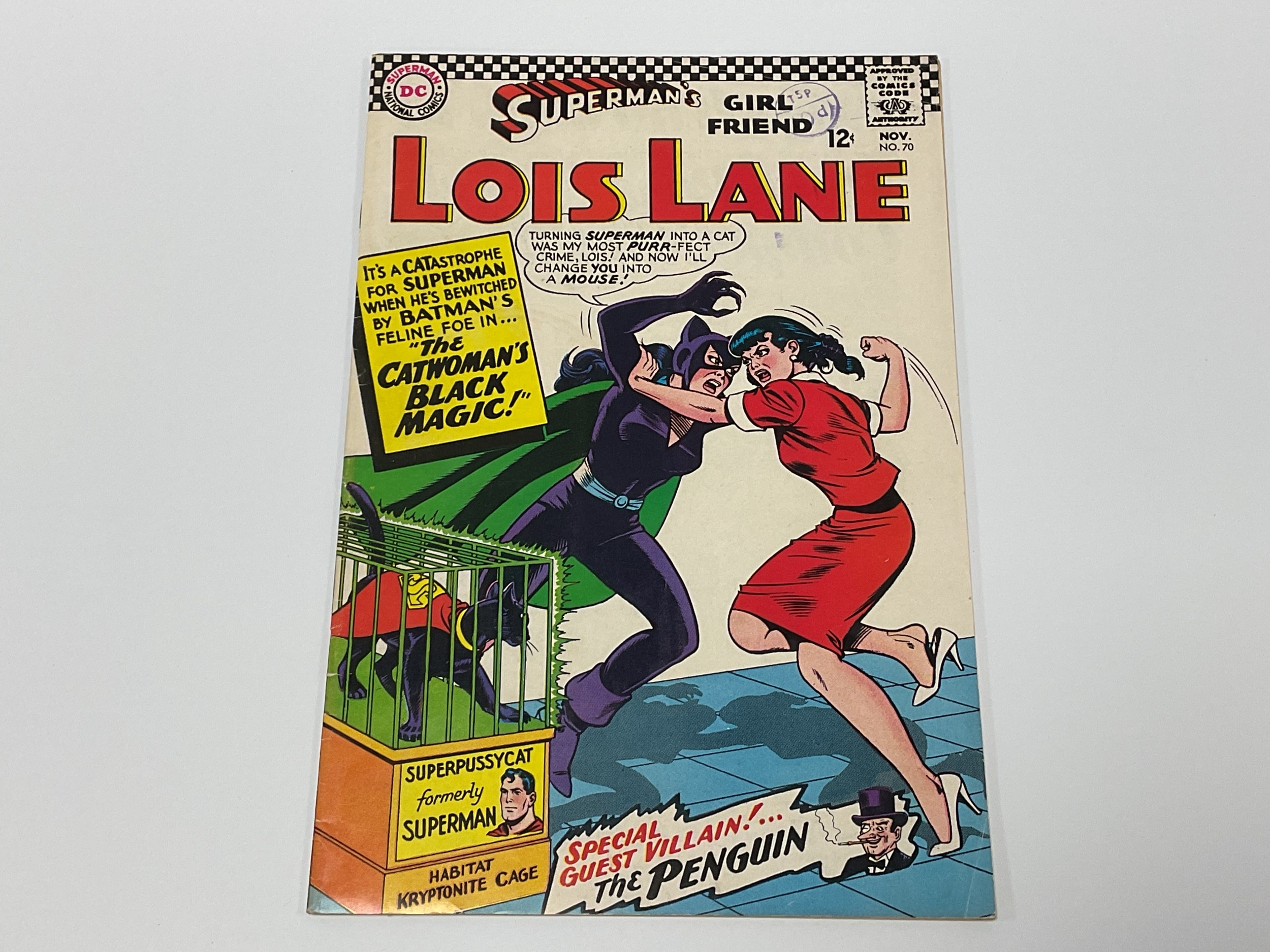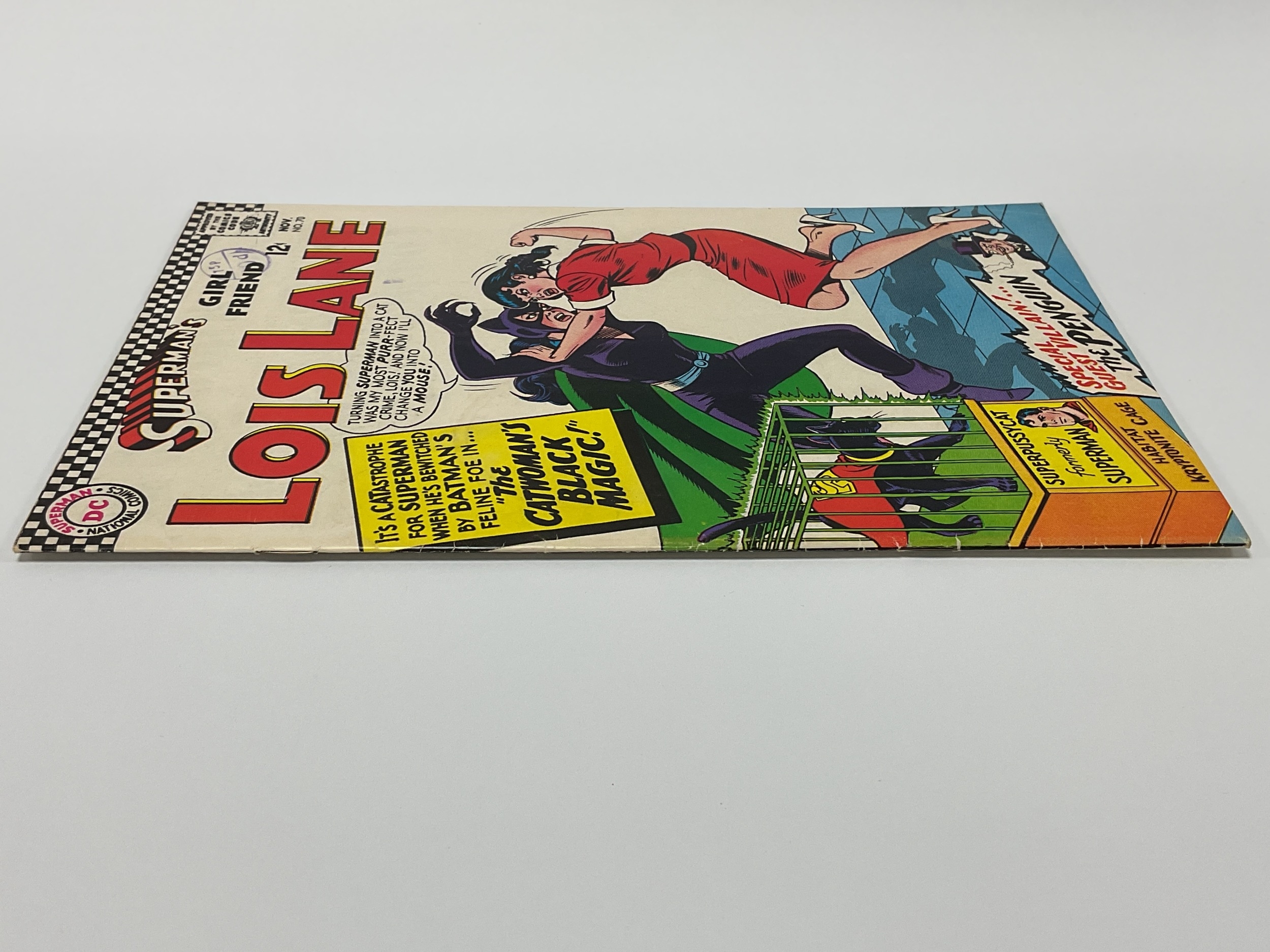 DC comics, Superman's Girl Friend Lois Lane #70, 12 cents (1966). Key issue First silver age appearance of Catwoman, Penguin appearance and Batman & Robin cameo. Faults include wear to spine, some creasing to covers, stamp marks to front cover, mug stain to front cover, marking to covers, some creasing to top of pages, minor marking to odd pages.