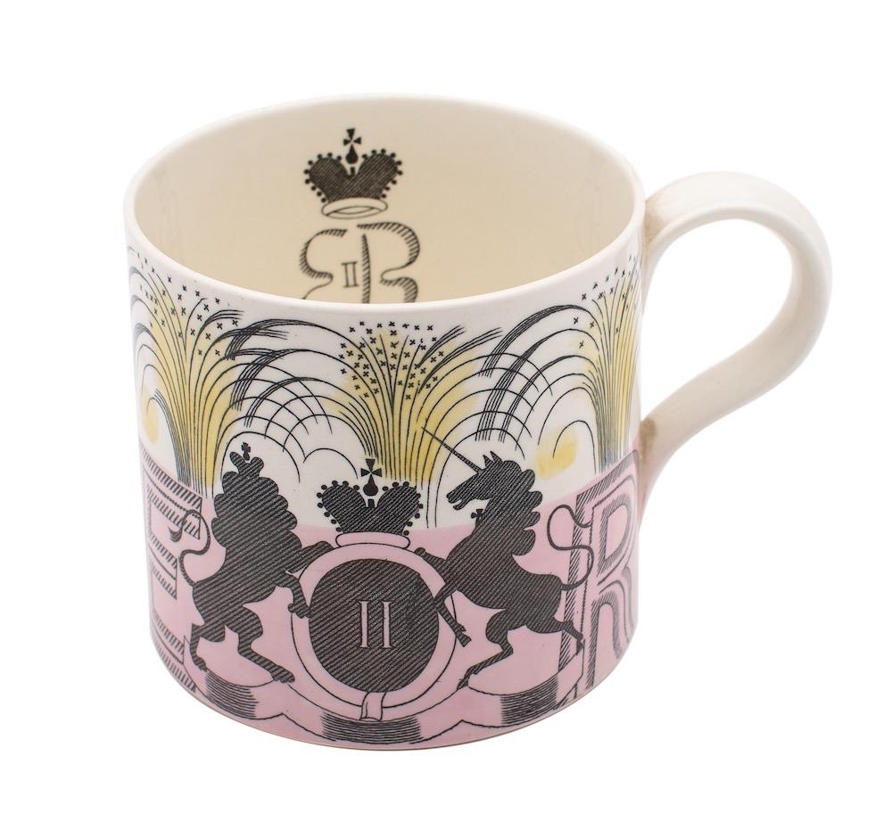 Eric Ravilious for Wedgwood, a Queen Elizabeth II coronation mug, black backstamps, 10cm high.