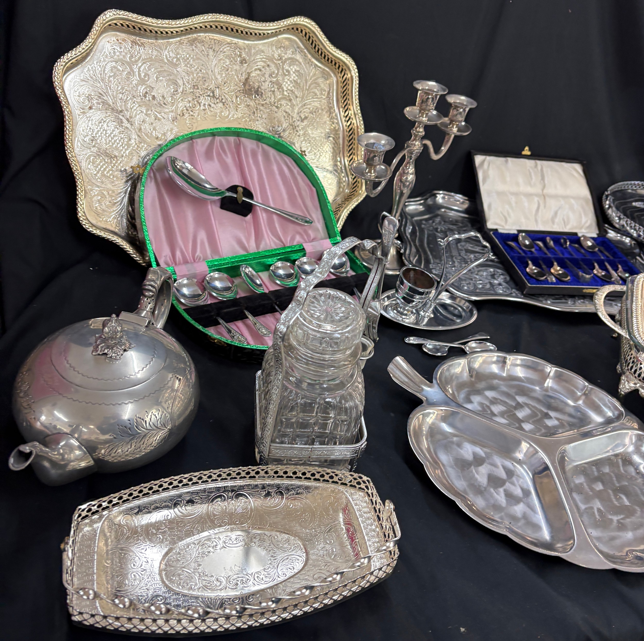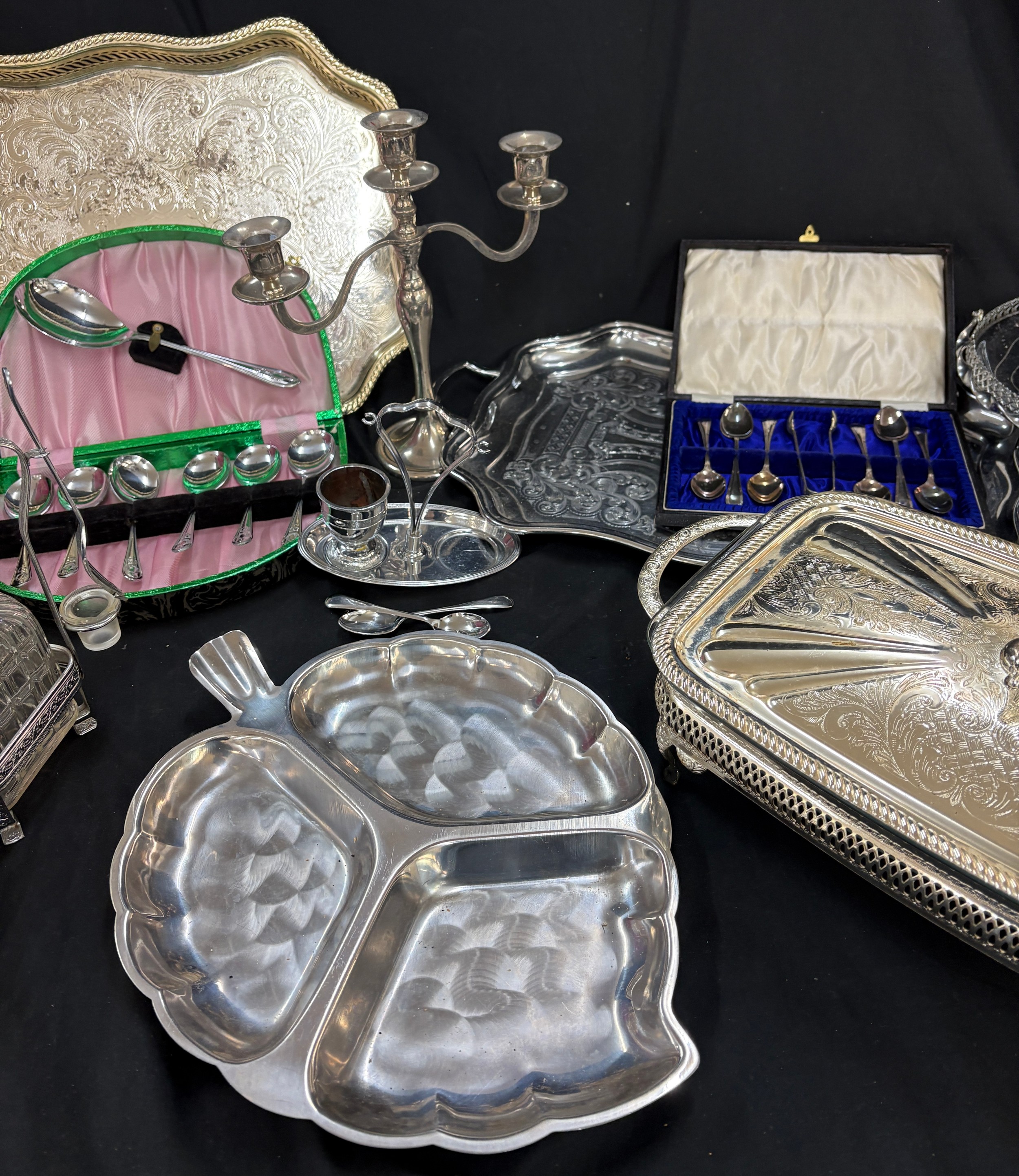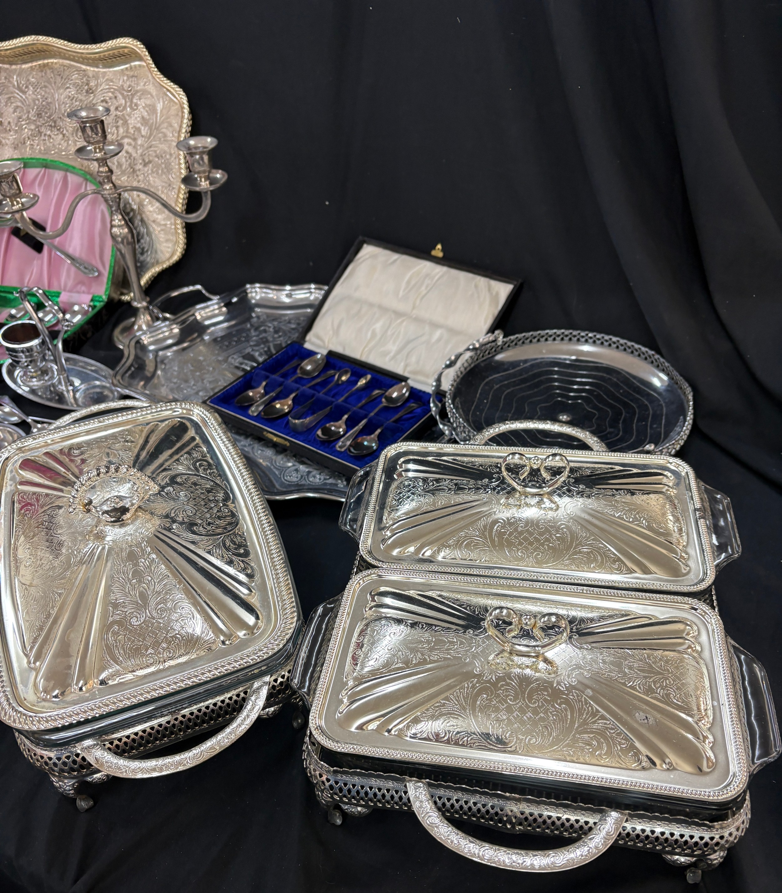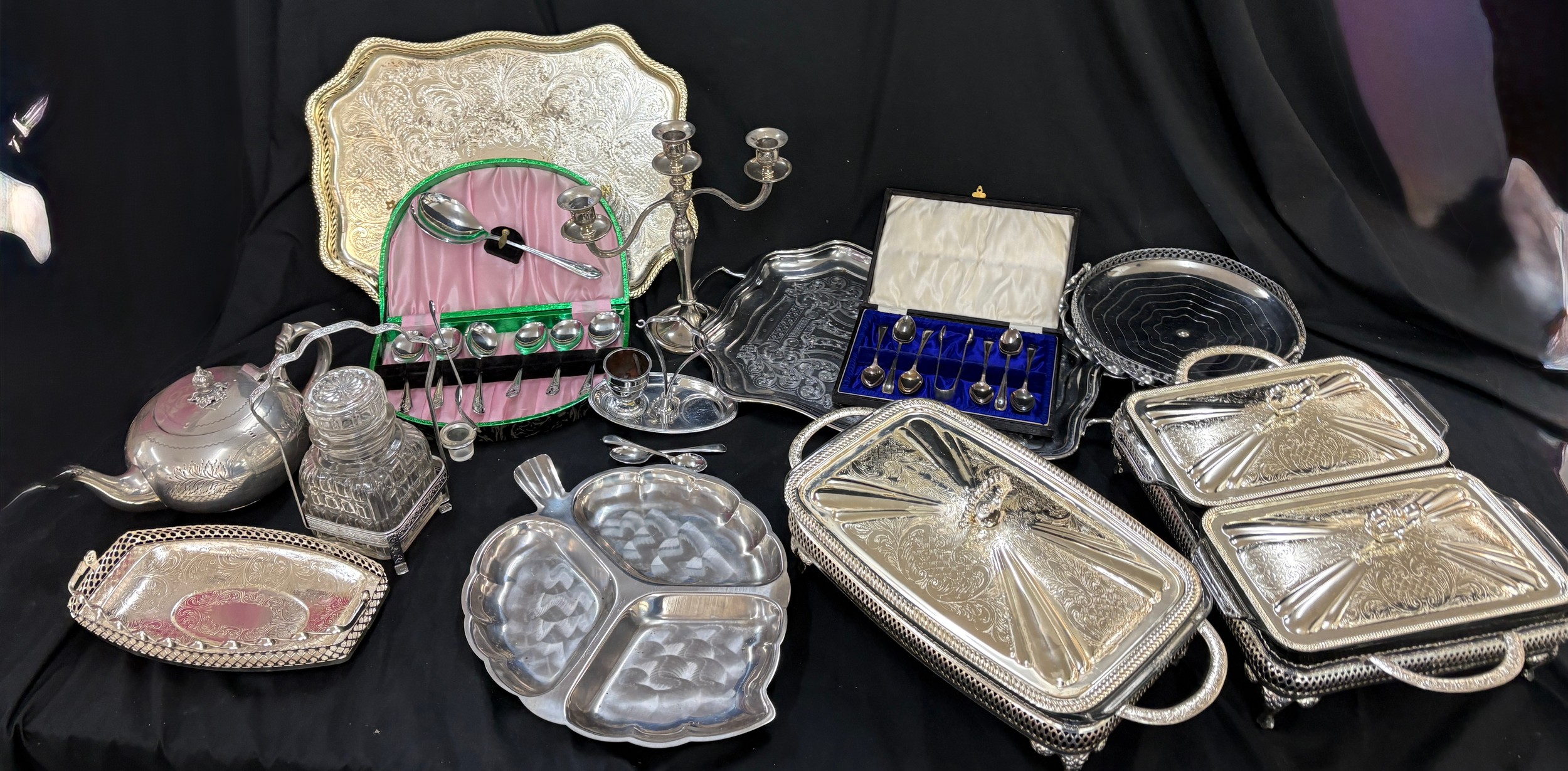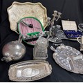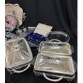 Selection of EPNS, metalware etc to include lidded tureens, teapot, tray candlestick etc
