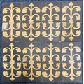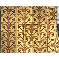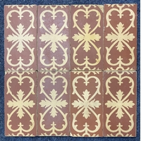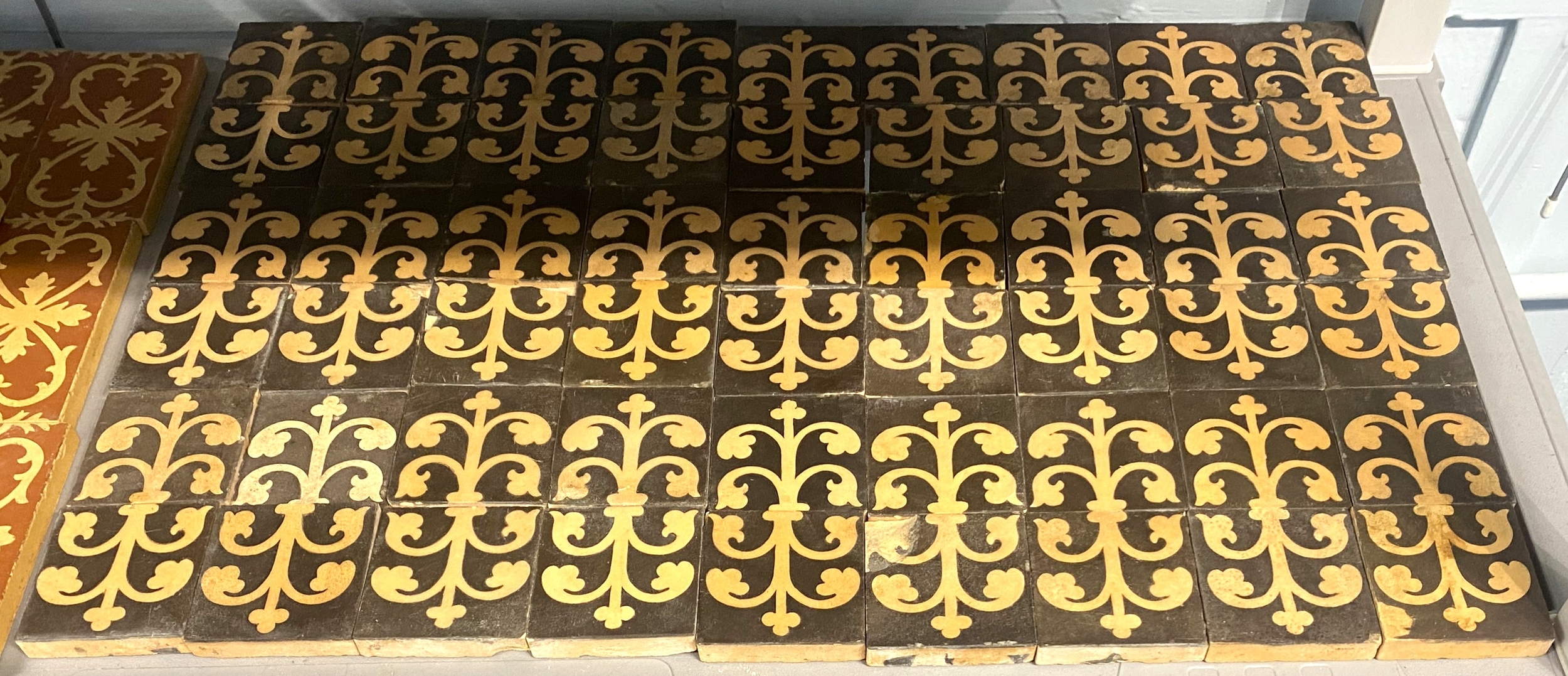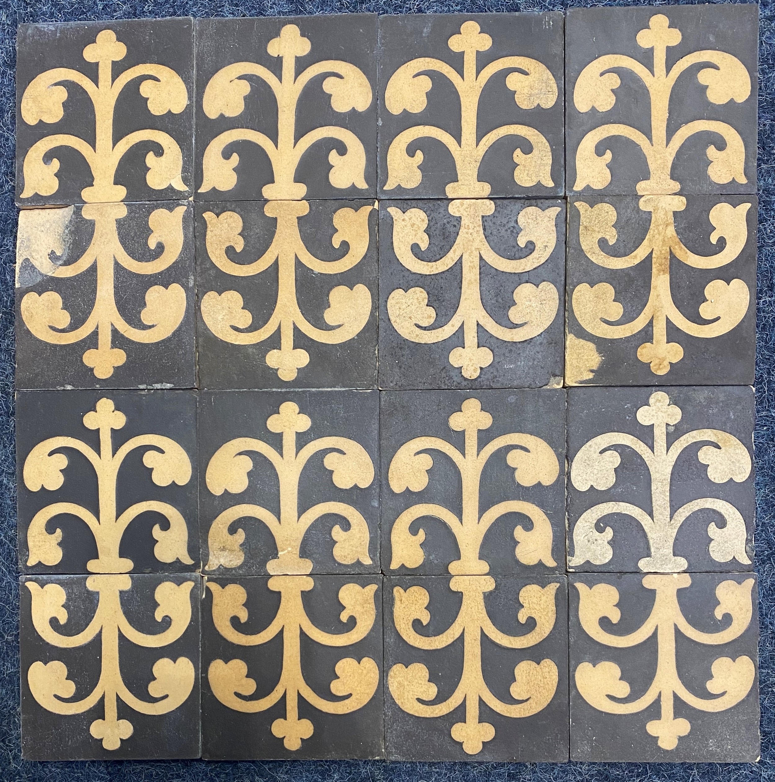 Fifty-four encaustic border tiles with black and buff scrolling design, 7.7cm by 7.7cm