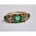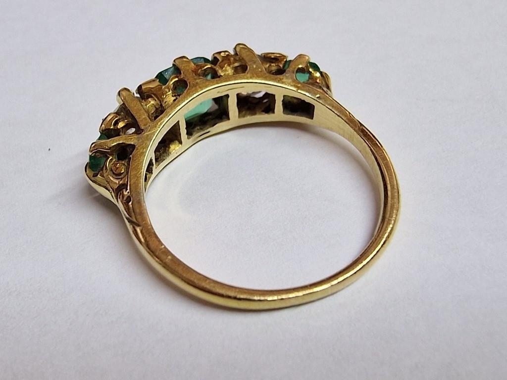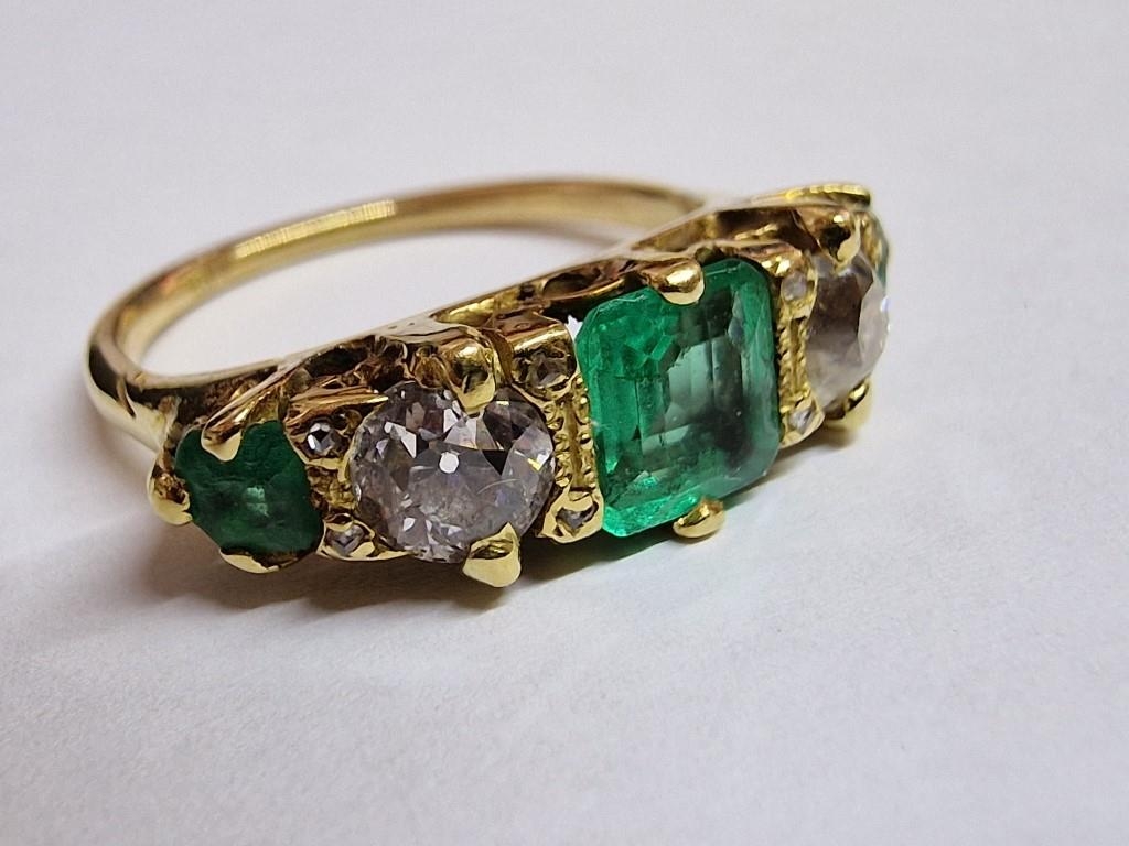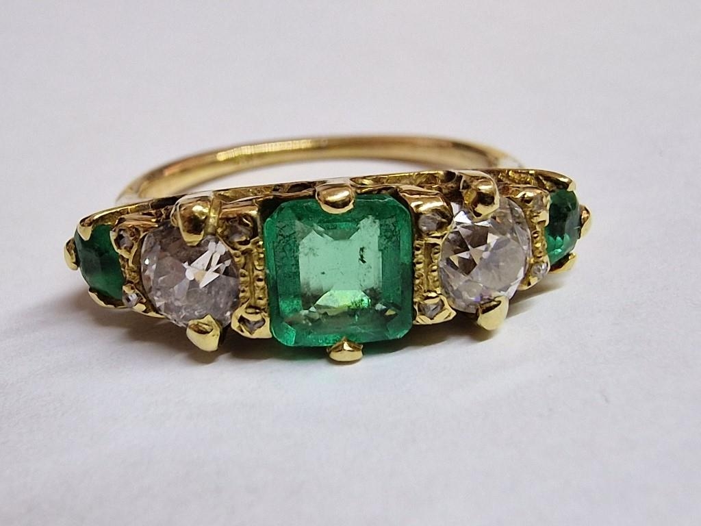 Victorian 18ct Gold, Diamond and Emerald Ring; 5-Stone with Central Radiant Cut Emerald (Approx. 6mm x 5mm), Adjoining 2 x Round Cut Diamonds (Approx. 0.4ct Each) with Diamond Chips, 2 x Further Round Cut Emeralds (Approx. Ø: 3.5mm), (Total Weight Approx. 4.3g, Size: N/O)