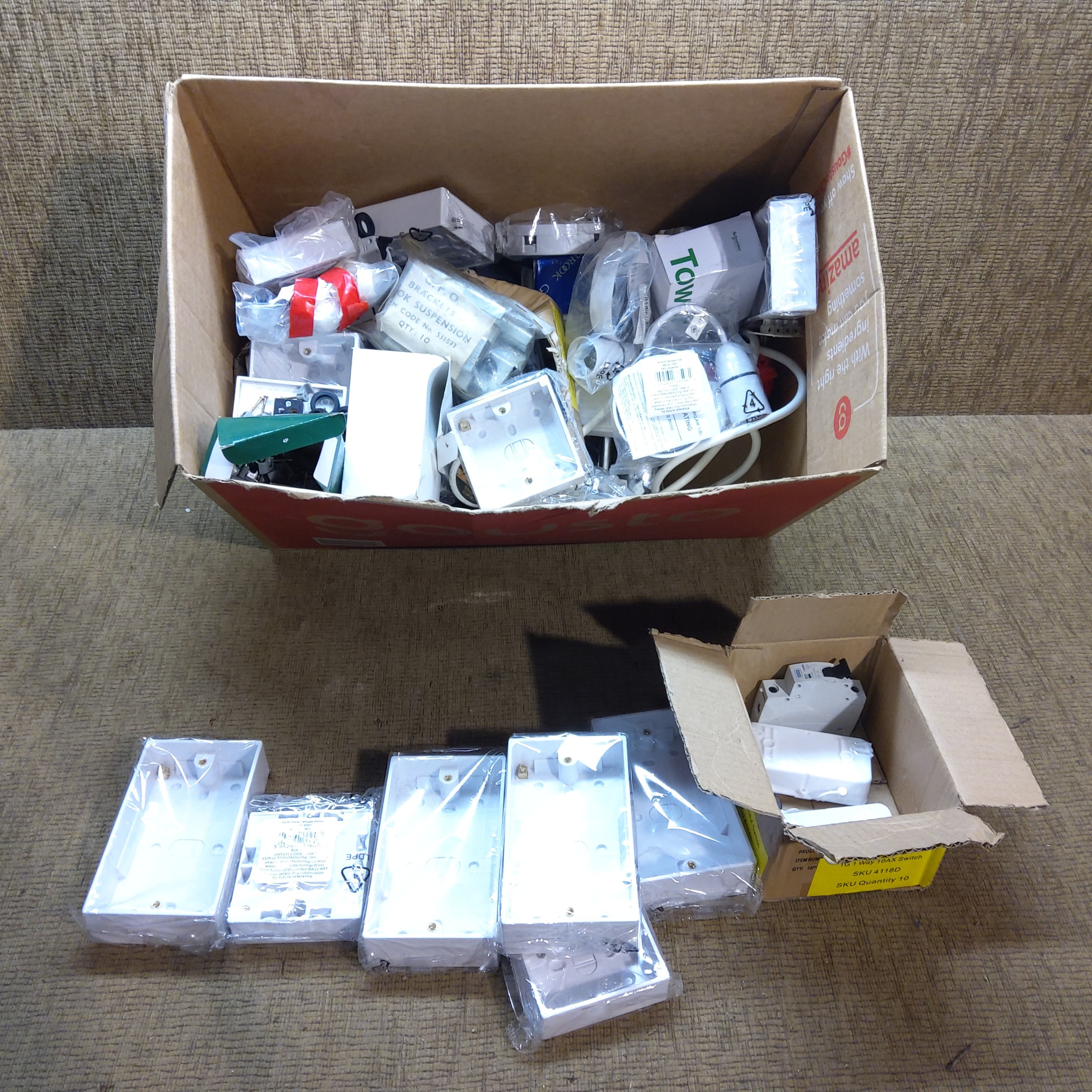 Large quantity of electrical boxes and fixings.