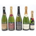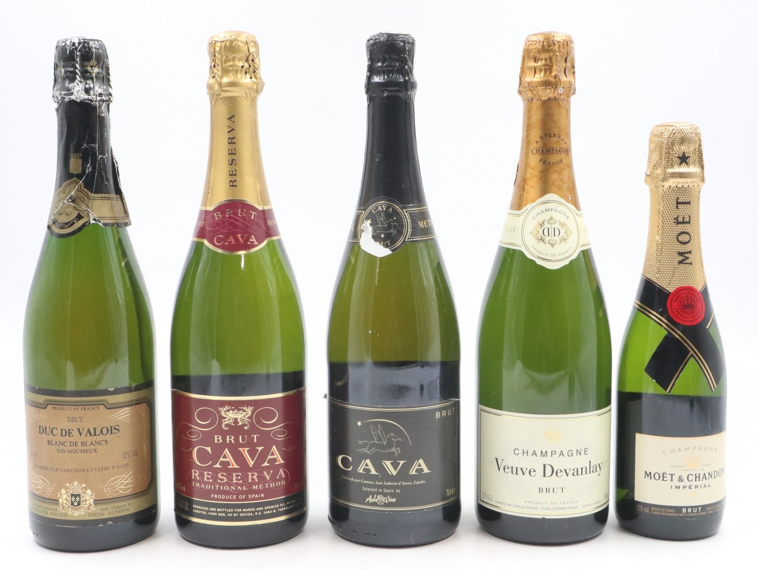 75cl NV Veuve Devanlay Champagne, half bottle of Moet & Chandon Champagne and three other sparkling wines. UK P&P Group 3 (£35+VAT for the first lot and £10+VAT for subsequent lots)