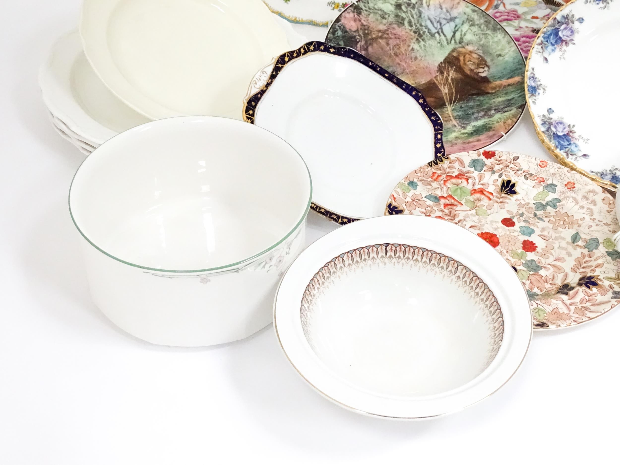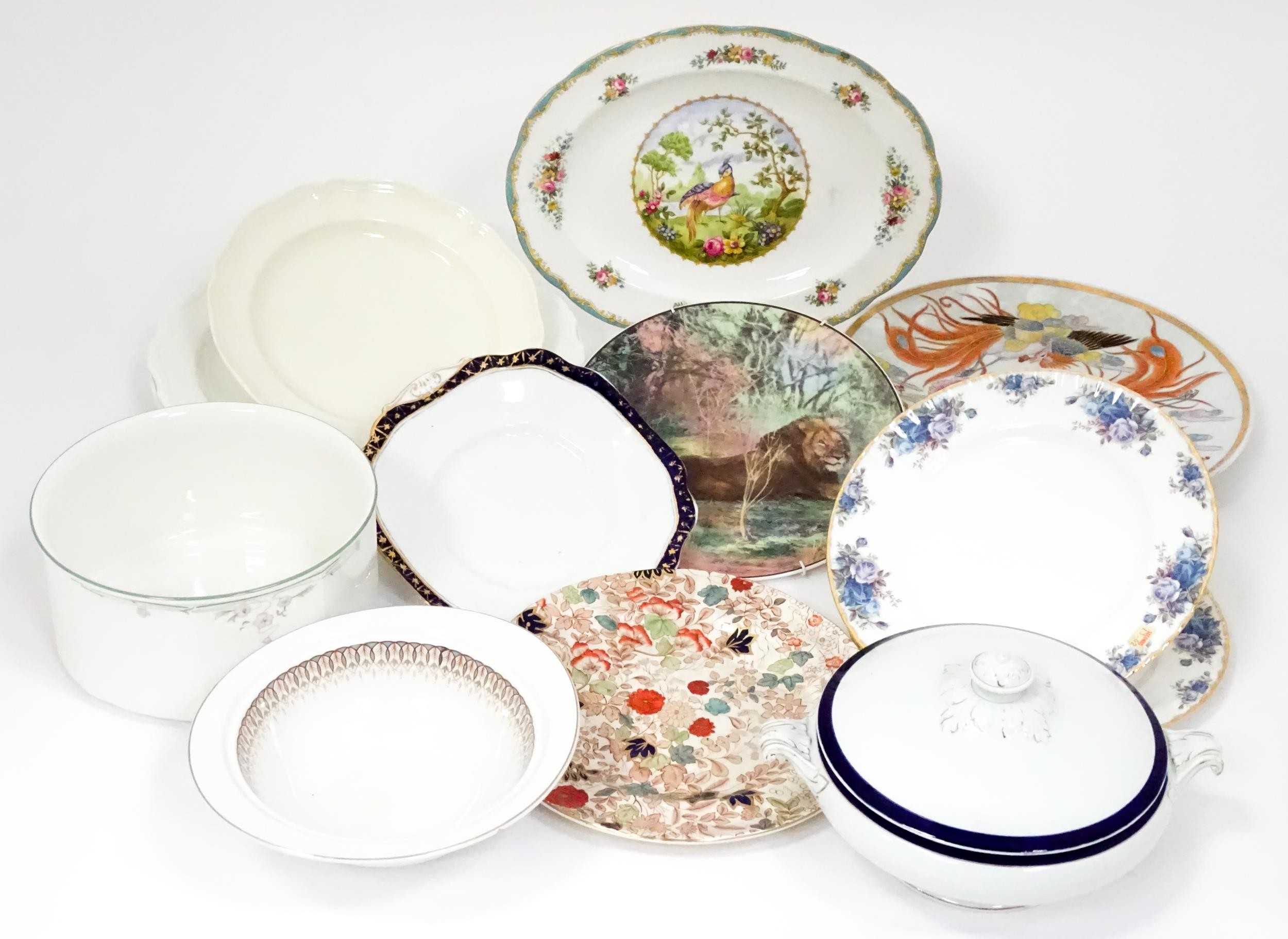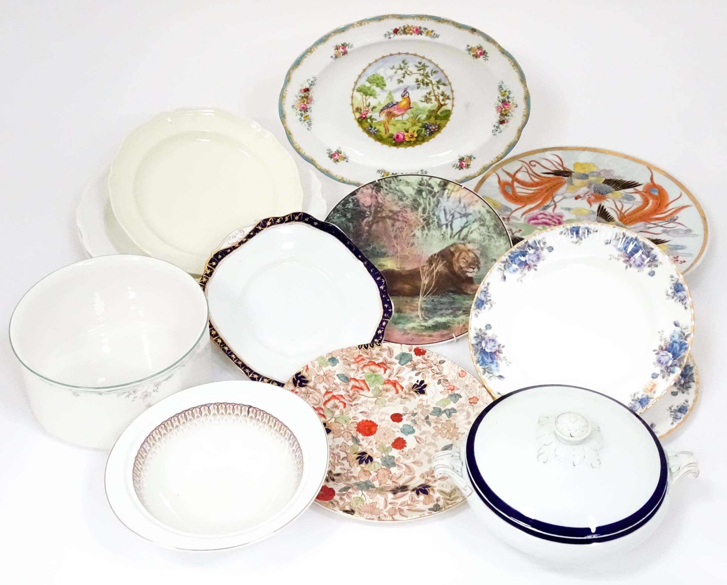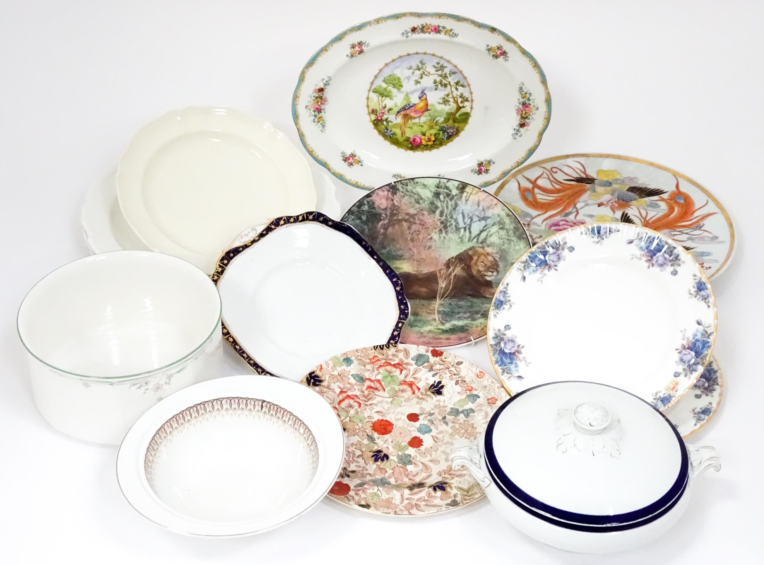 Assorted ceramics to include Royal Albert serving plate decorated in the Silver Birch pattern, a Mason's plater decorated in the Bittersweet pattern, a Royal Doulton dish in the Caprice pattern, two Royal Albert plates in the Moonlight Rose pattern, a Royal Doulton plate with lion detail from the African Series, four Royal Albert plates in the Gossamer pattern, an Oriental plate decorated with phoenix birds and flowers, etc. Largest plate approx. 13" diameter