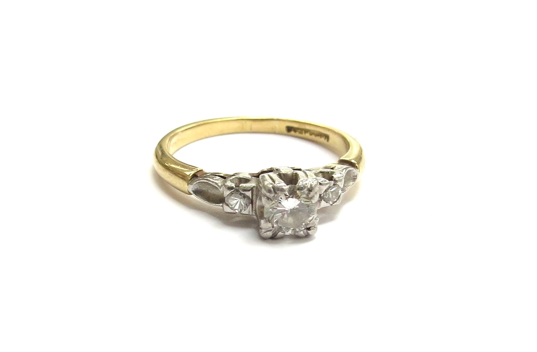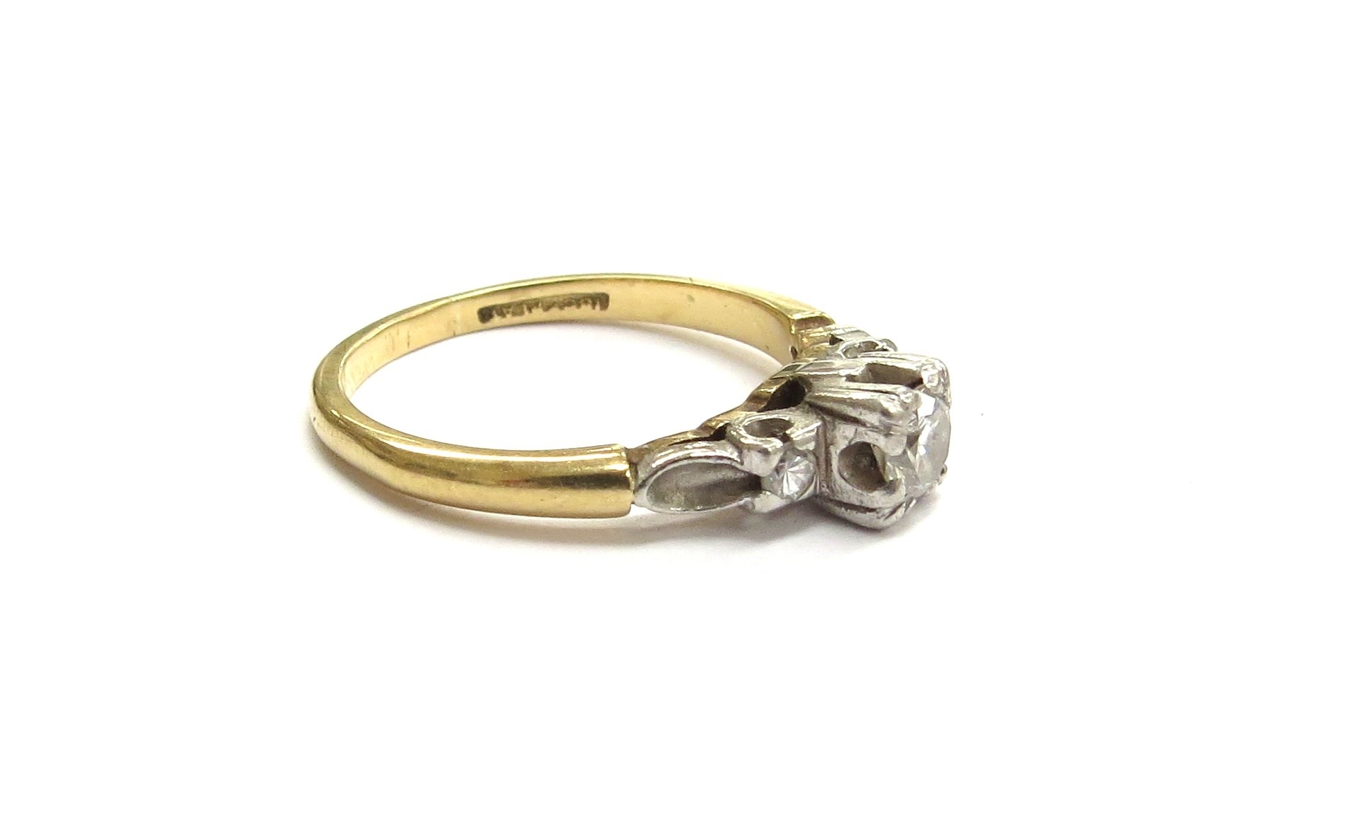 An 18ct gold platinum set diamond solitaire ring, flanked by small diamonds. Size L/M, 3.6g