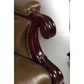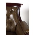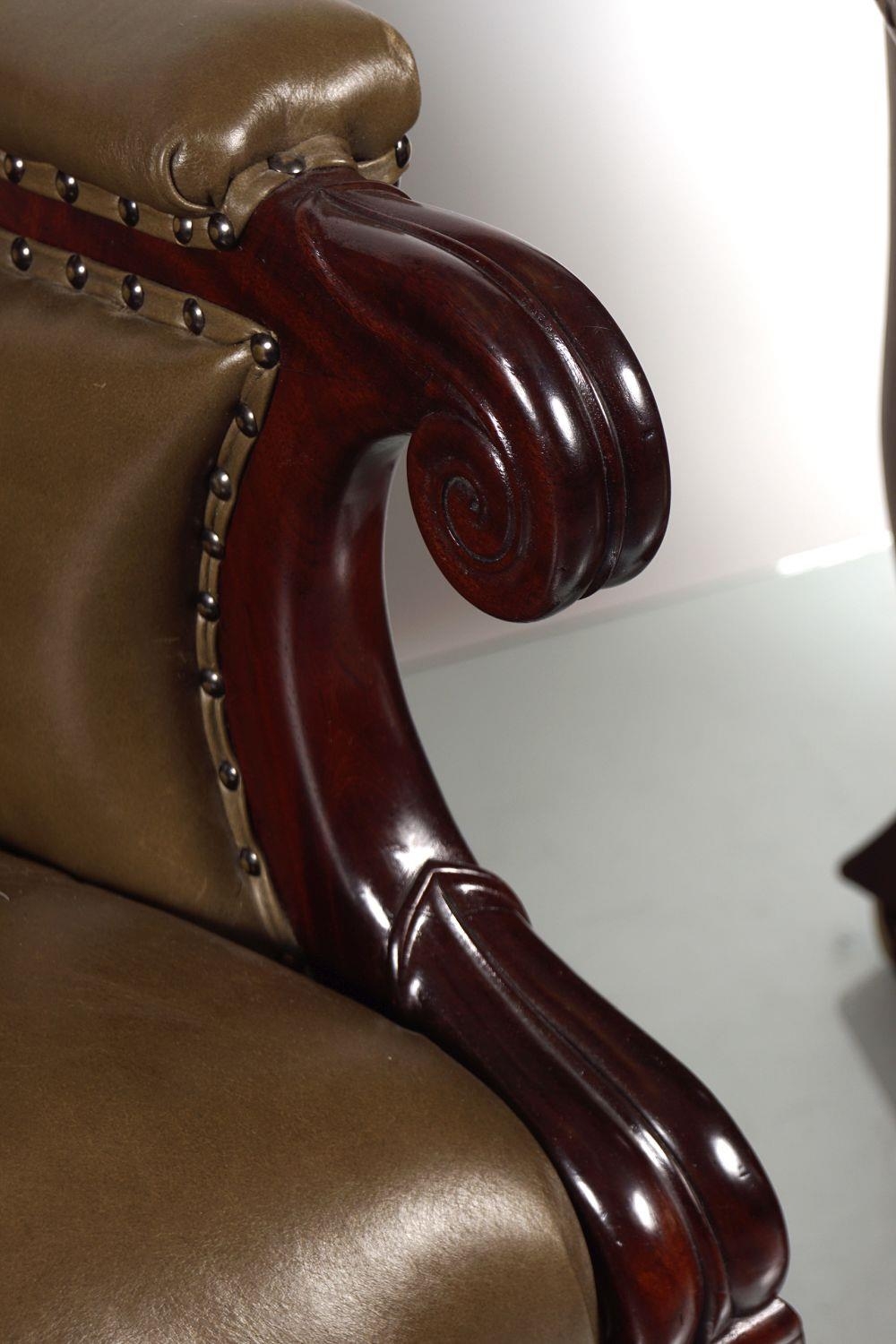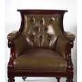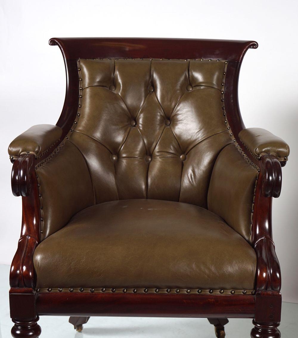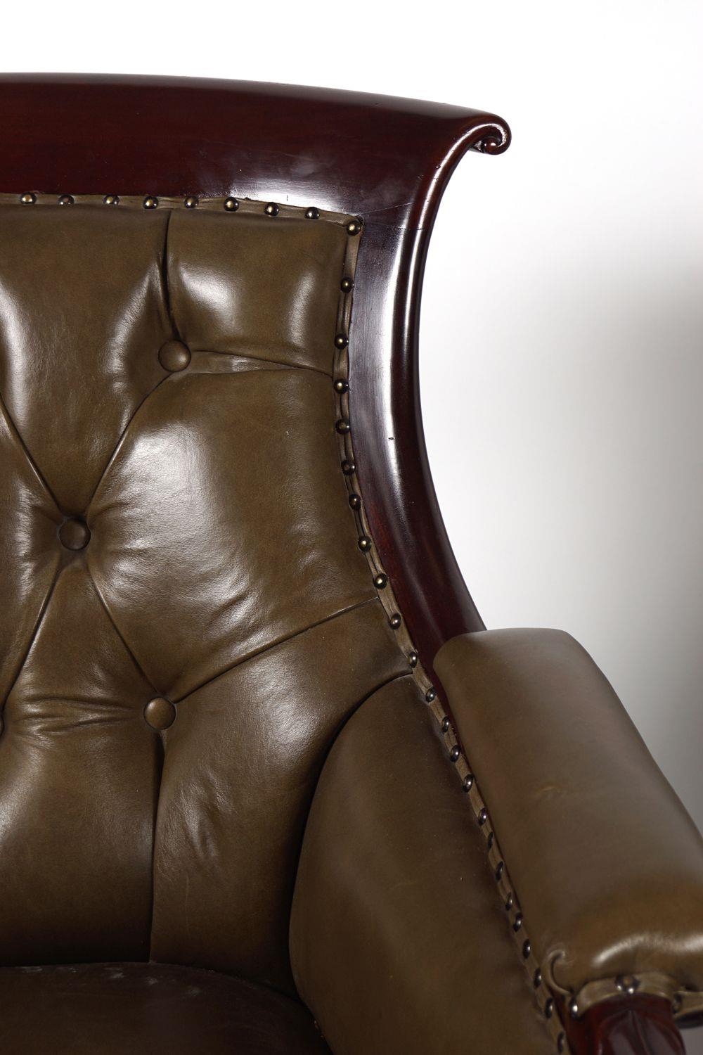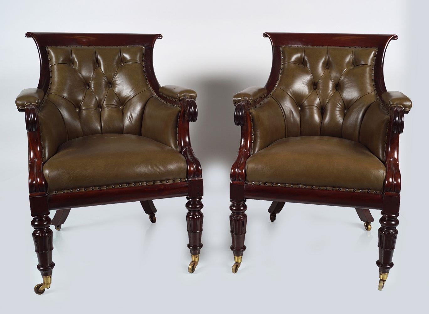 circa 1830, each with a deep buttoned hide upholstered back between scroll fronted arms, raised on anthemion leaf carved turned legs to the fore, terminating on brass cup castors. 95 cm. high; 69 cm. wide; 78 cm. deep