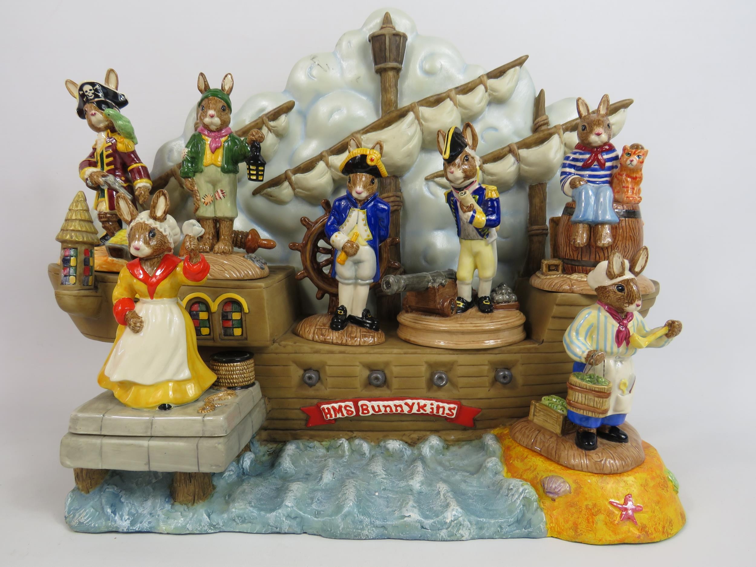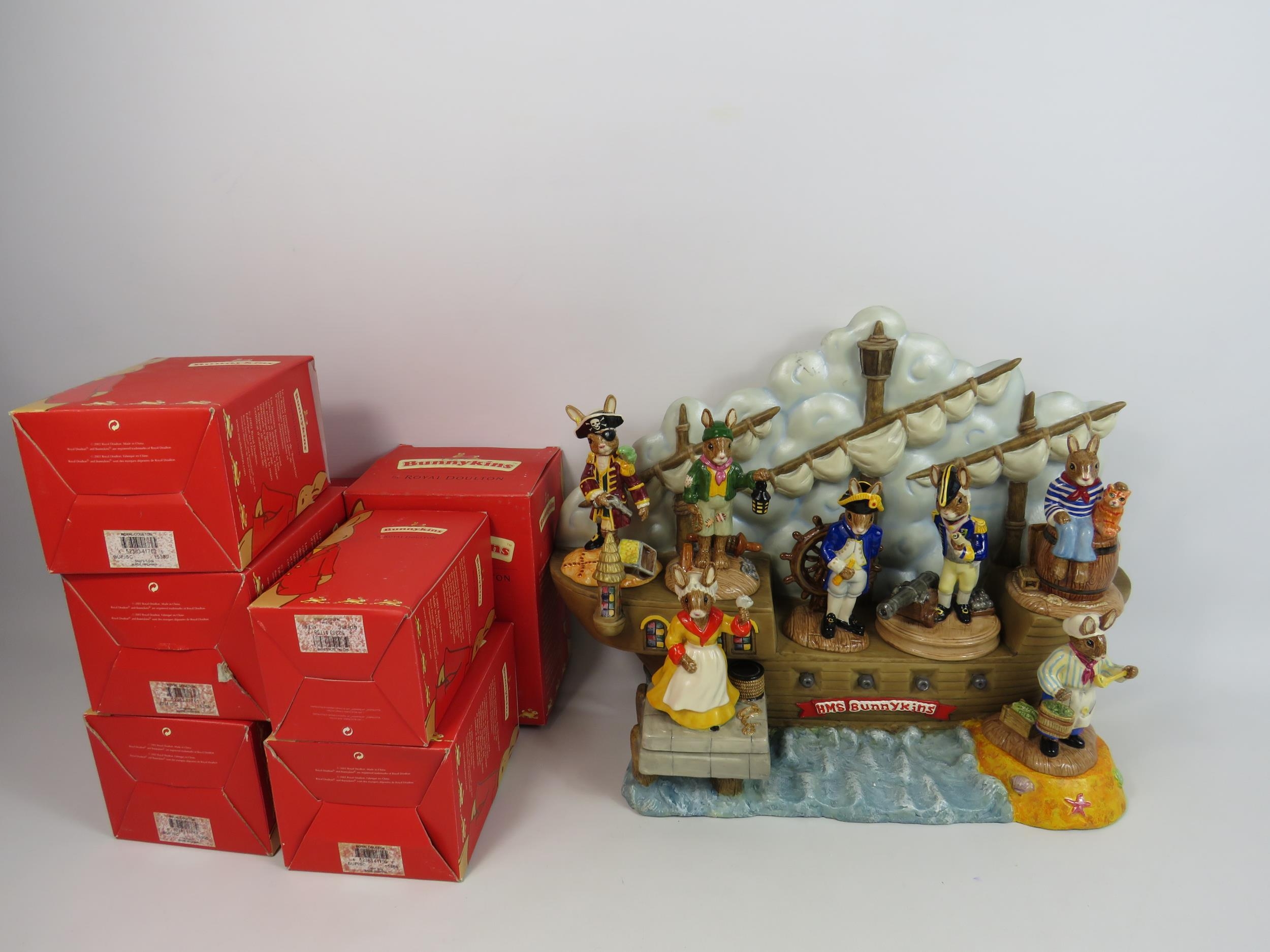 Royal Doulton Bunnykins The ship mates collection 7 figurines with boxes and the Ship base.