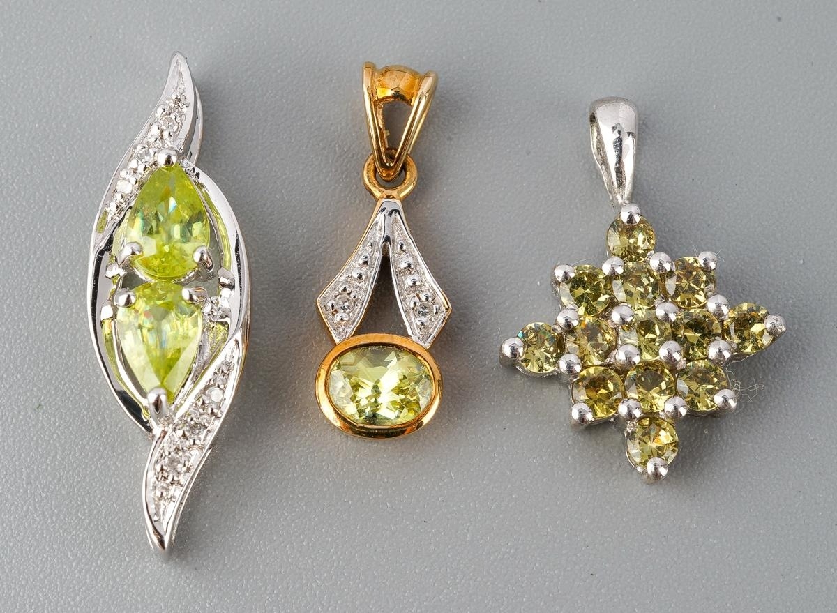 Collection of 3 pendants to include two 9 ct gold Capelinha Sphene and diamond ones and a silver set ambania dermatoid garnet one. Gold ones weighing at 3g