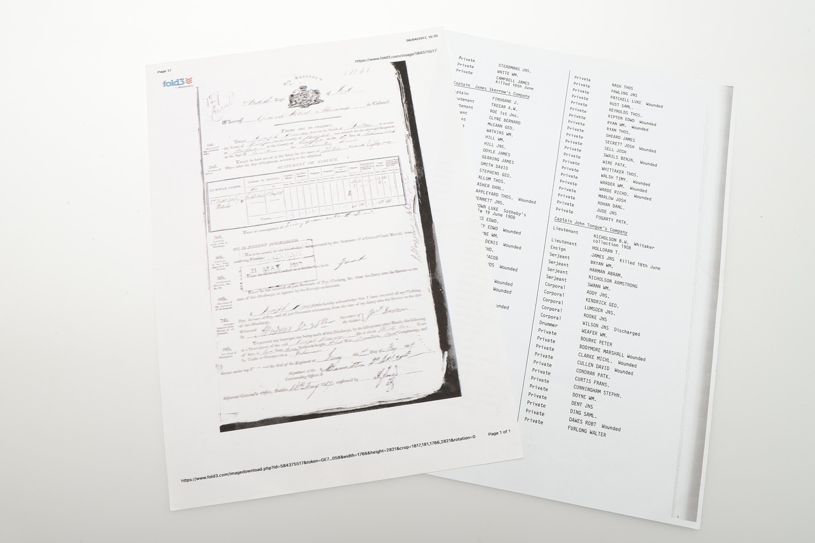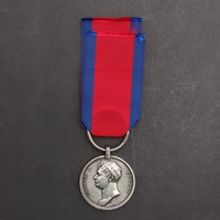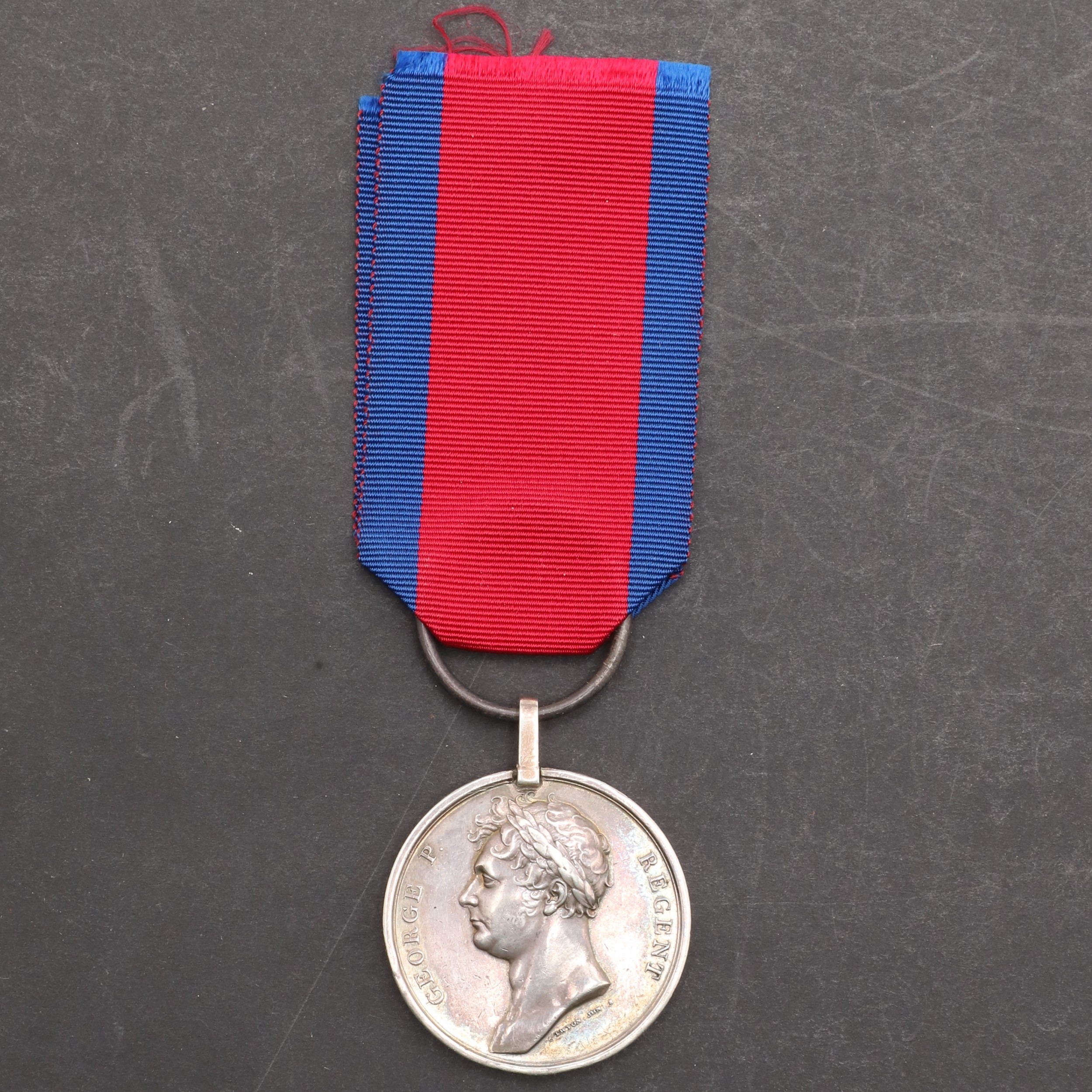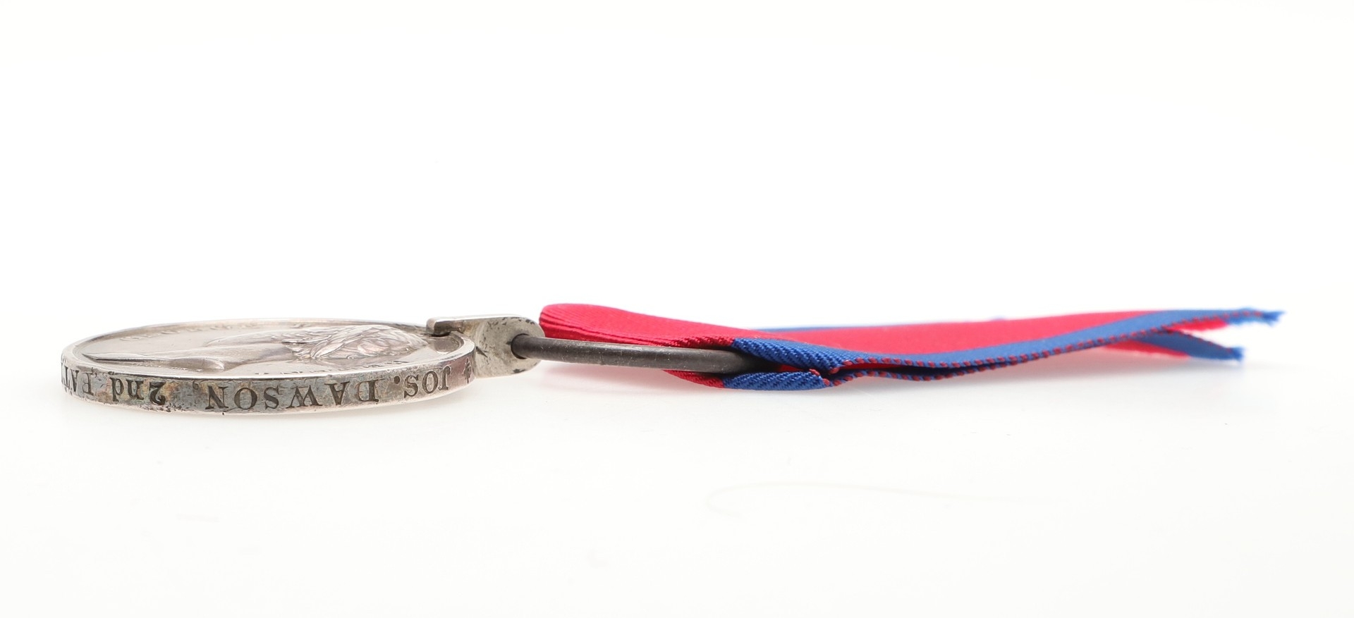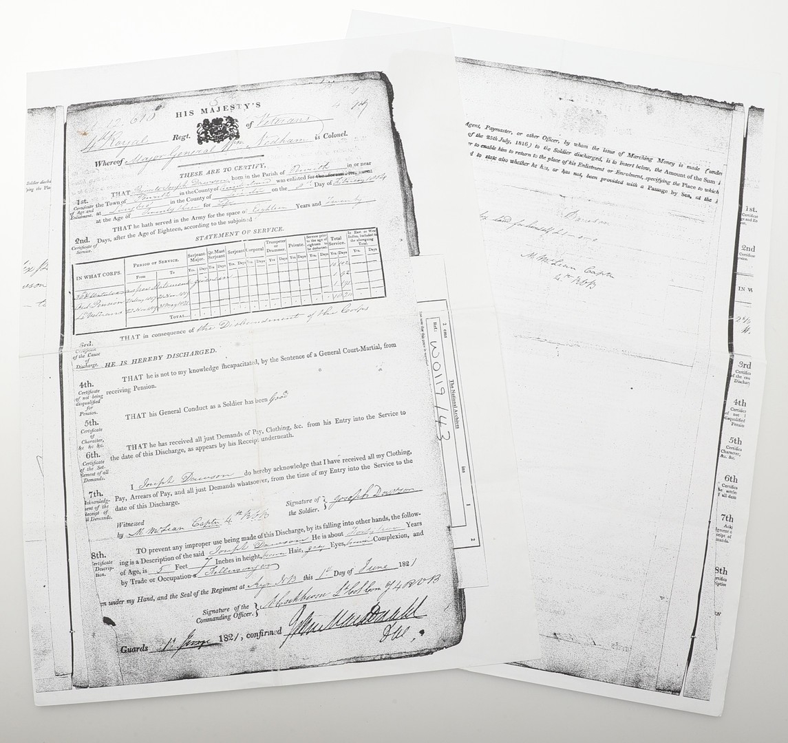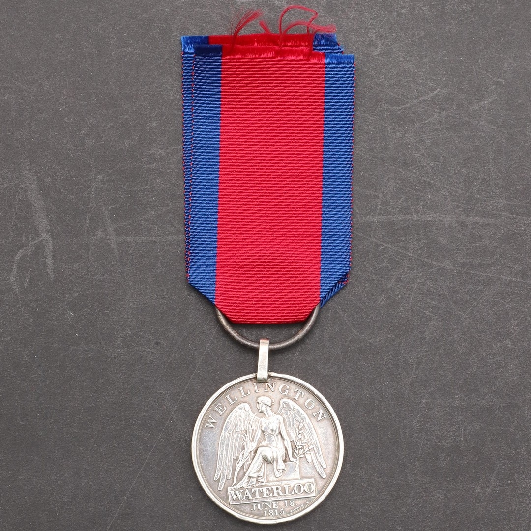 A WATERLOO MEDAL, 1815 TO THE 30TH REGIMENT OF FOOT. A Waterloo Medal named to Jos. Dawson 2nd Batt. 30th Reg. Foot. On a replaced clip type suspension and large ring. Joseph Dawson from Penwith enlisted at Loughborough at the age of 23 on the 8th February 1804. He is recorded with Captain James Skerrows Company of The 30th (Cambridgeshire ) Regiment of Foot. The 30th had a strength of 615 men of whom 57 were killed 195 wounded and 27 more missing. These casualties were suffered whilst repulsing 11 French cavalry charges on their squares. They also played a significant part in stopping the final assault by Napoleons Imperial guard. Dawson was discharged after 18 years and 20 days service on the 1st June 1821. With copied roll and discharge papers.