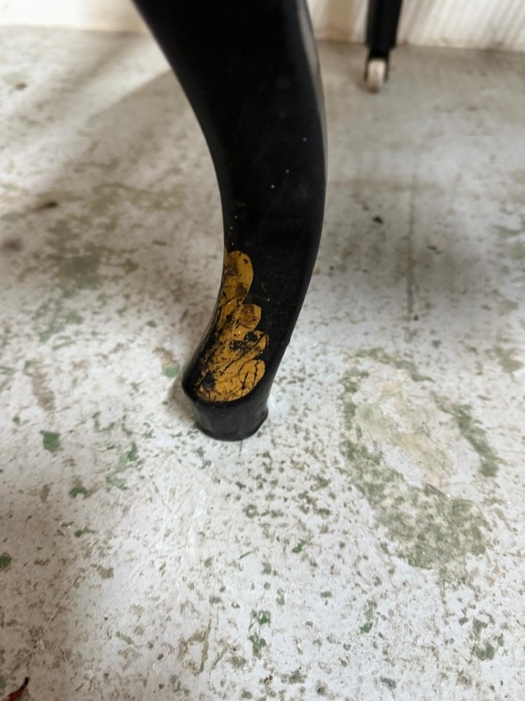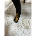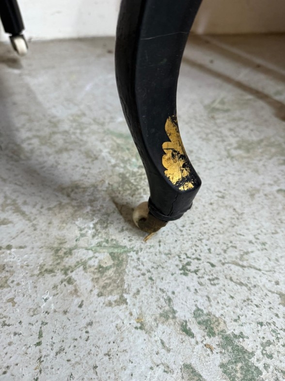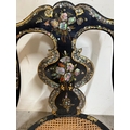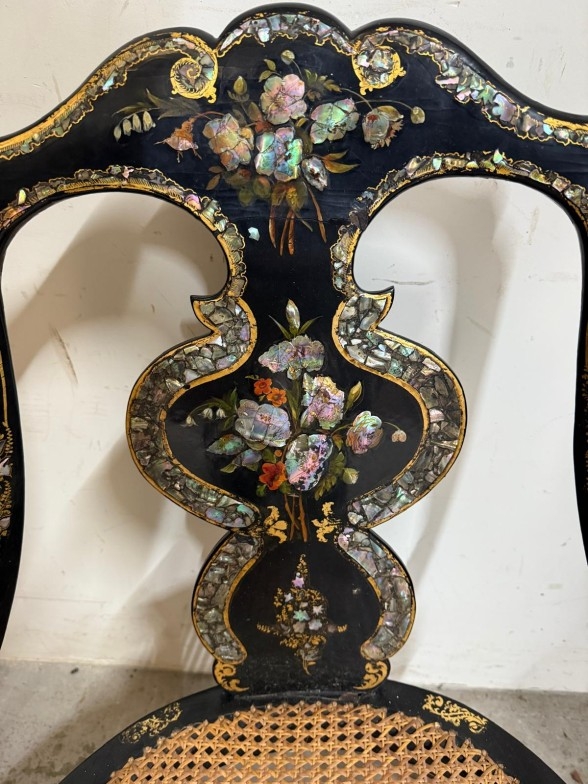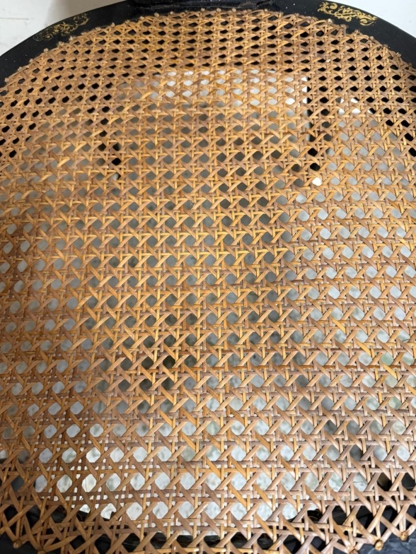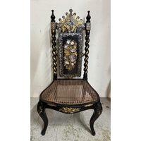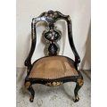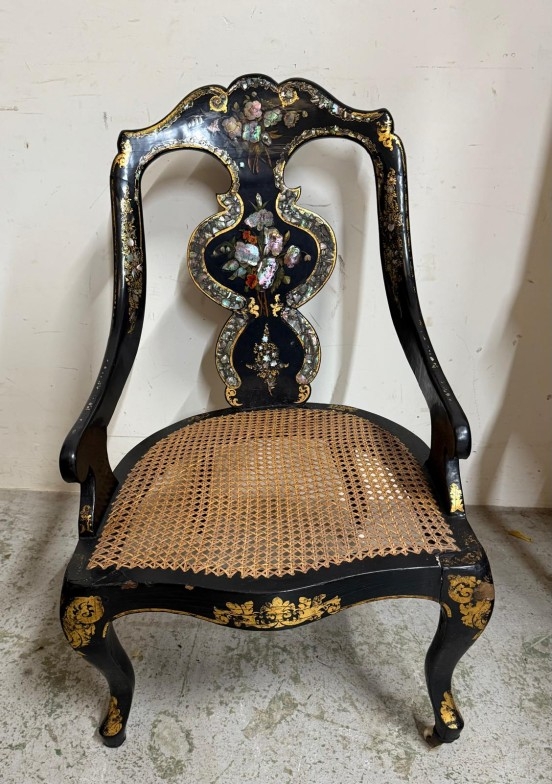 A Mid 19th Century black lacquer open arm chair with mother-of-pearl inlay, gilt foliate decoration and wicker seat AF