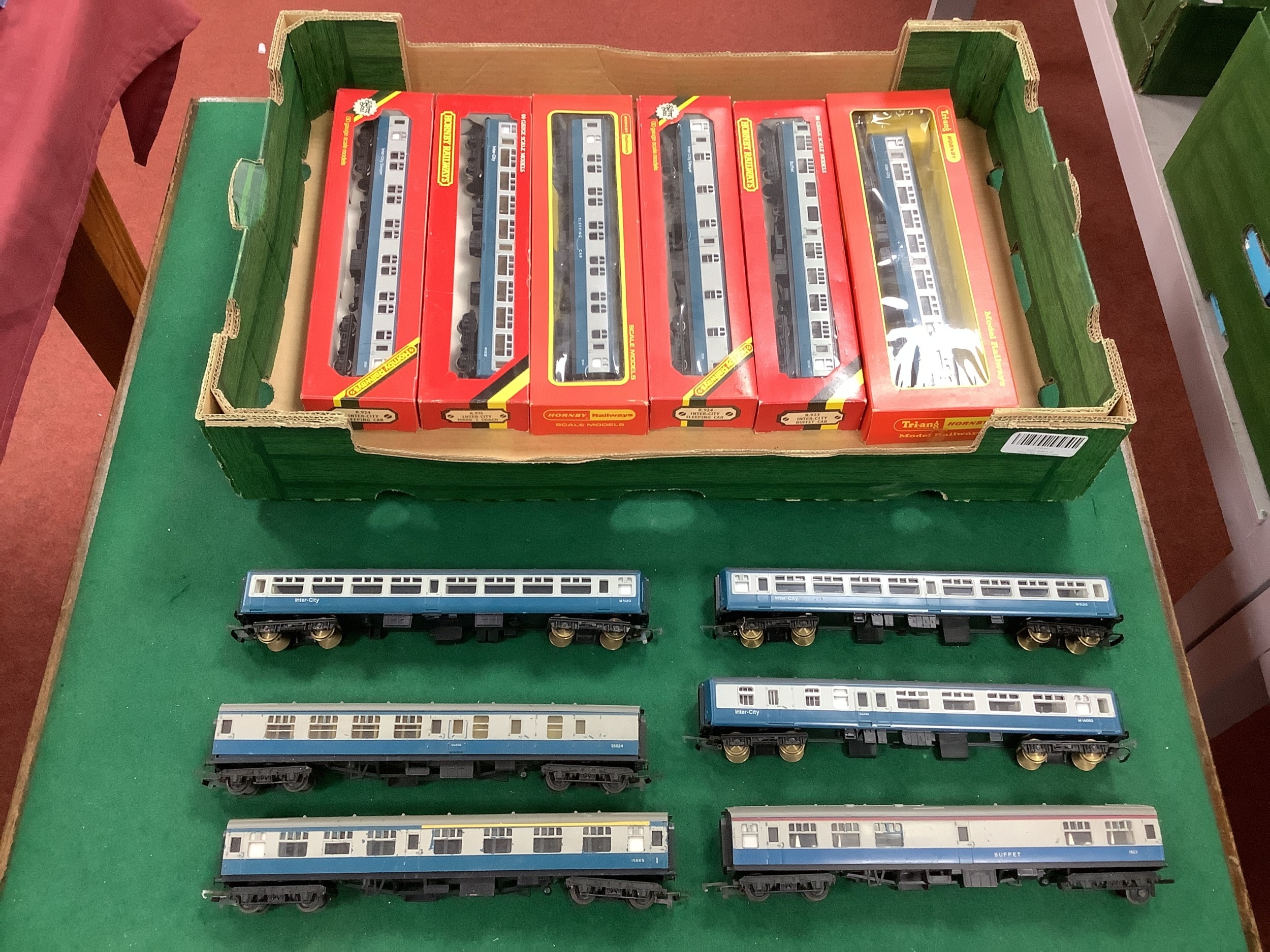 Twelve 00 gauge BR Blue Grey coaches by Triang and Hornby, six boxed including three Sleeper Cars, playworn.