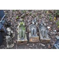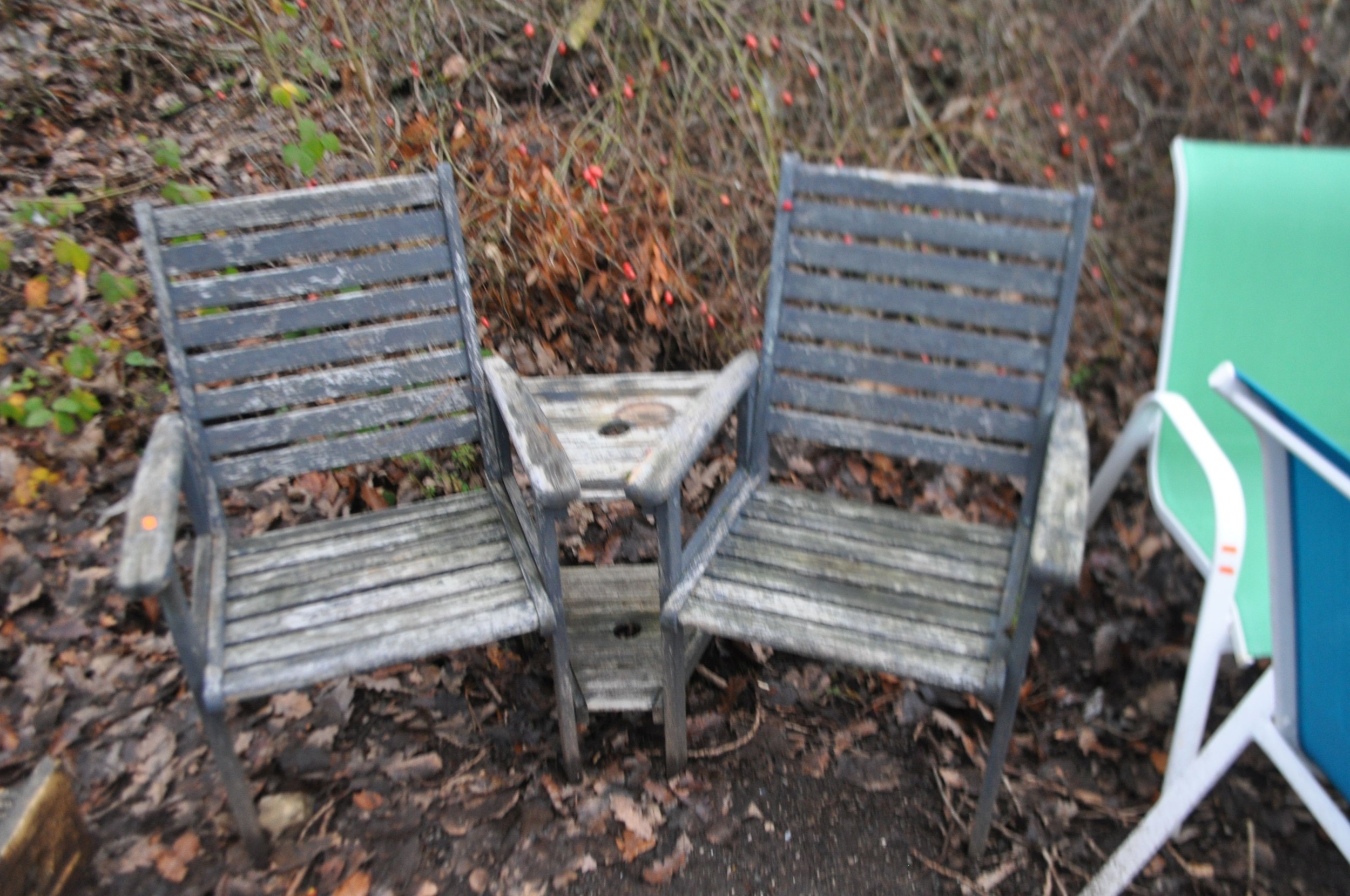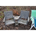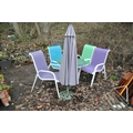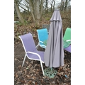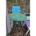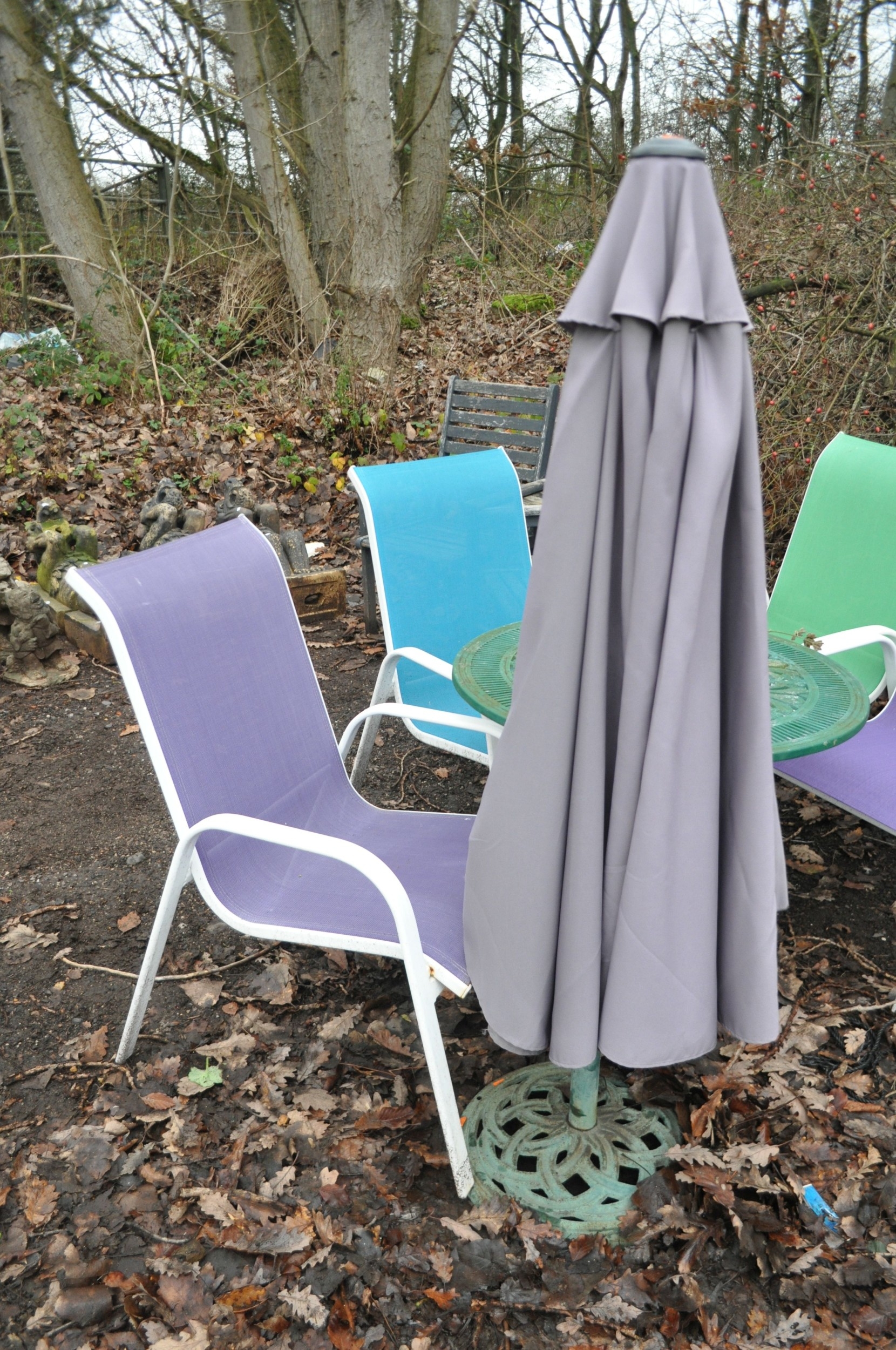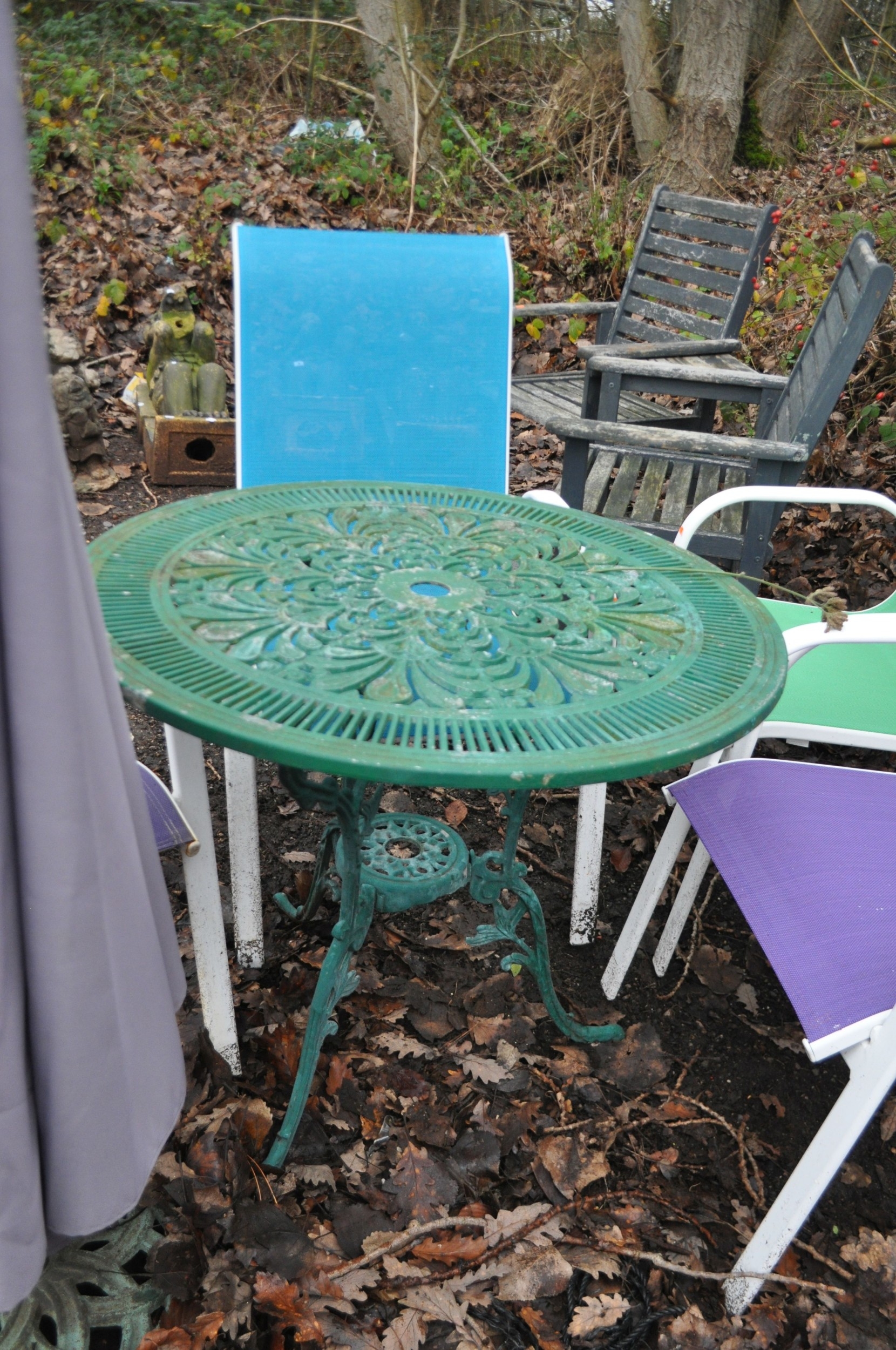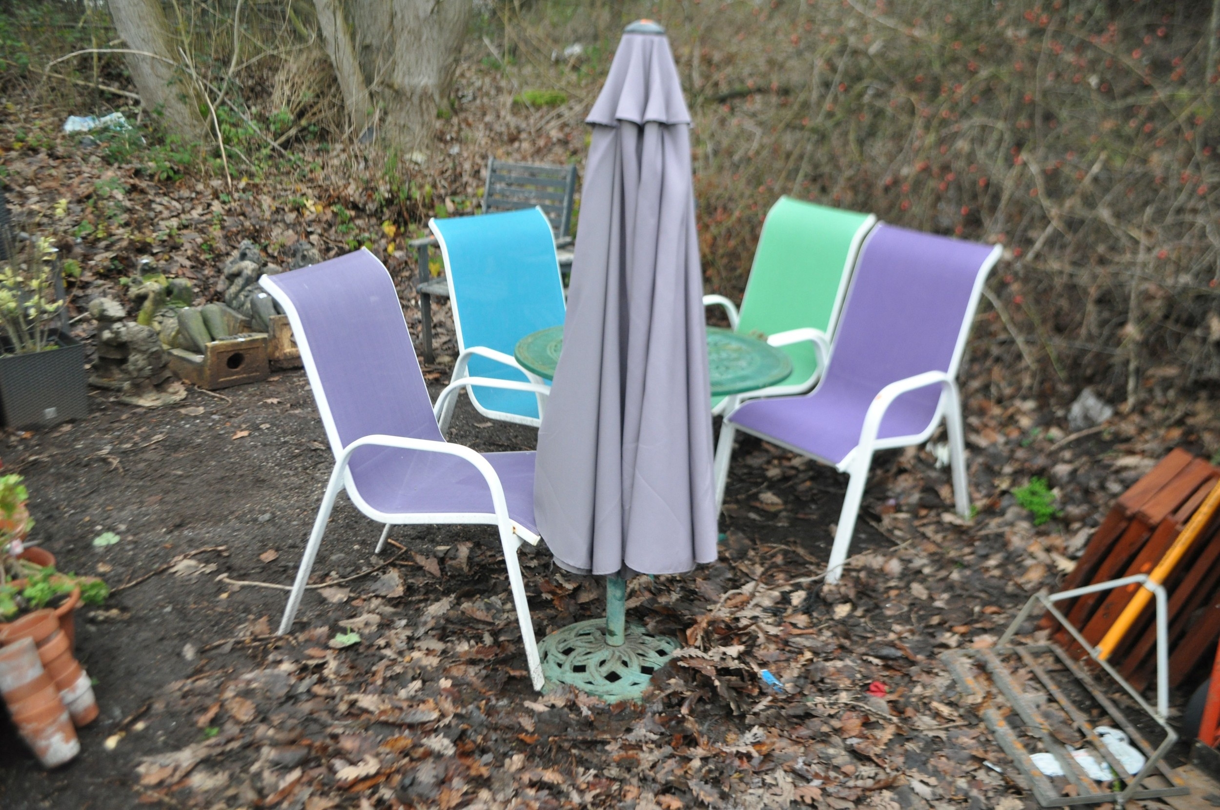 A CAST ALUMINIUM GARDEN TABLE 80cm in diameter with four metal framed chairs with fabric seats, a cast iron parasol case and parasol and an angled garden bench with two chairs either side of a central shelf (8)